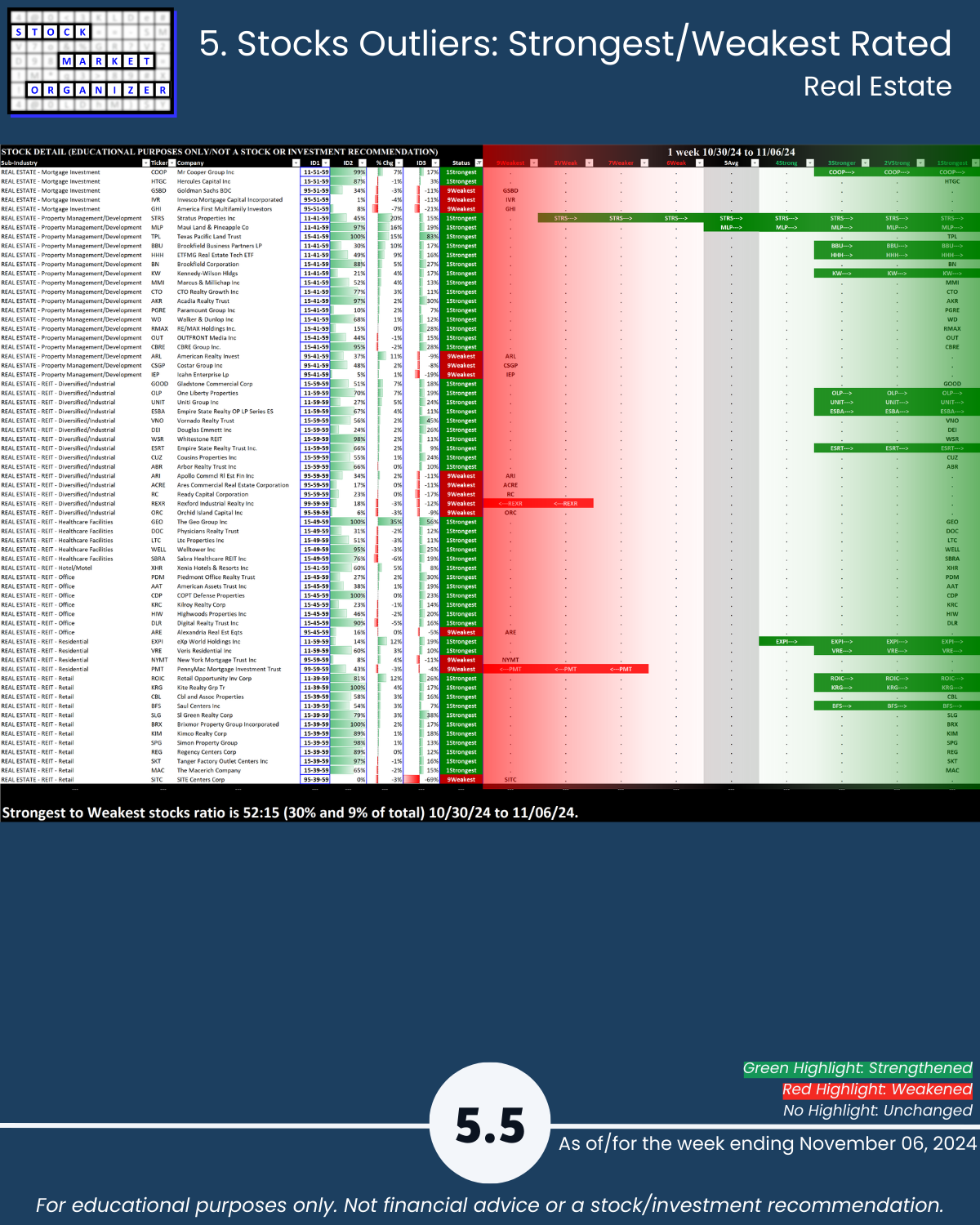 Meanwhile, the two relevant sector ETFs (XLF/Financials and XLRE/Real Estate) weakened for the week ending yesterday but not enough to change strength rating.