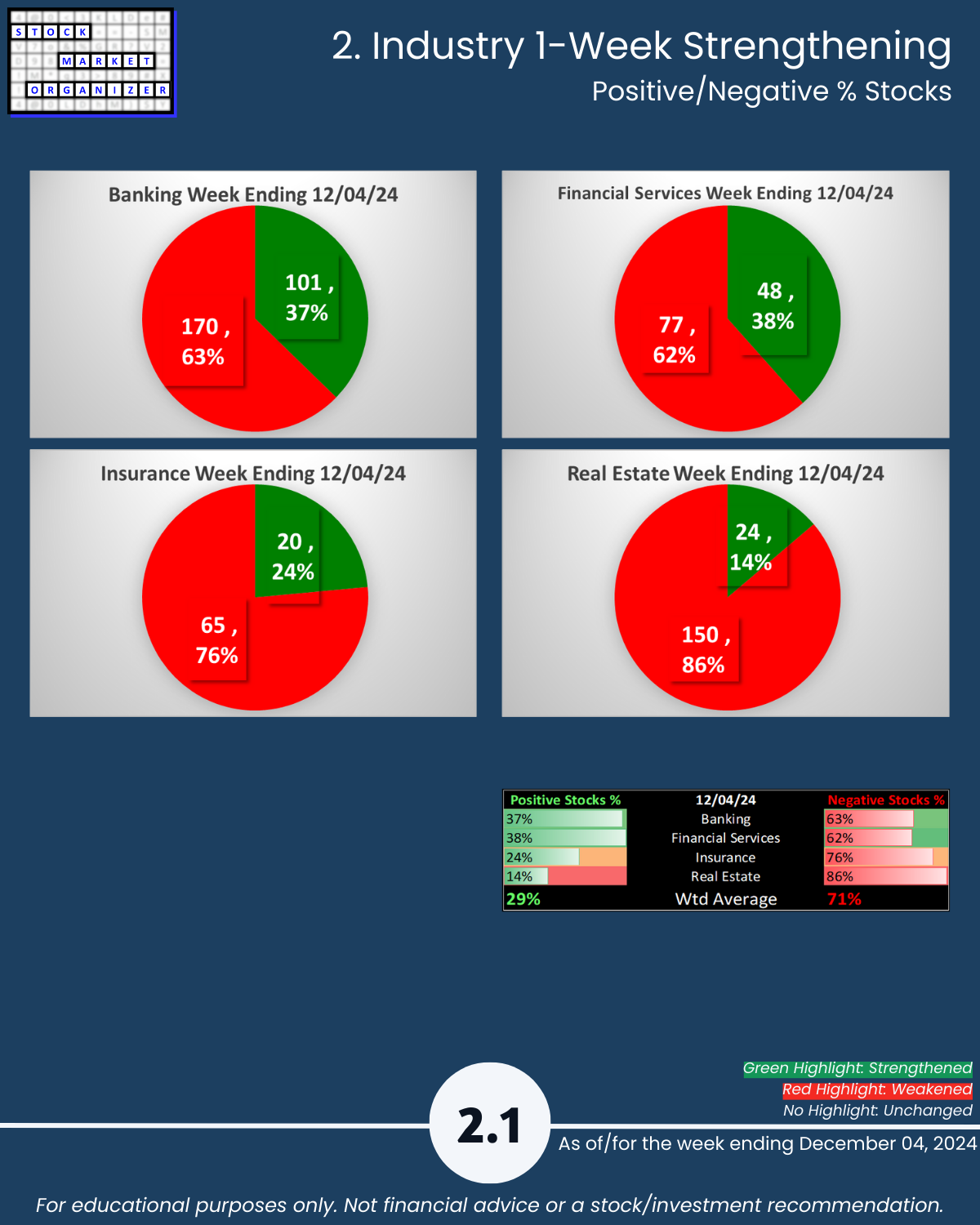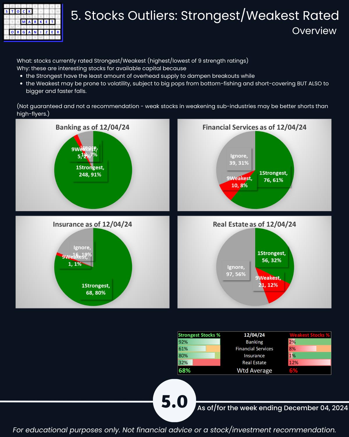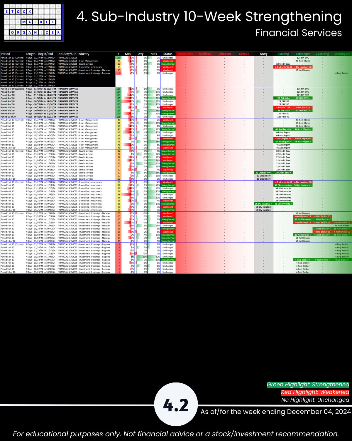 Financial Sector slightly weakened to a 2.9 composite score this week. Banking leads at 2VeryStrong, followed by Financial Services and Insurance at 3Stronger. Real Estate remains the sector's laggard with a 4Strong rating. The weakening was slight and 2.9 is a strong score.