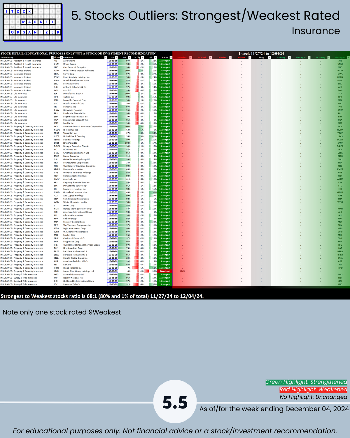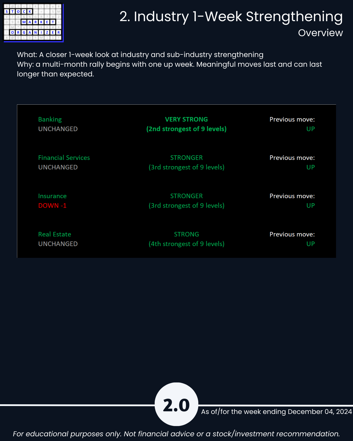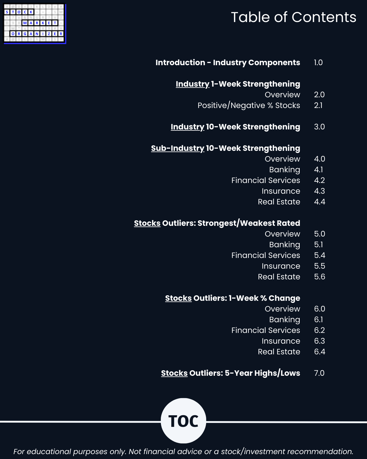 Financial Sector slightly weakened to a 2.9 composite score this week. Banking leads at 2VeryStrong, followed by Financial Services and Insurance at 3Stronger. Real Estate remains the sector's laggard with a 4Strong rating. The weakening was slight and 2.9 is a strong score.
