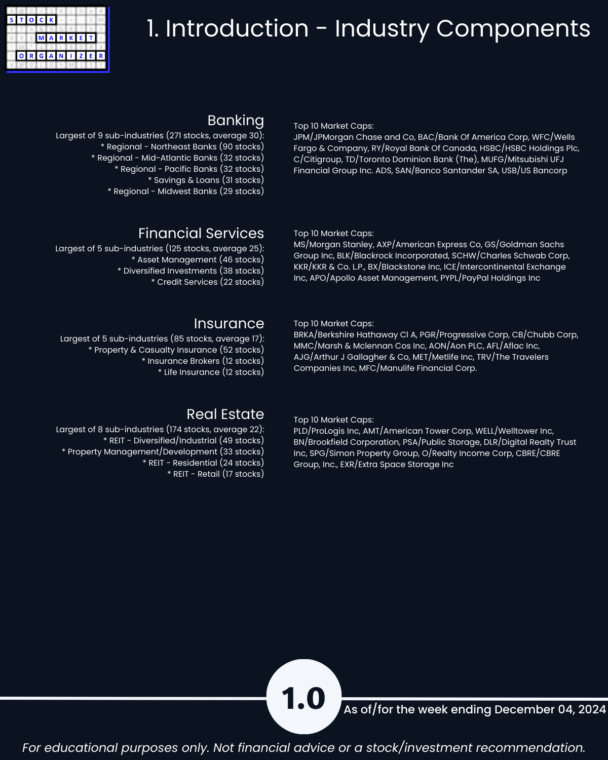 There is a Financials ETF (symbol XLF) which is separate from the Real Estate ETF (symbol XLRE). The Financials sector in this analysis includes Real Estate with Banking, Financial Services, and Insurance.