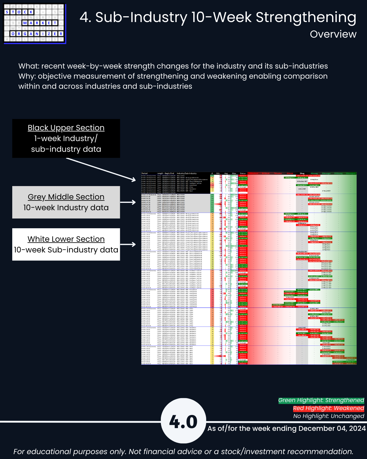 Details are below shown in a manner not available elsewhere because I created it from scratch to continually answer this question: “Where is there strengthening and weakening in the market at the stock, sub-industry, industry, and sector levels?” Combine this with the top-down Market Strength Score and Sector Risk Gauge to get a key competitive advantage of understanding strength at every level.