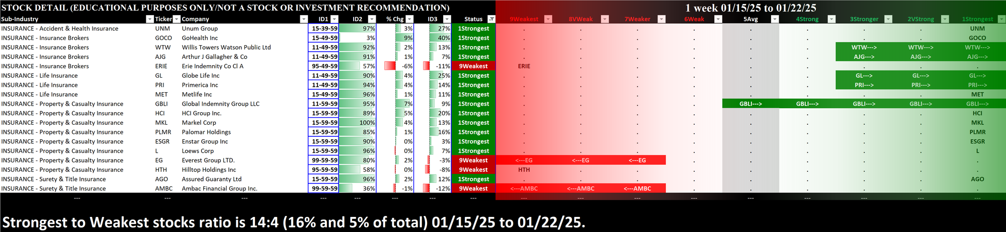 The Financial sector weakened this week, falling by -0.5 points to a 5.1 overall rating. If at all interested in positions in this sector, it is better to go where there is strength/strengthening - as reflected by price. This Stock Market Organizer methodology explicitly reveals this.