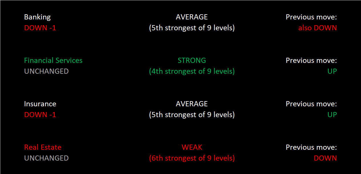 Financial Services is leading at 4Strong, strengthening but not enough to change rating. Banking and Insurance both weakened one rating, falling to 5Average. Real Estate strengthened but not enough to change rating, staying put at 6Weak and remaining the sector's laggard.