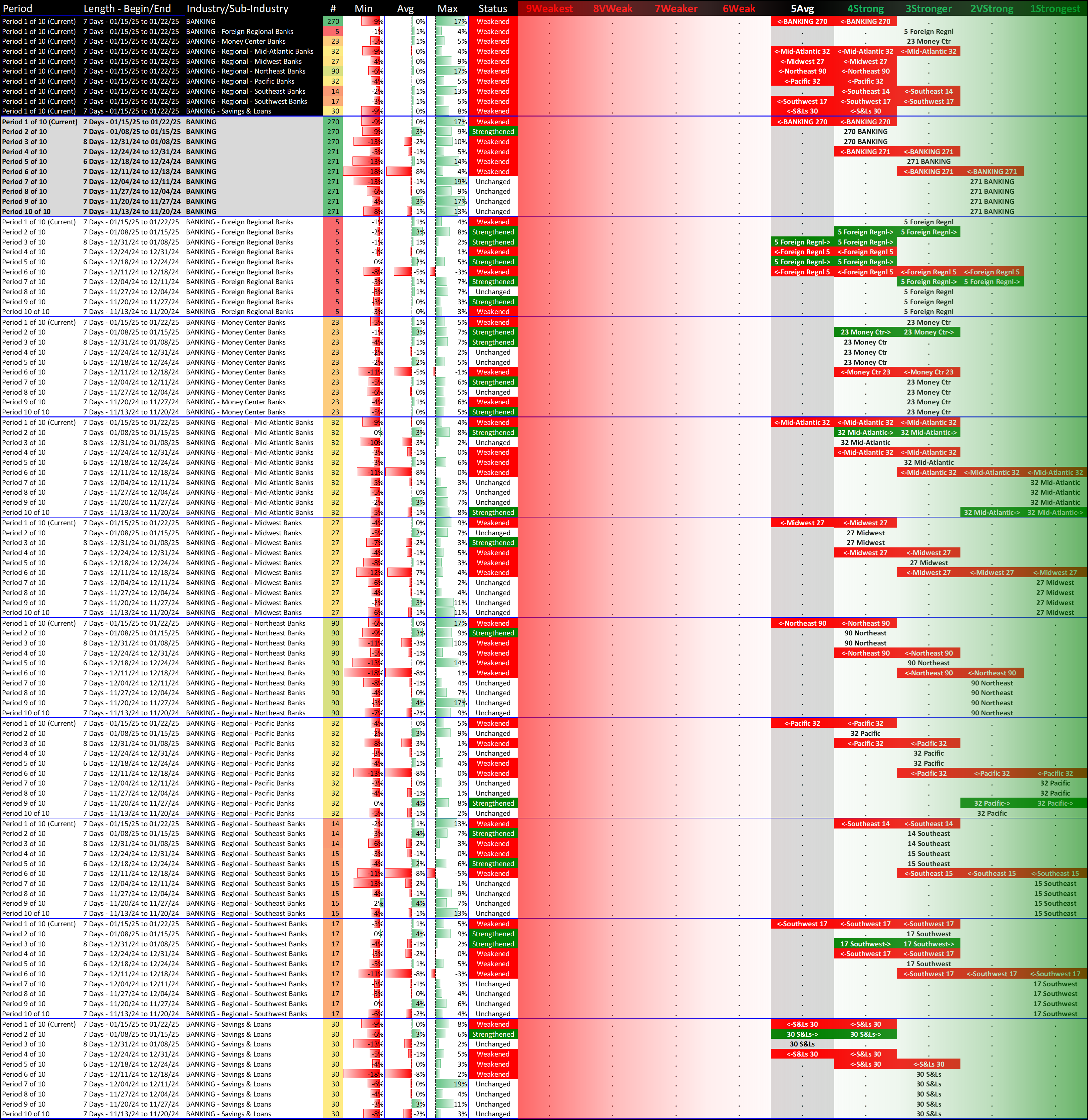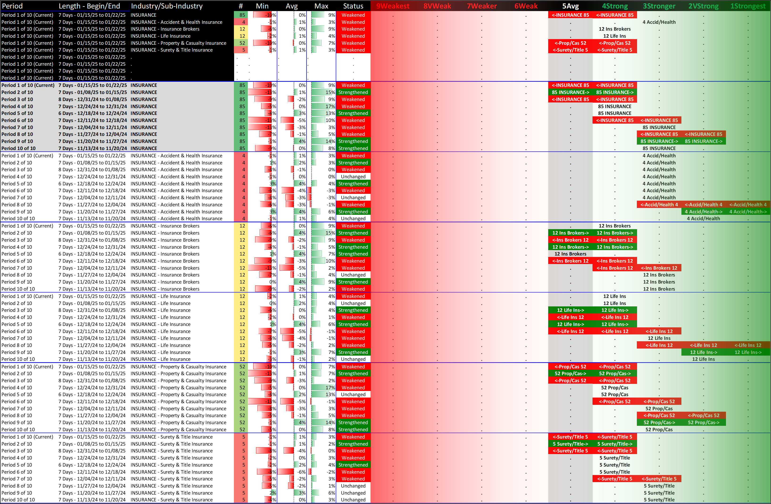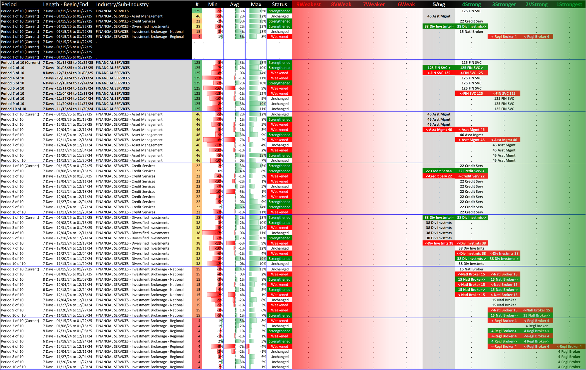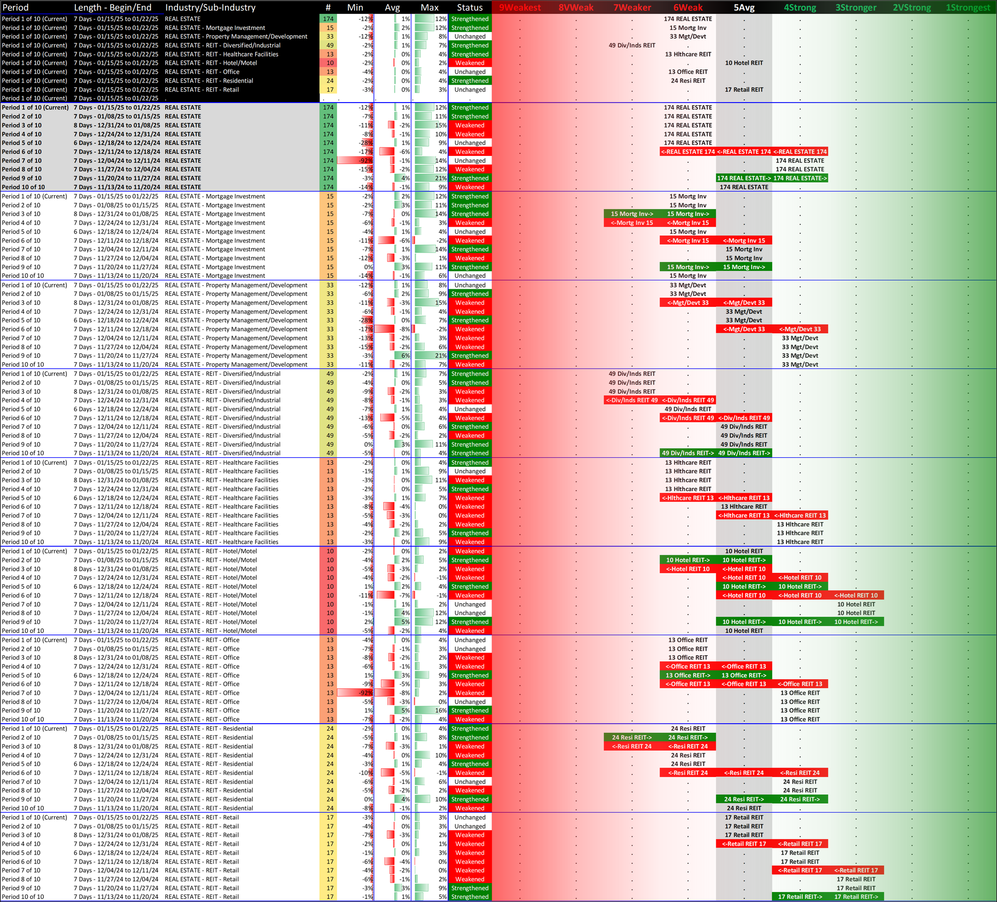 What: recent week-by-week strength changes for the industry and its sub-industries