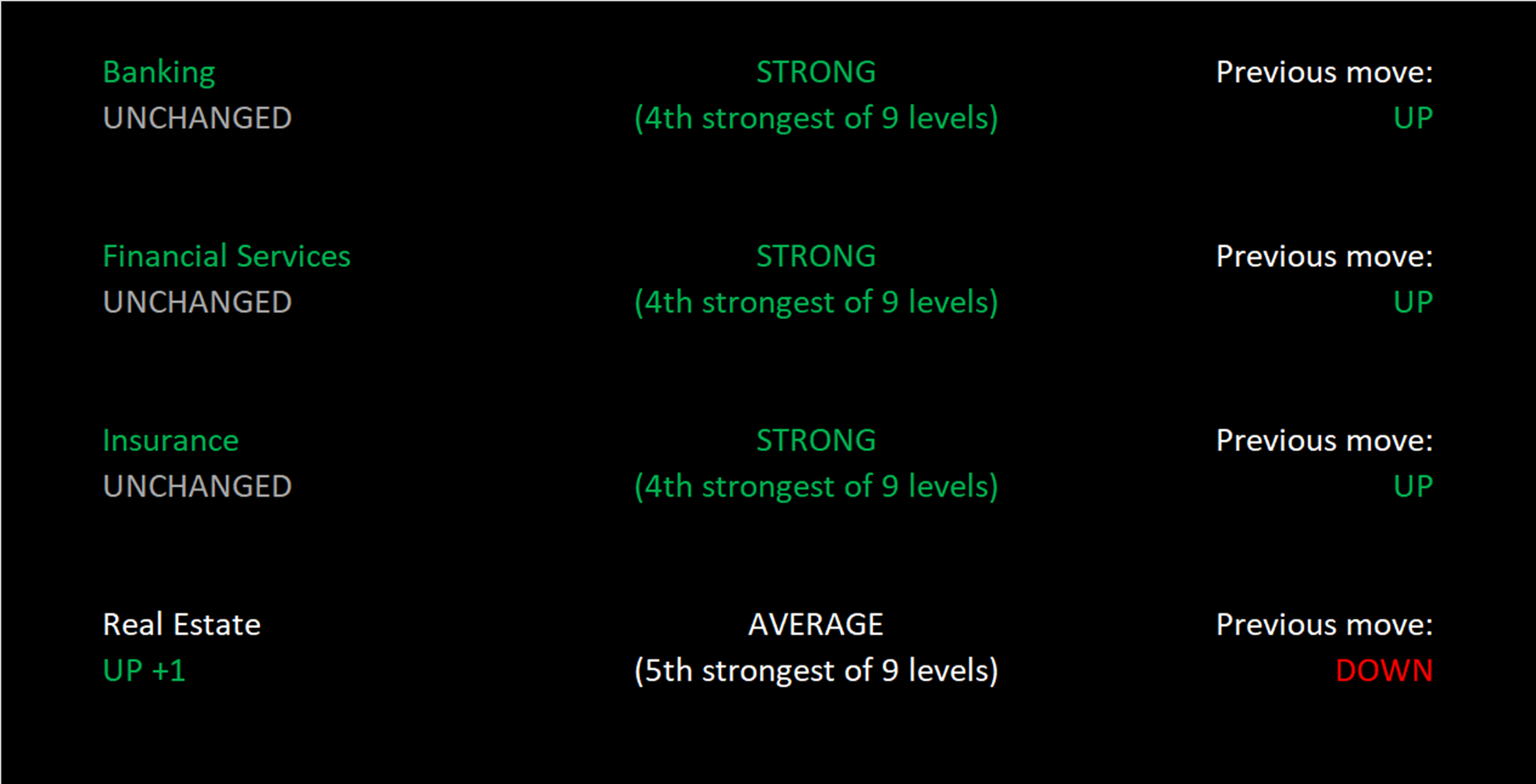 Banking, Financial Services, and Insurance are leading at 4Strong. Real Estate strengthened enough to change rating but remains the sector's laggard at 5Average.
