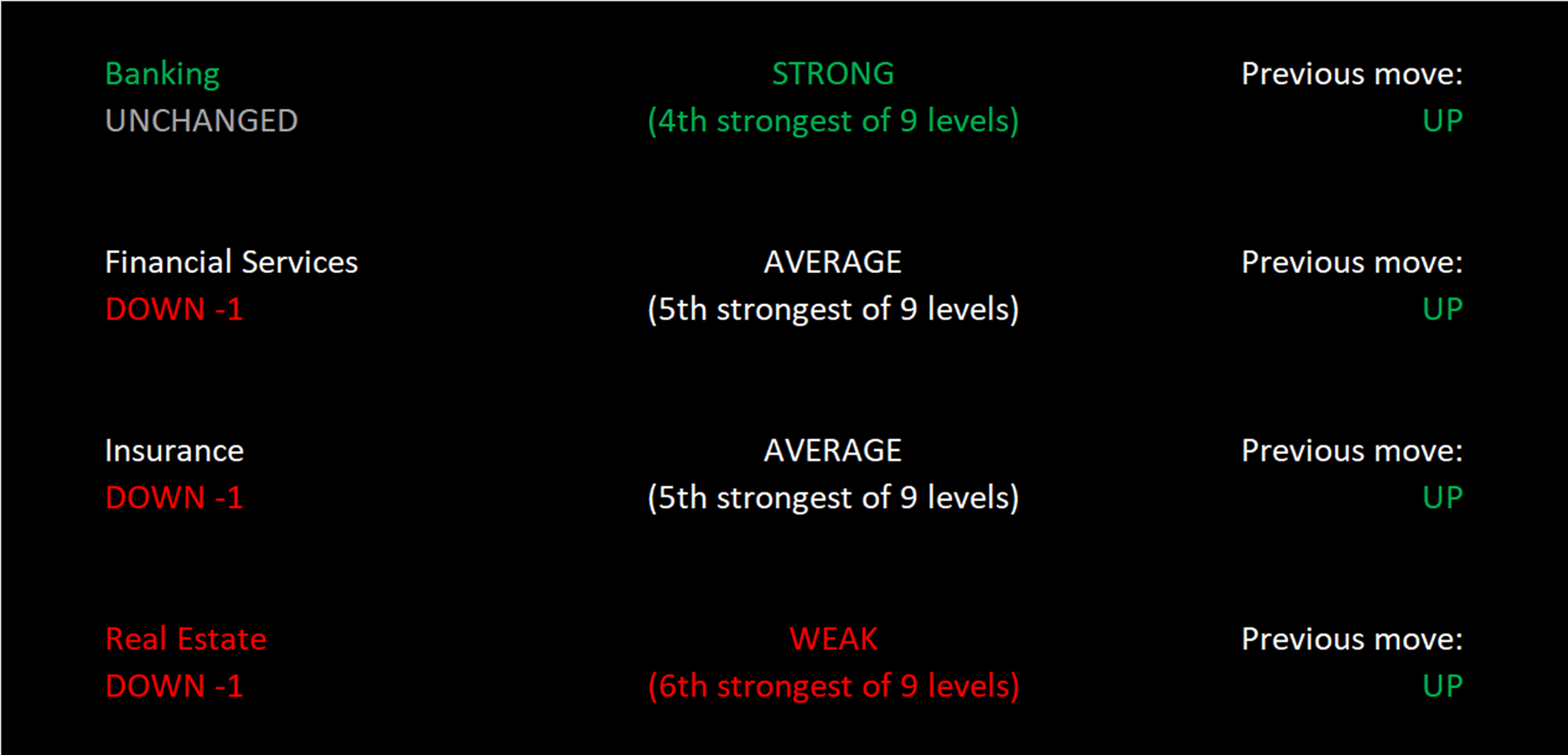 Banking leads at 4Strong. Real Estate weakened enough to change rating to 6Weak and remains the sector's laggard.