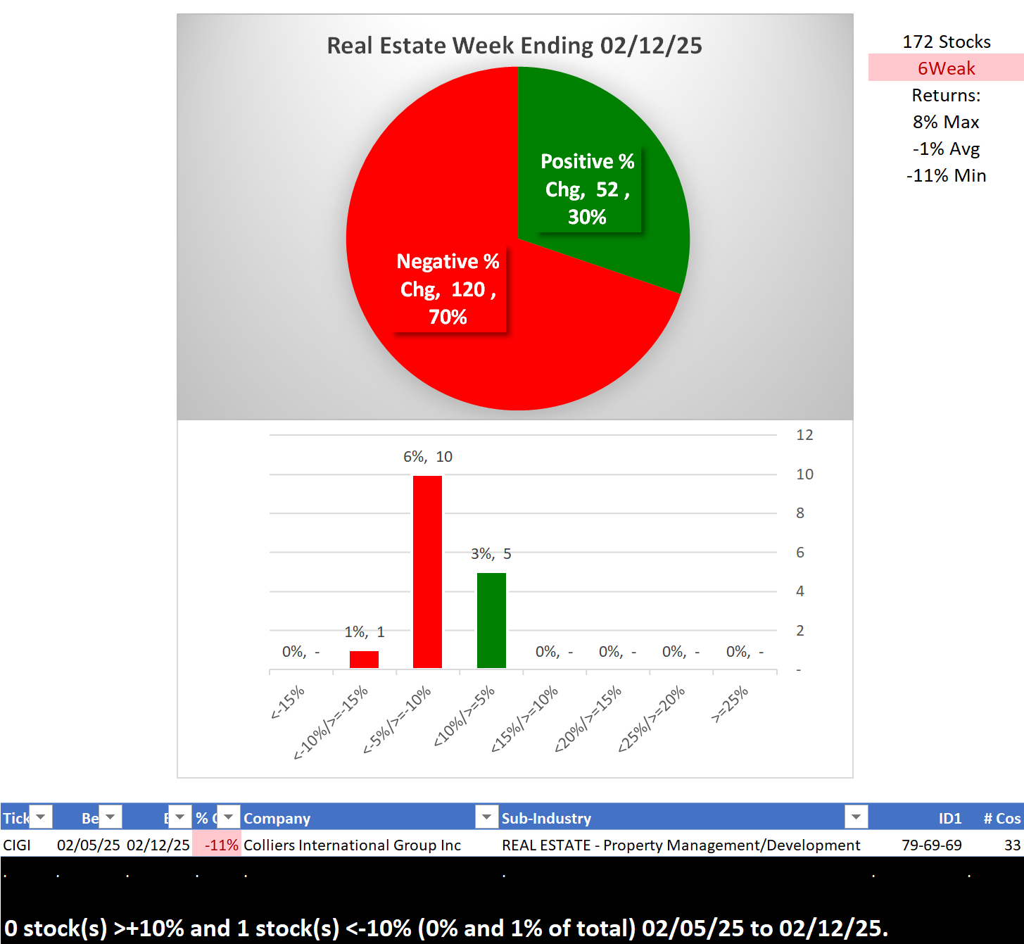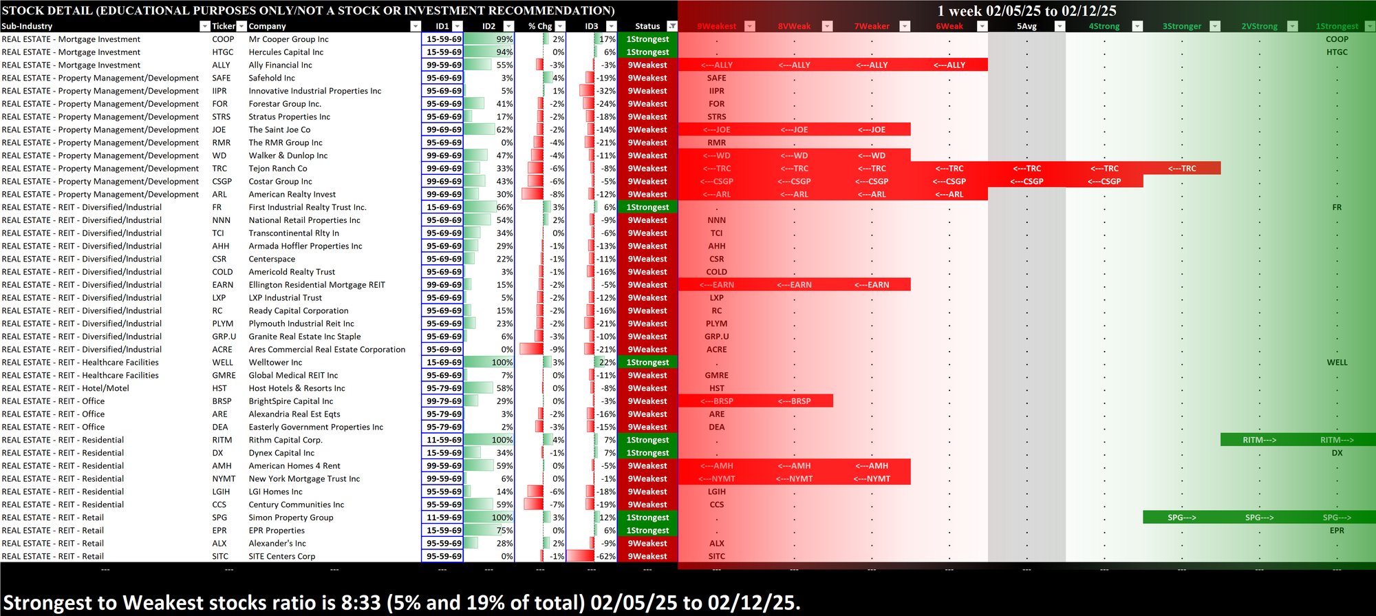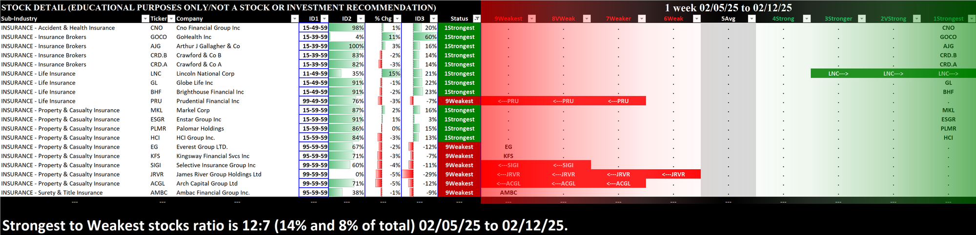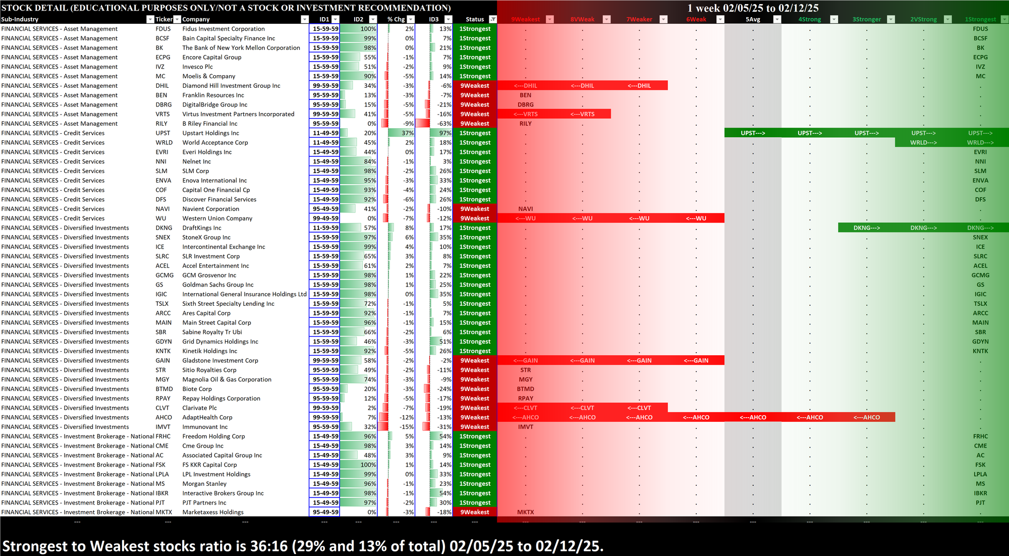 The Financial sector weakened this week, falling by -0.6 points to a 4.9 overall rating. If at all interested in positions in this sector, it is better to go where there is strength/strengthening - as reflected by price. This Stock Market Organizer methodology explicitly reveals this.