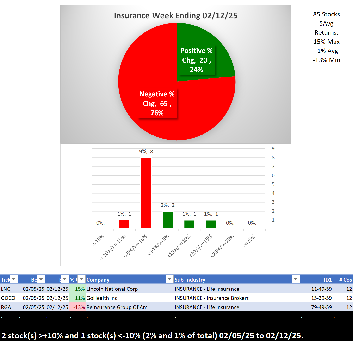 Top 10 Market Caps: BRKA/Berkshire Hathaway Cl A, PGR/Progressive Corp, CB/Chubb Corp, MMC/Marsh & McLennan Cos Inc, AON/Aon PLC, AFL/Aflac Inc, AJG/Arthur J Gallagher & Co, MET/MetLife Inc, TRV/The Travelers Companies Inc, MFC/Manulife Financial Corp.