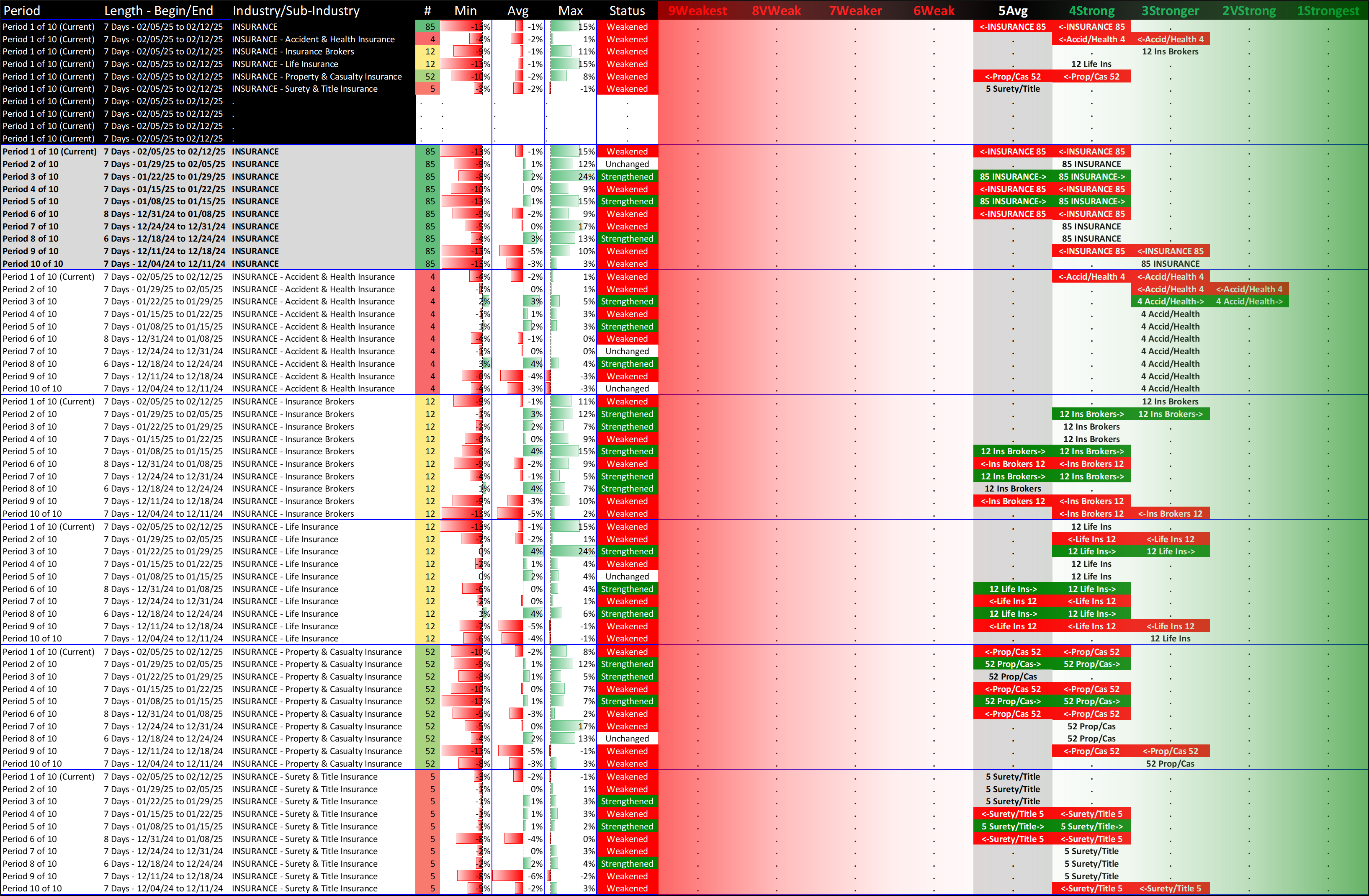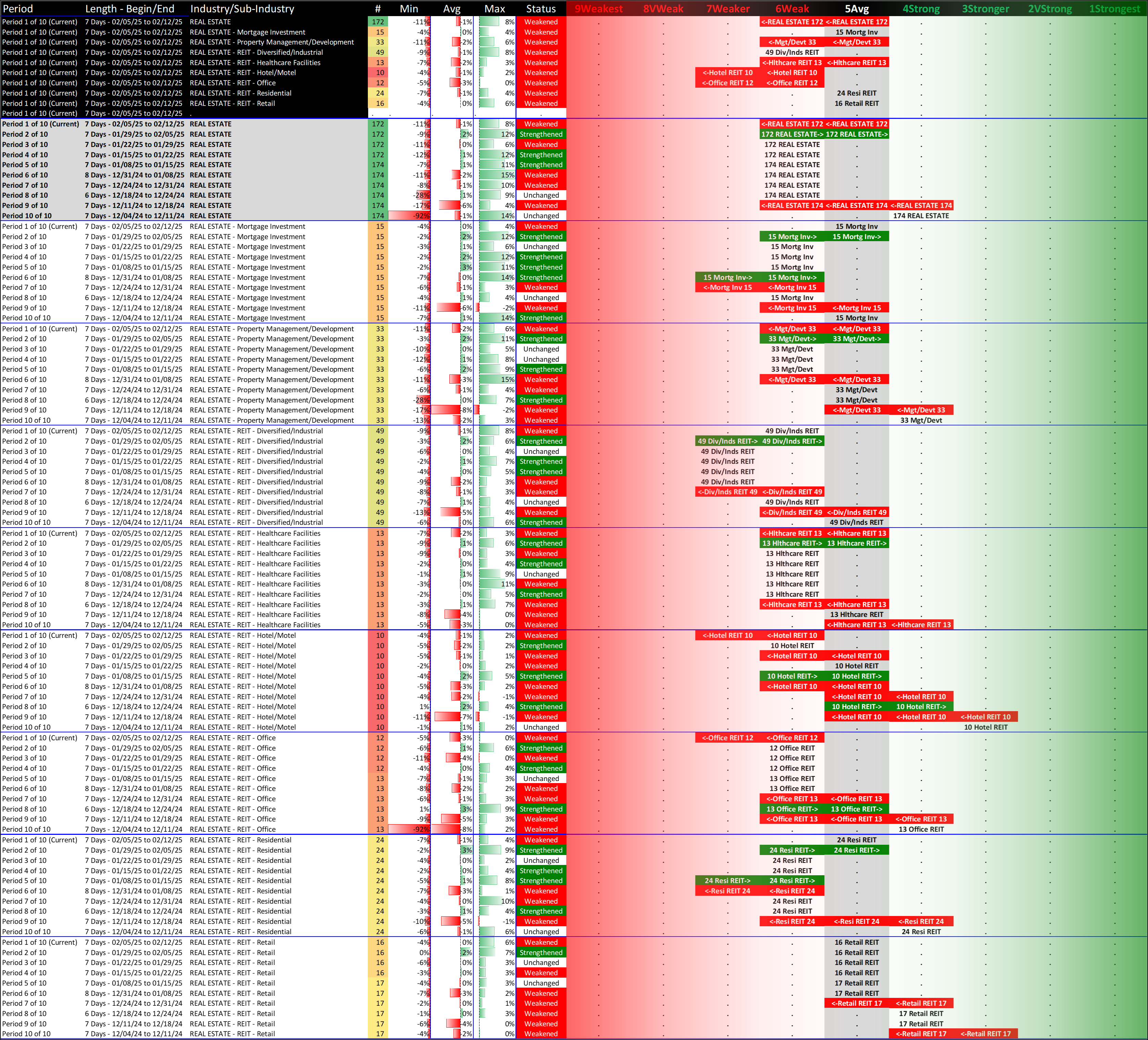What: recent week-by-week strength changes for the industry and its sub-industries