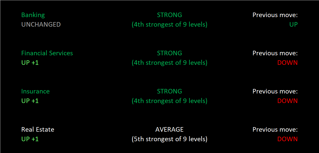 Banking leads at 4Strong, tied with Financial Services and Insurance. Real Estate strengthened enough to change rating to 5Average and remains the sector's laggard.