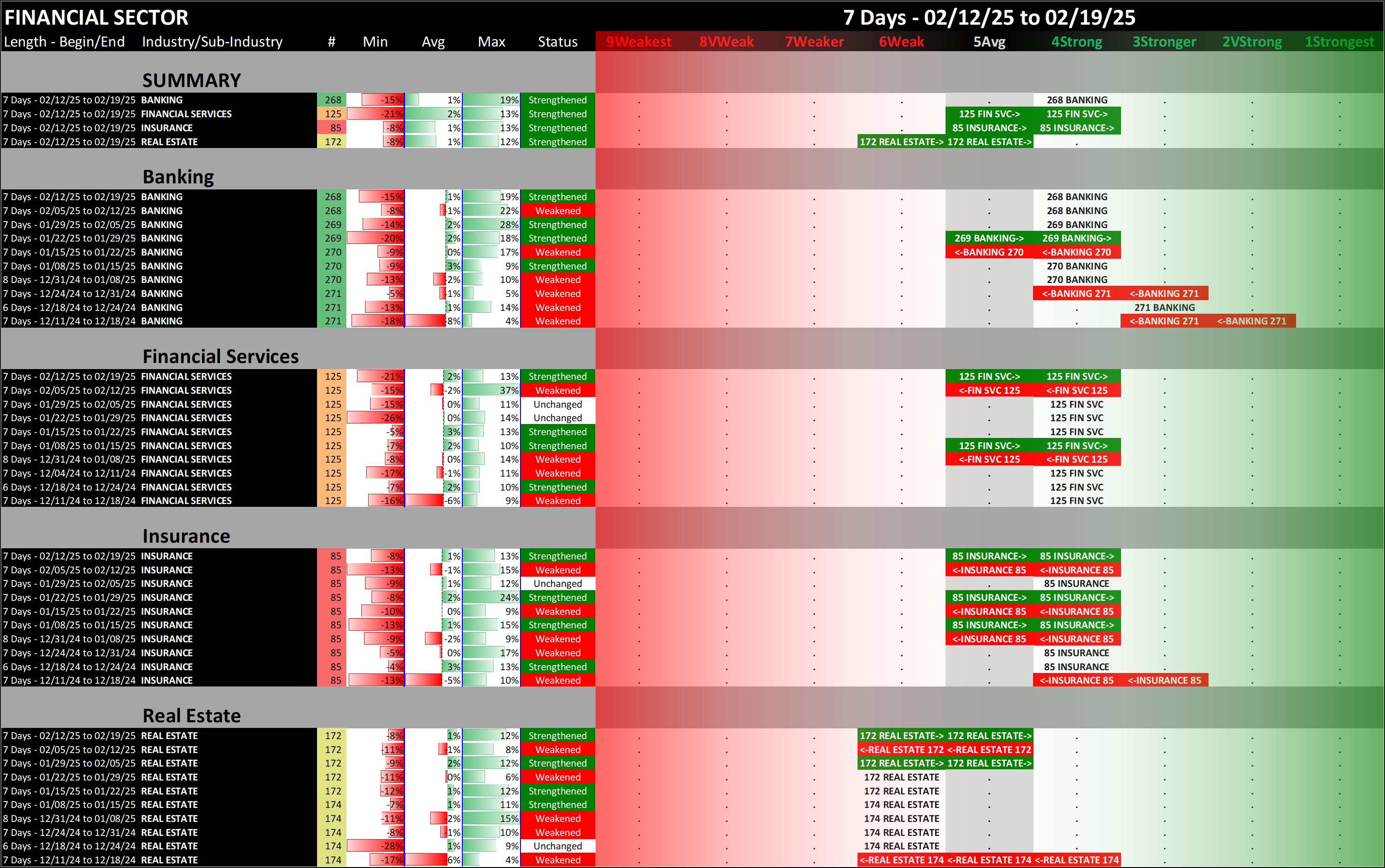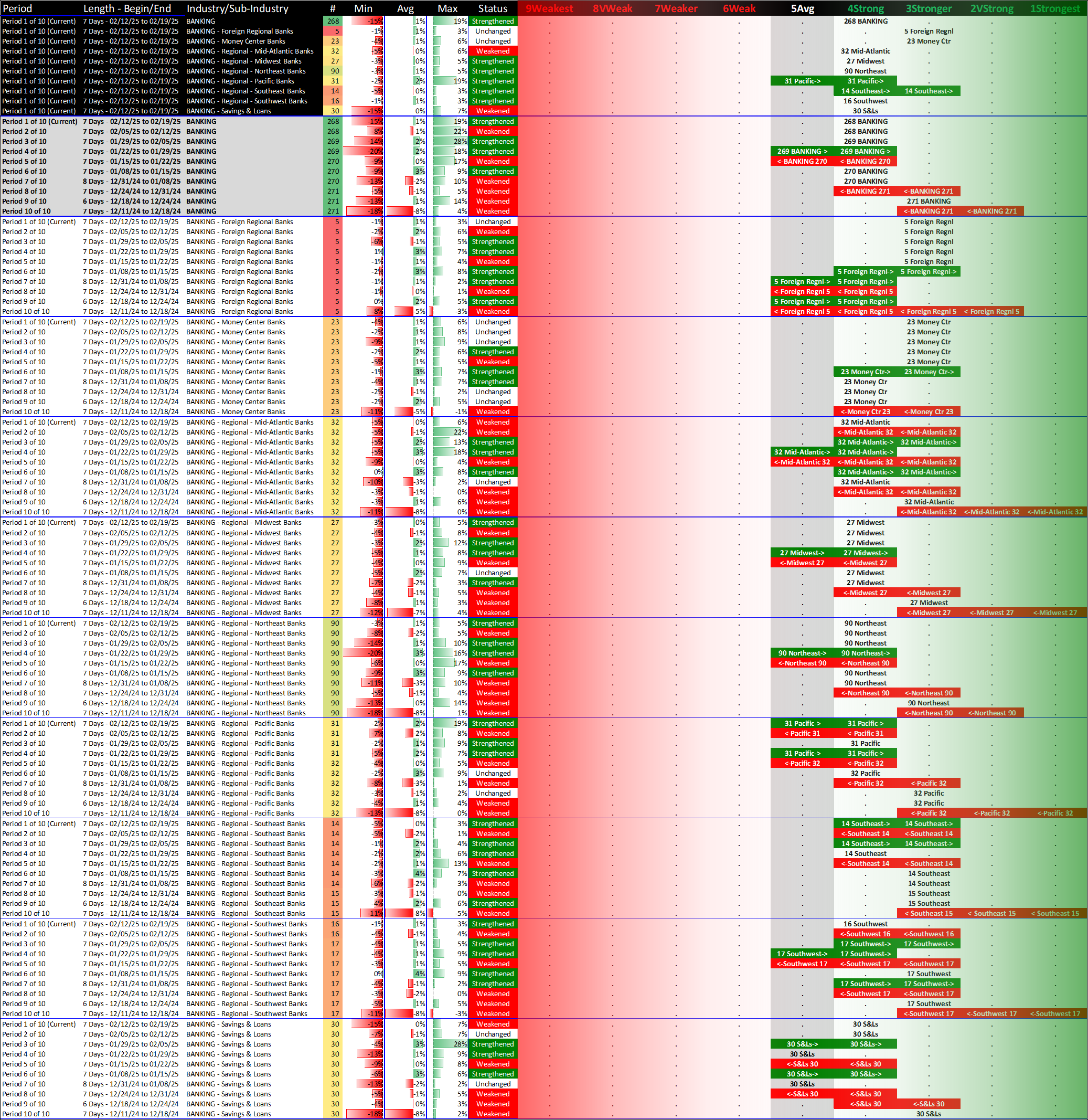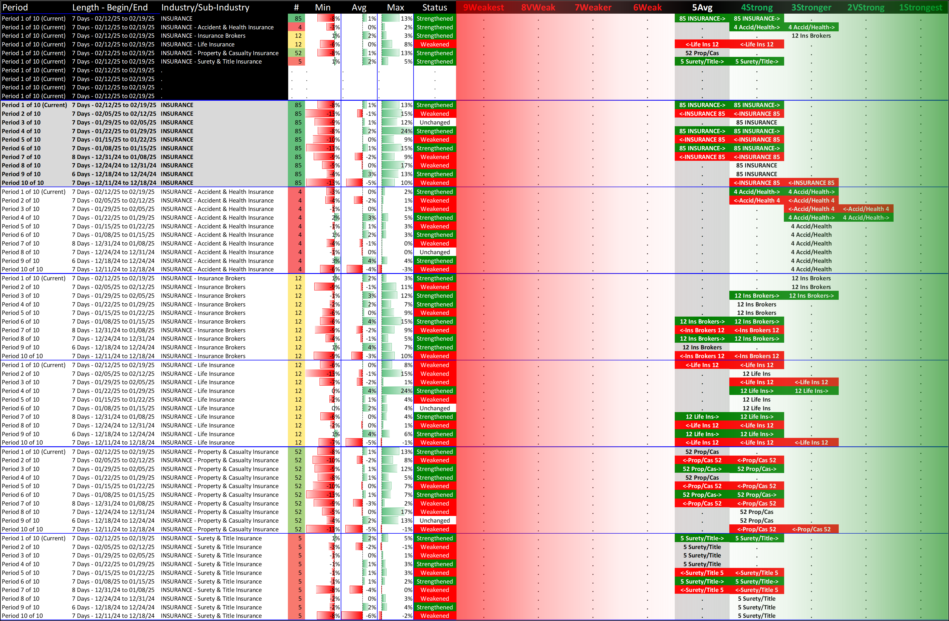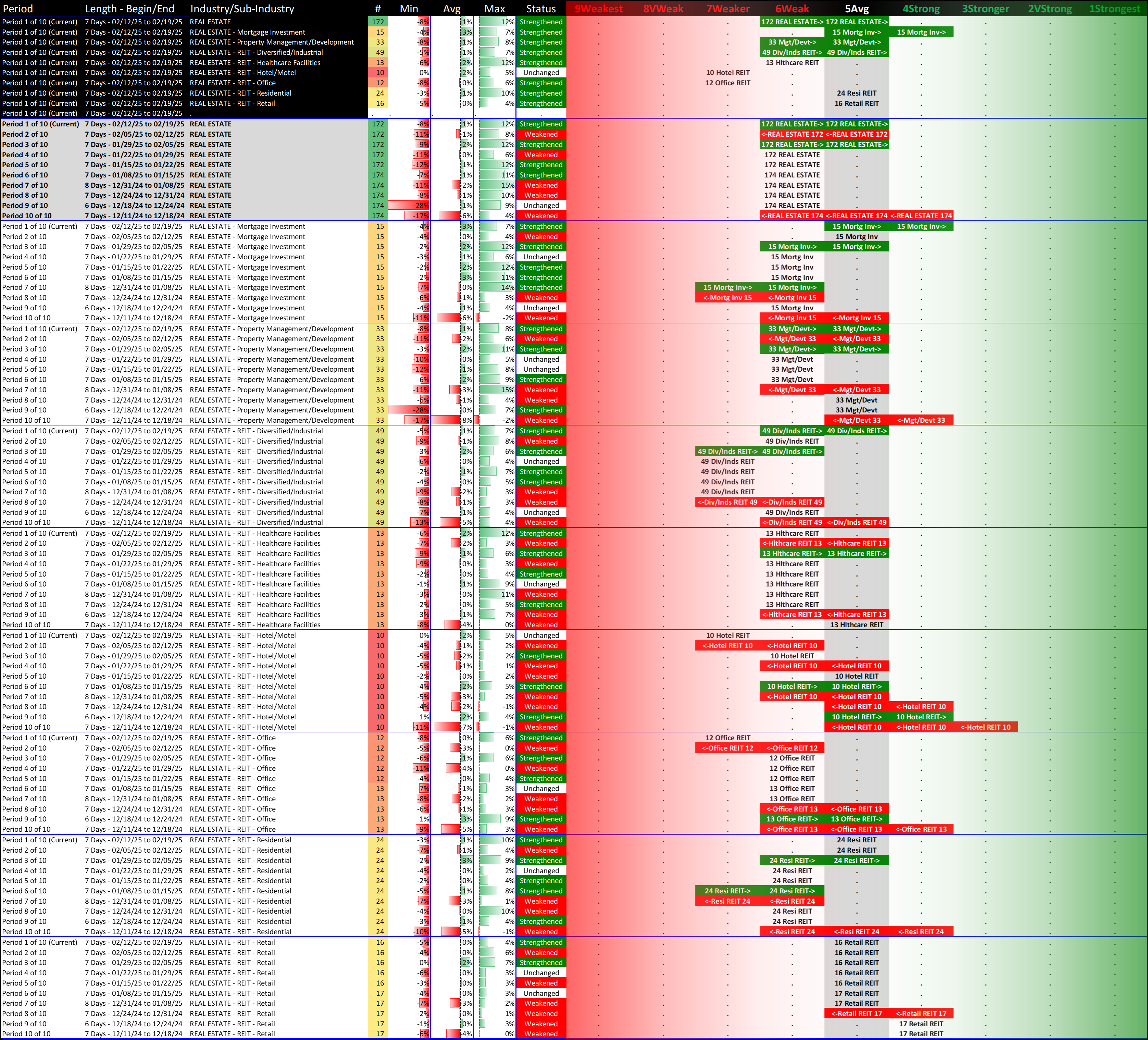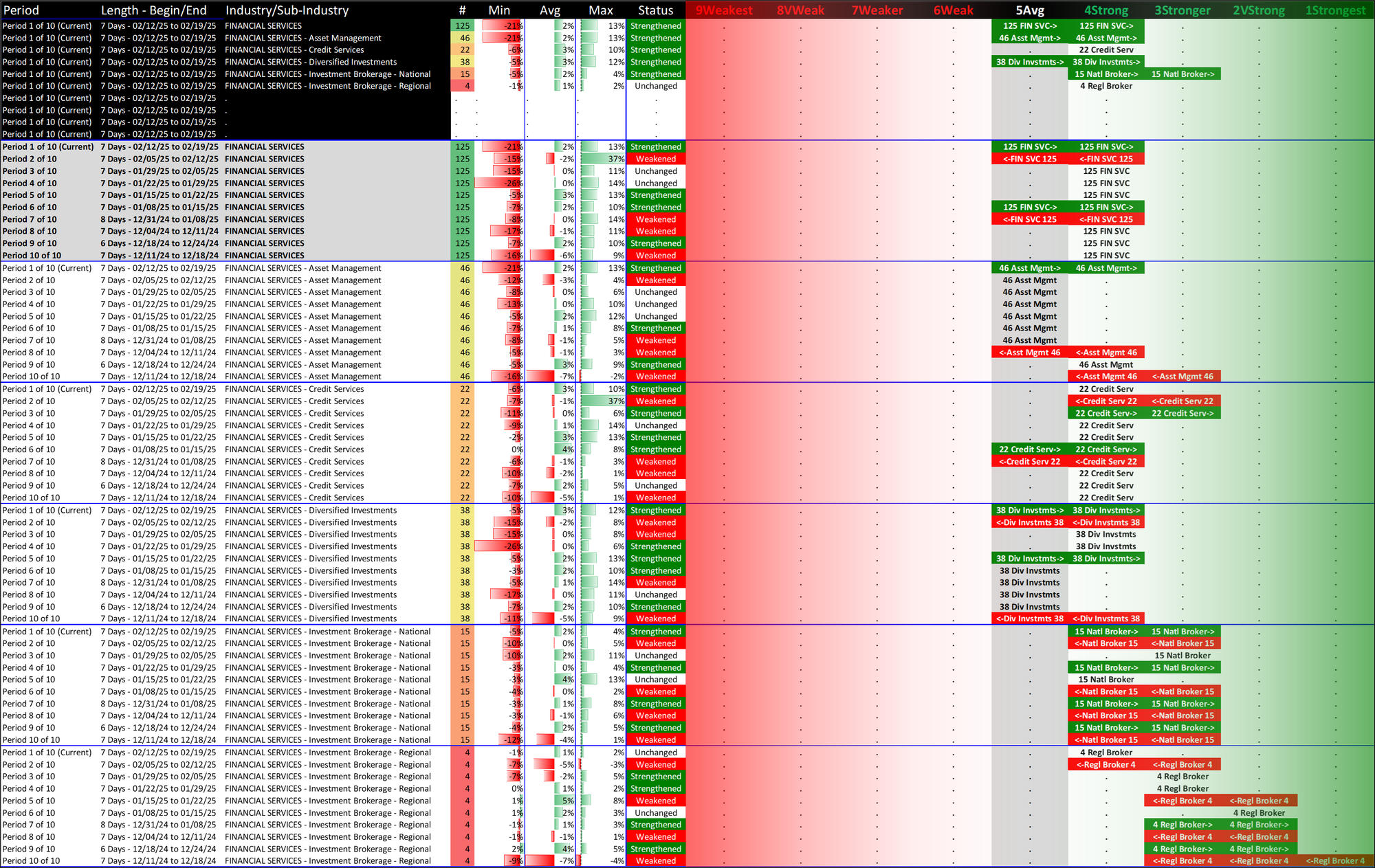 What: recent week-by-week strength changes for the industry and its sub-industries