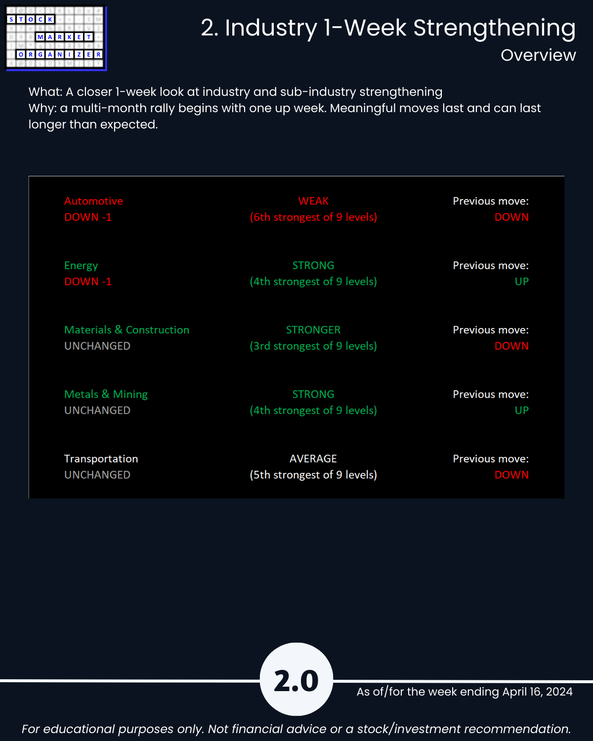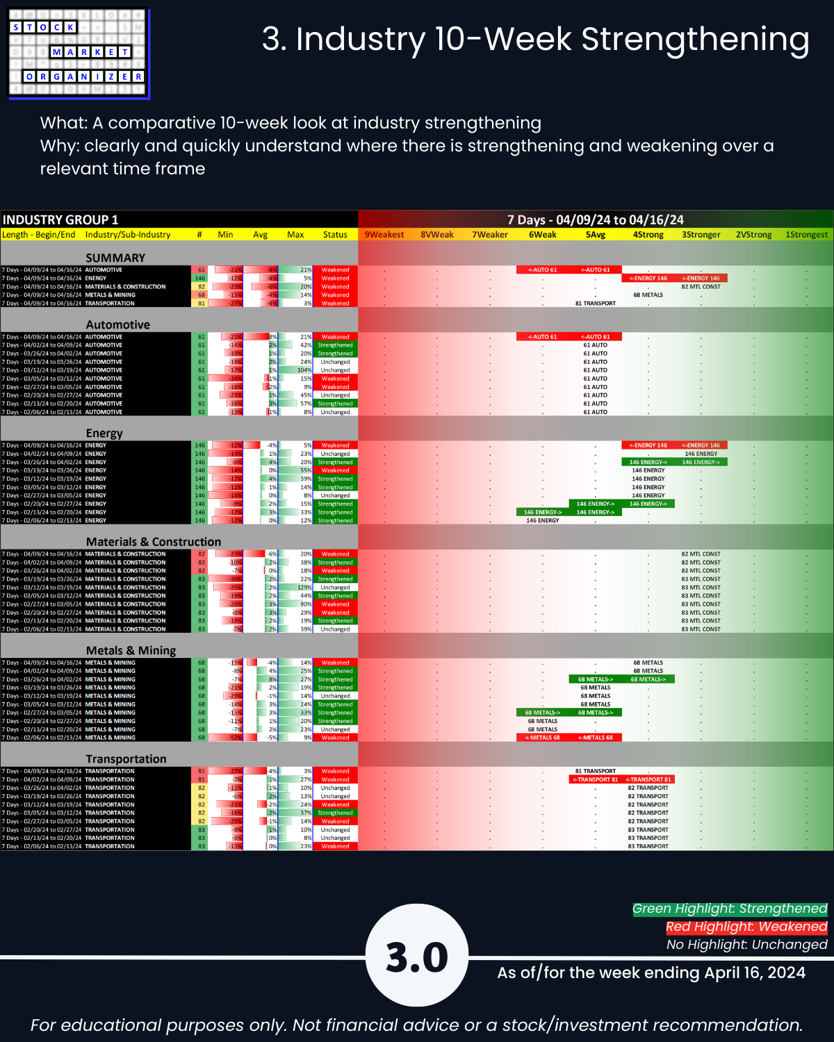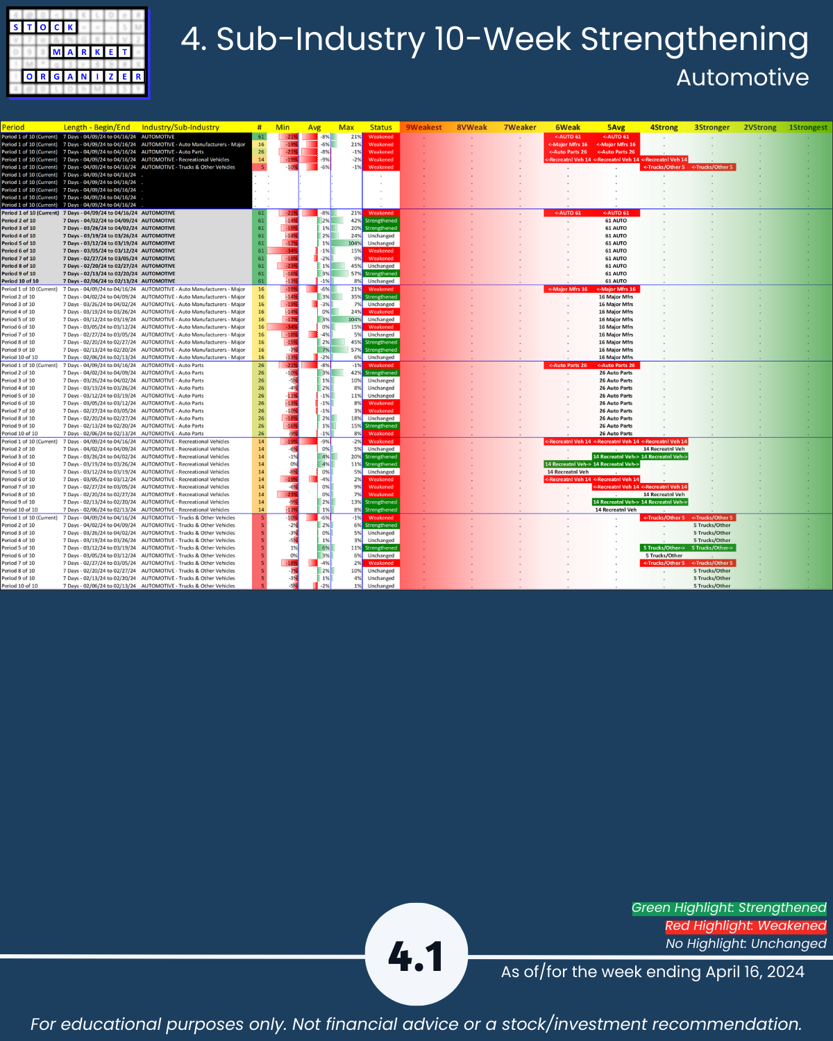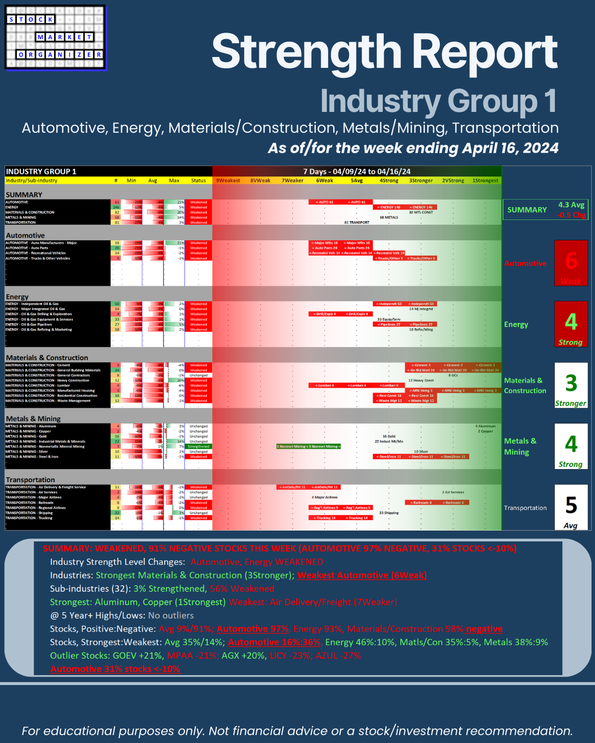 4/16/24 As Utilities yesterday had a bad week, now Automotive has gone splat. Unique U.S. Stock Market strength-based insights into Industry Group 1 = Automotive, Energy, Materials & Construction, Metals & Mining, and Transportation: 🔹 Automotive weakened one rating, all 5 of 5 sub-industries weakened, for the week it had 97% negative stocks as 13% of stocks fell more than -10%, and it has a poor 16%:36% 1Strongest:9Weakest stocks ratio, 🔹 the industry group composite ranking fell 0.5 points to 4.3 and it had 91% negative stocks (Materials & Construction 98%, Energy 93%) 🔹 the group’s 5+ year highs:lows ratio has fallen from 55:12 on 3/19/24 to 4:10 this week.