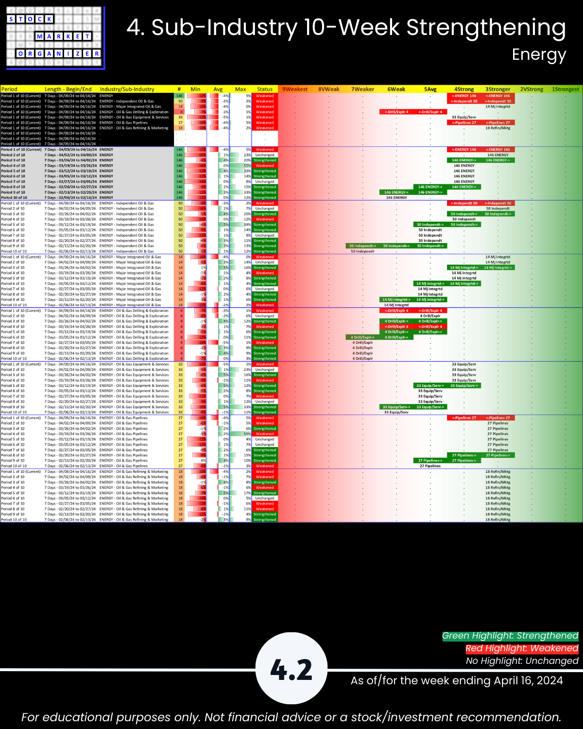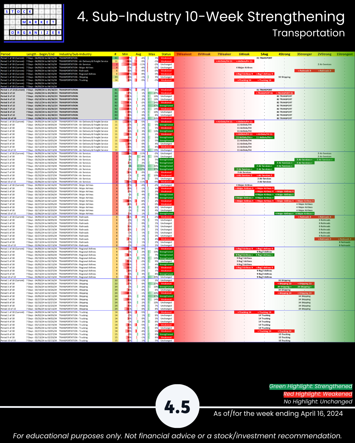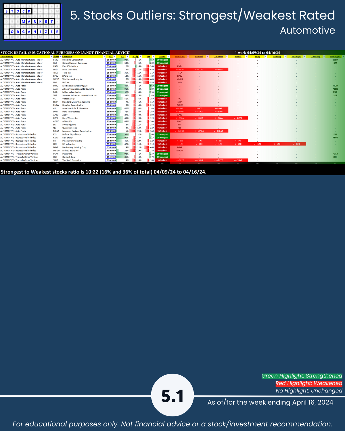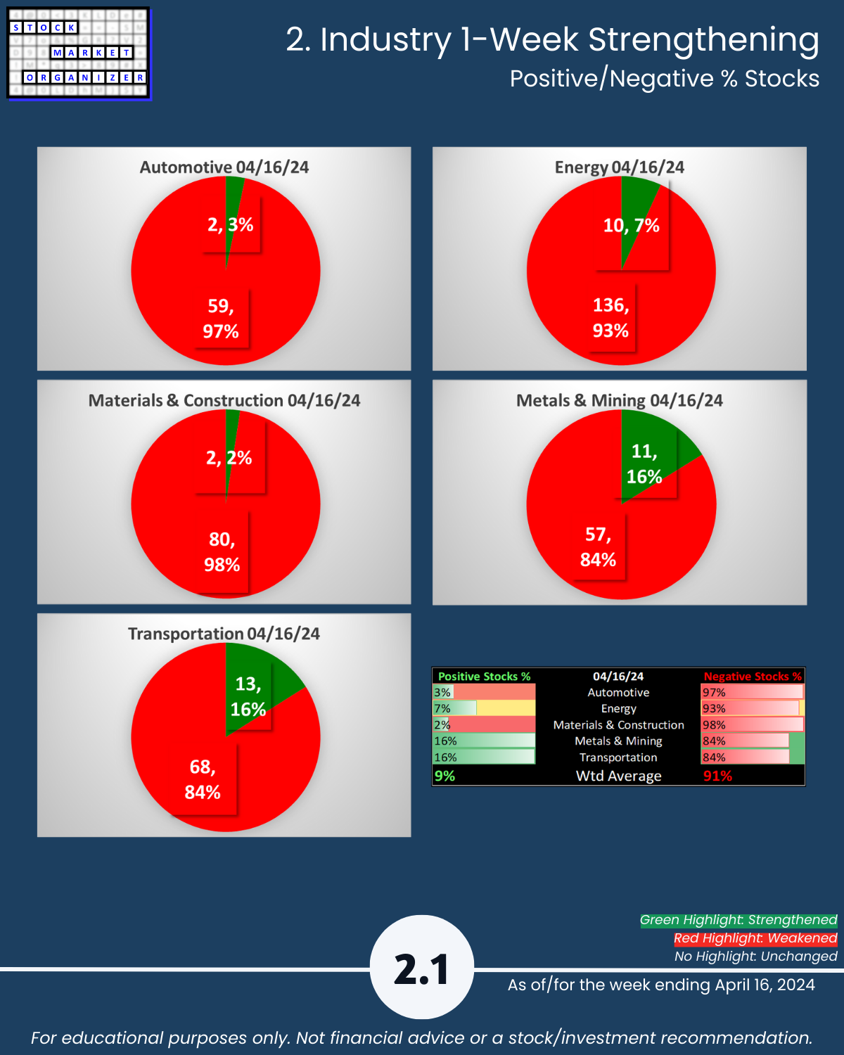 4/16/24 As Utilities yesterday had a bad week, now Automotive has gone splat. Unique U.S. Stock Market strength-based insights into Industry Group 1 = Automotive, Energy, Materials & Construction, Metals & Mining, and Transportation: 🔹 Automotive weakened one rating, all 5 of 5 sub-industries weakened, for the week it had 97% negative stocks as 13% of stocks fell more than -10%, and it has a poor 16%:36% 1Strongest:9Weakest stocks ratio, 🔹 the industry group composite ranking fell 0.5 points to 4.3 and it had 91% negative stocks (Materials & Construction 98%, Energy 93%) 🔹 the group’s 5+ year highs:lows ratio has fallen from 55:12 on 3/19/24 to 4:10 this week.