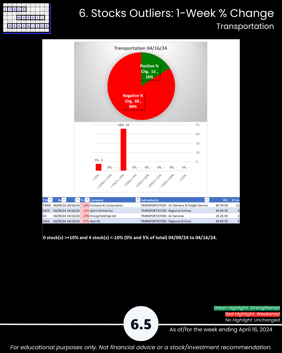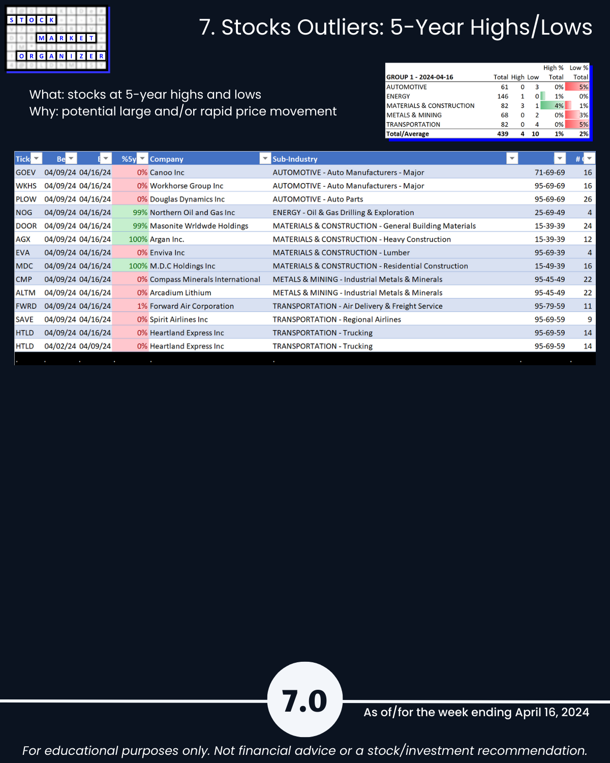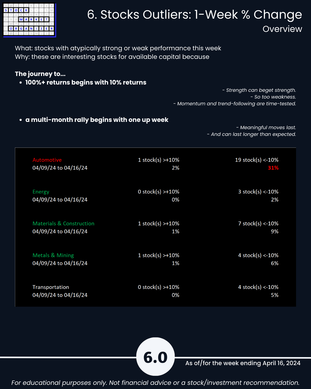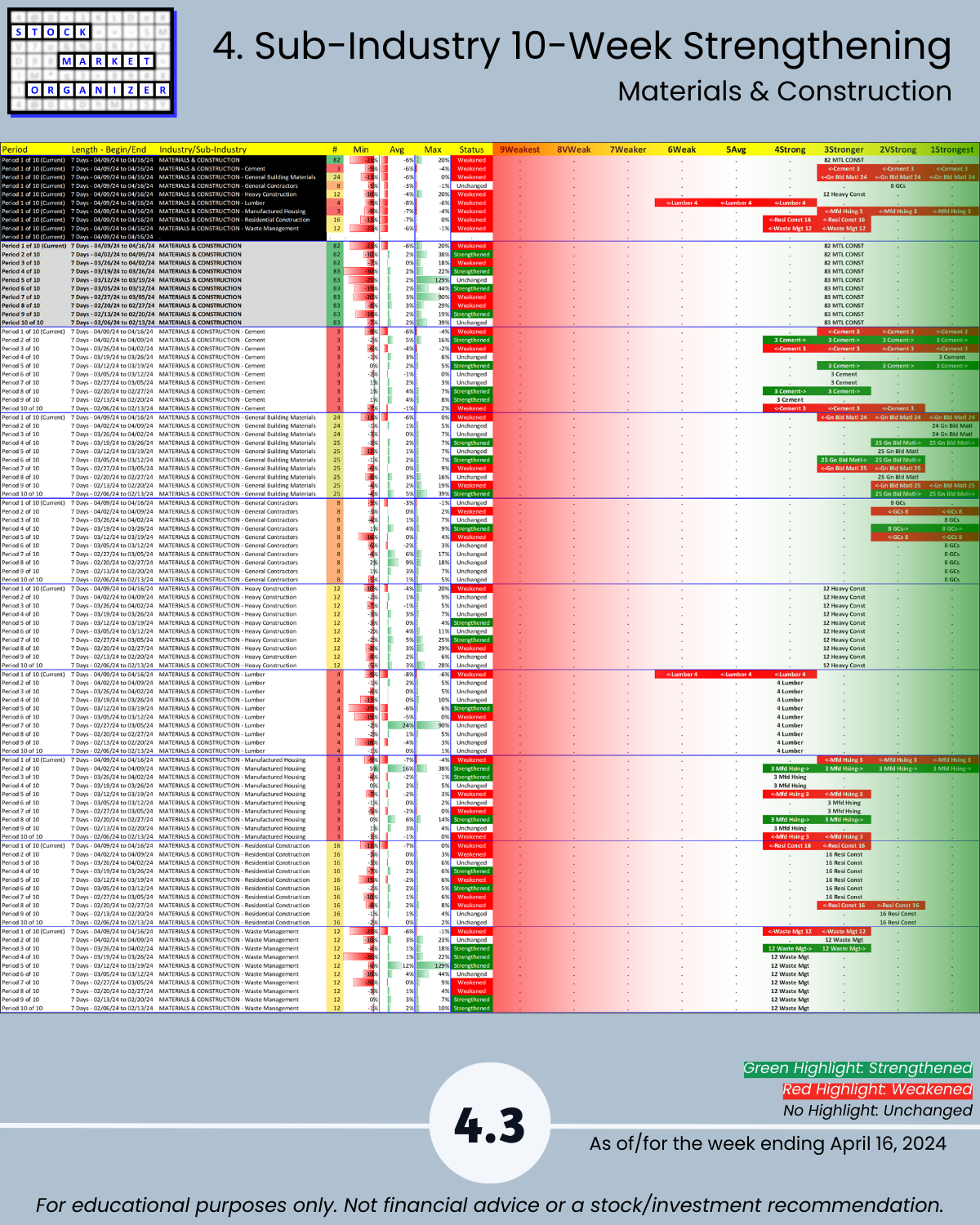 4/16/24 As Utilities yesterday had a bad week, now Automotive has gone splat. Unique U.S. Stock Market strength-based insights into Industry Group 1 = Automotive, Energy, Materials & Construction, Metals & Mining, and Transportation: 🔹 Automotive weakened one rating, all 5 of 5 sub-industries weakened, for the week it had 97% negative stocks as 13% of stocks fell more than -10%, and it has a poor 16%:36% 1Strongest:9Weakest stocks ratio, 🔹 the industry group composite ranking fell 0.5 points to 4.3 and it had 91% negative stocks (Materials & Construction 98%, Energy 93%) 🔹 the group’s 5+ year highs:lows ratio has fallen from 55:12 on 3/19/24 to 4:10 this week.