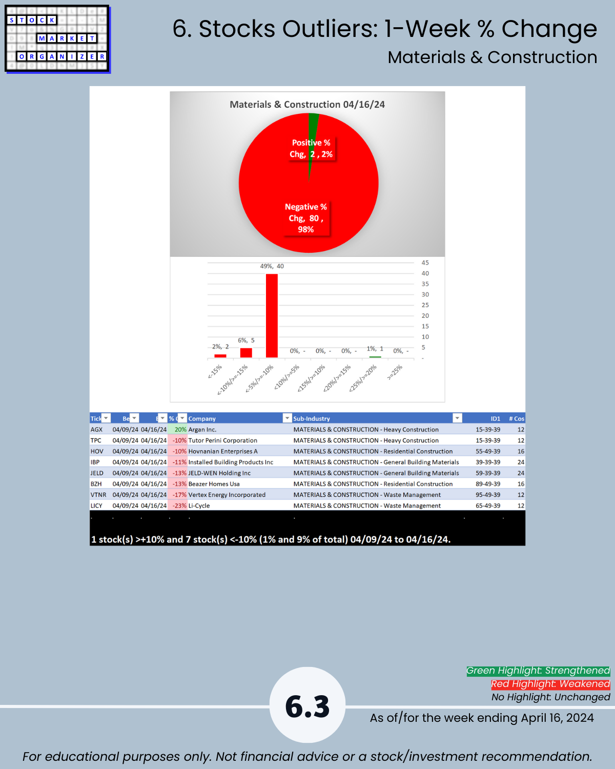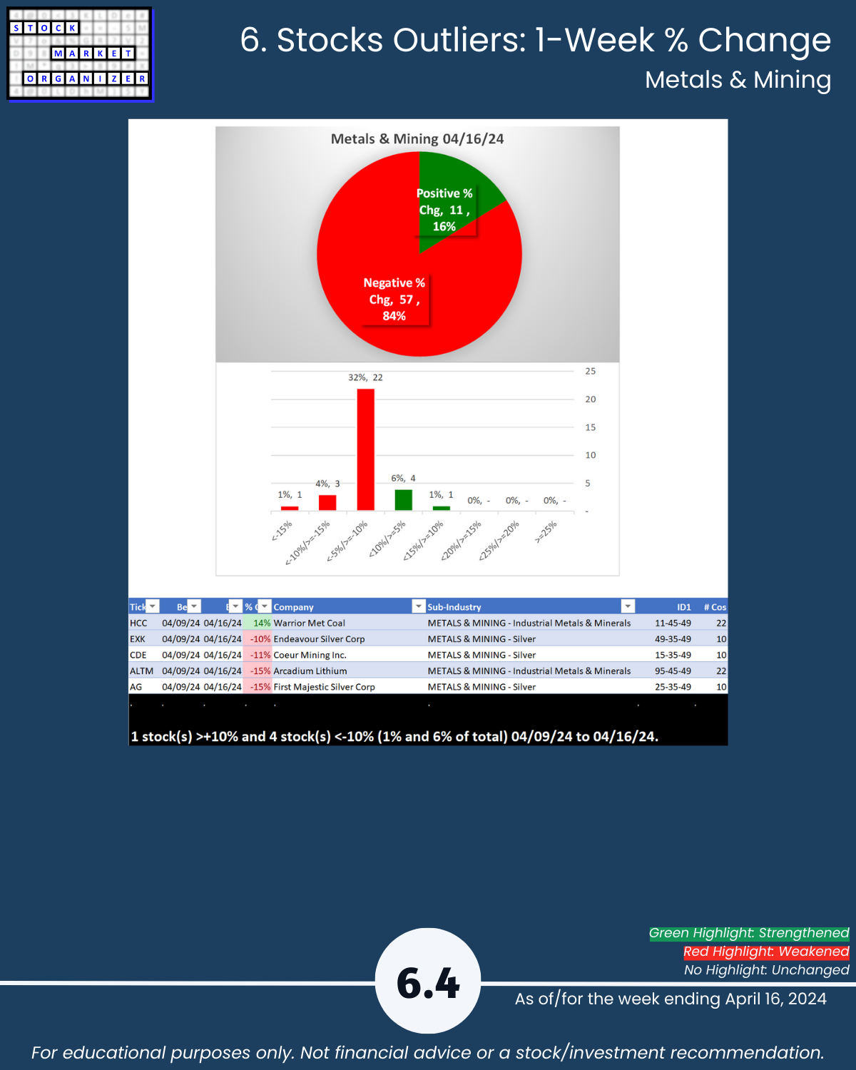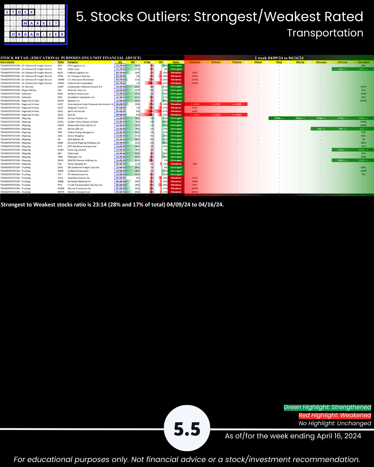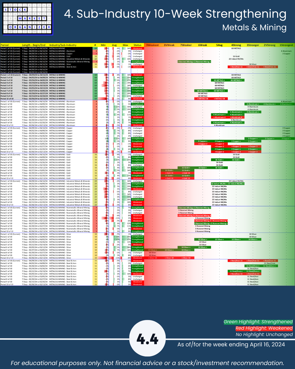 4/16/24 As Utilities yesterday had a bad week, now Automotive has gone splat. Unique U.S. Stock Market strength-based insights into Industry Group 1 = Automotive, Energy, Materials & Construction, Metals & Mining, and Transportation: 🔹 Automotive weakened one rating, all 5 of 5 sub-industries weakened, for the week it had 97% negative stocks as 13% of stocks fell more than -10%, and it has a poor 16%:36% 1Strongest:9Weakest stocks ratio, 🔹 the industry group composite ranking fell 0.5 points to 4.3 and it had 91% negative stocks (Materials & Construction 98%, Energy 93%) 🔹 the group’s 5+ year highs:lows ratio has fallen from 55:12 on 3/19/24 to 4:10 this week.
