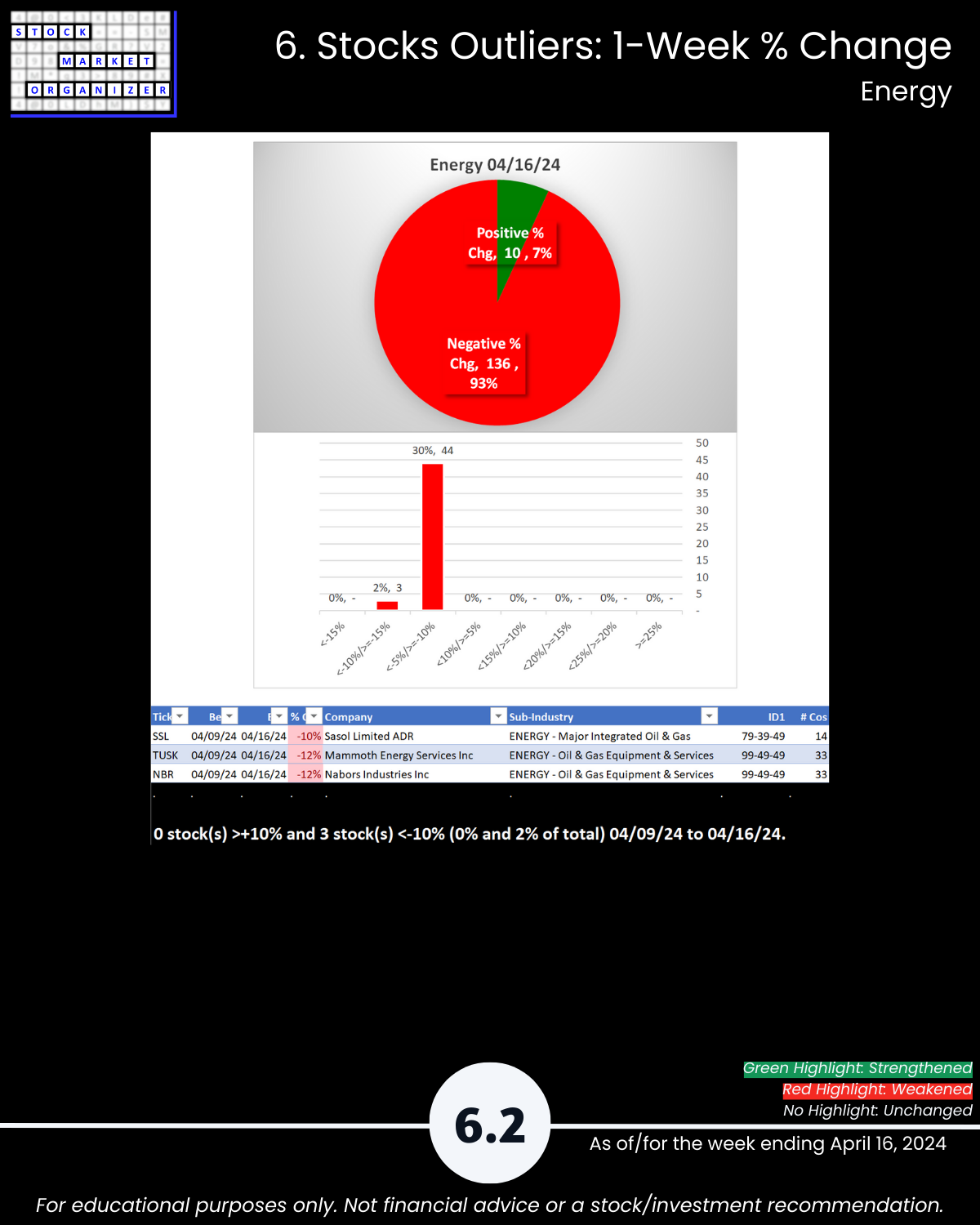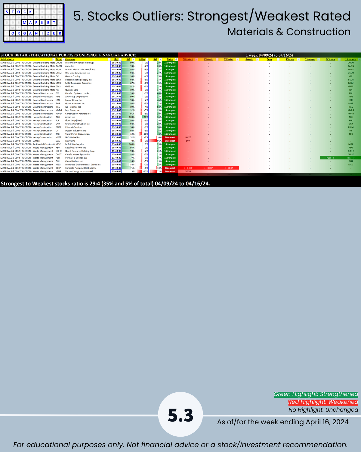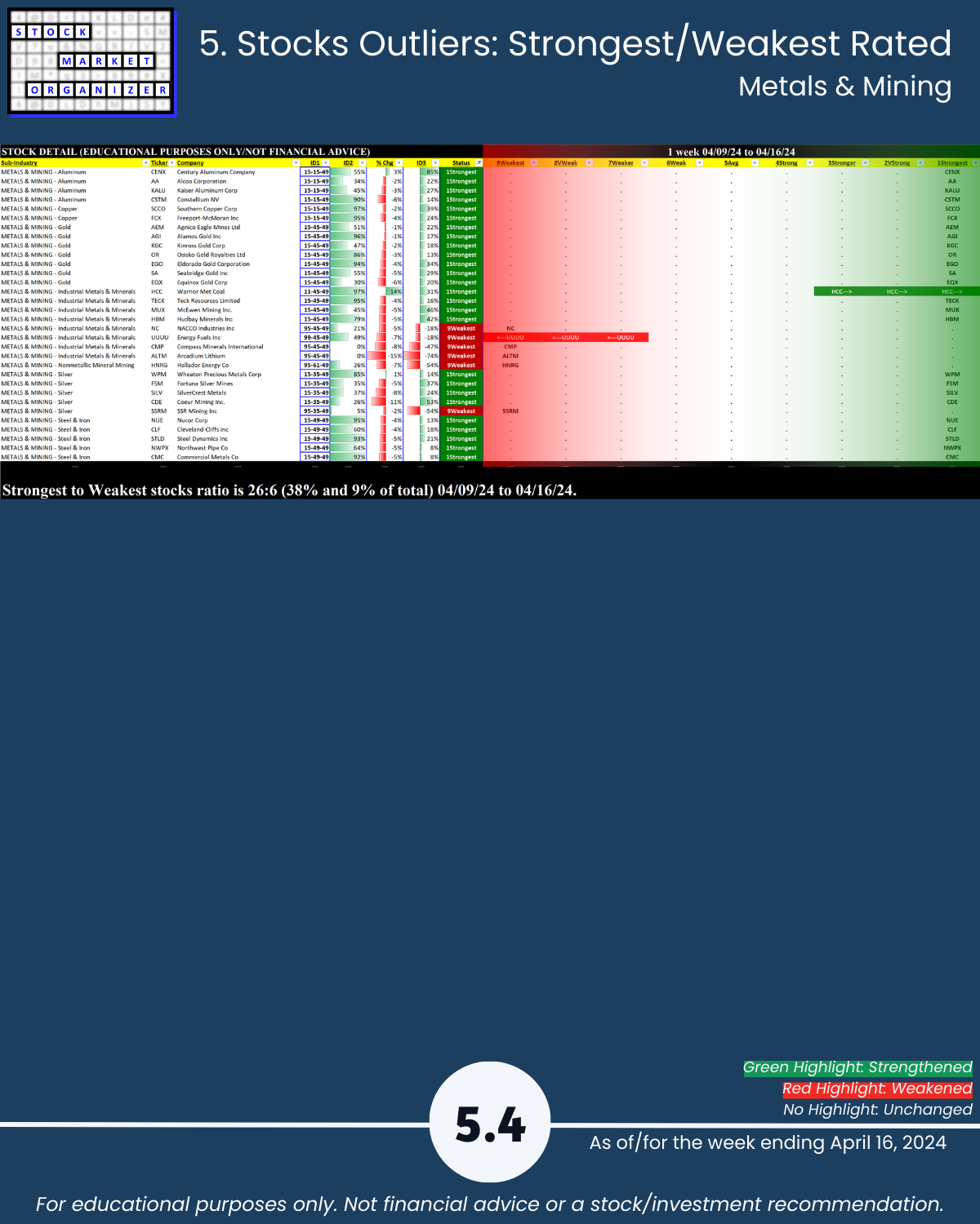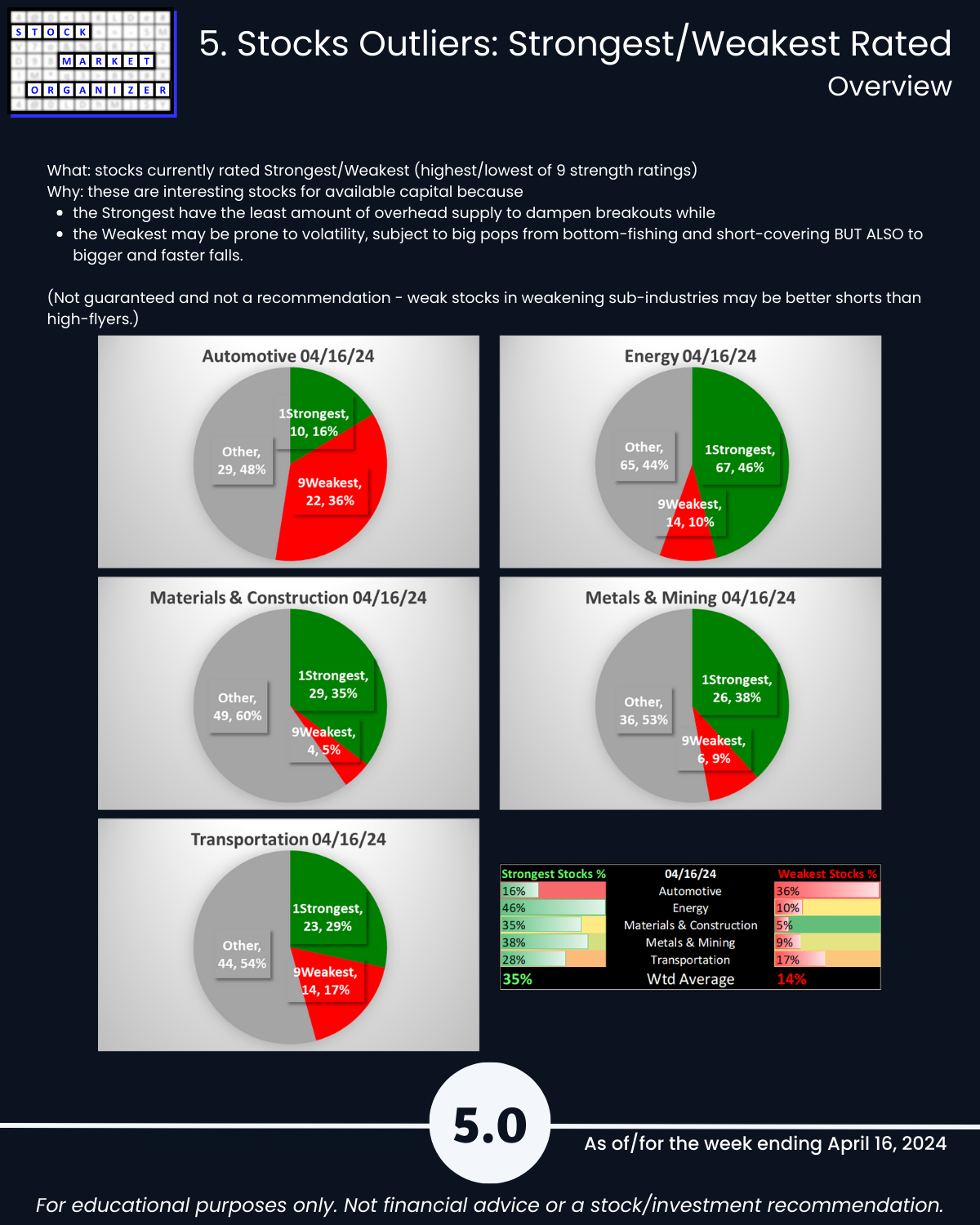 - Strongest:Weakest: Avg 35%/14%; Automotive 16%:36%, Energy 46%:10%, Matls/Con 35%:5%, Metals 38%:9%