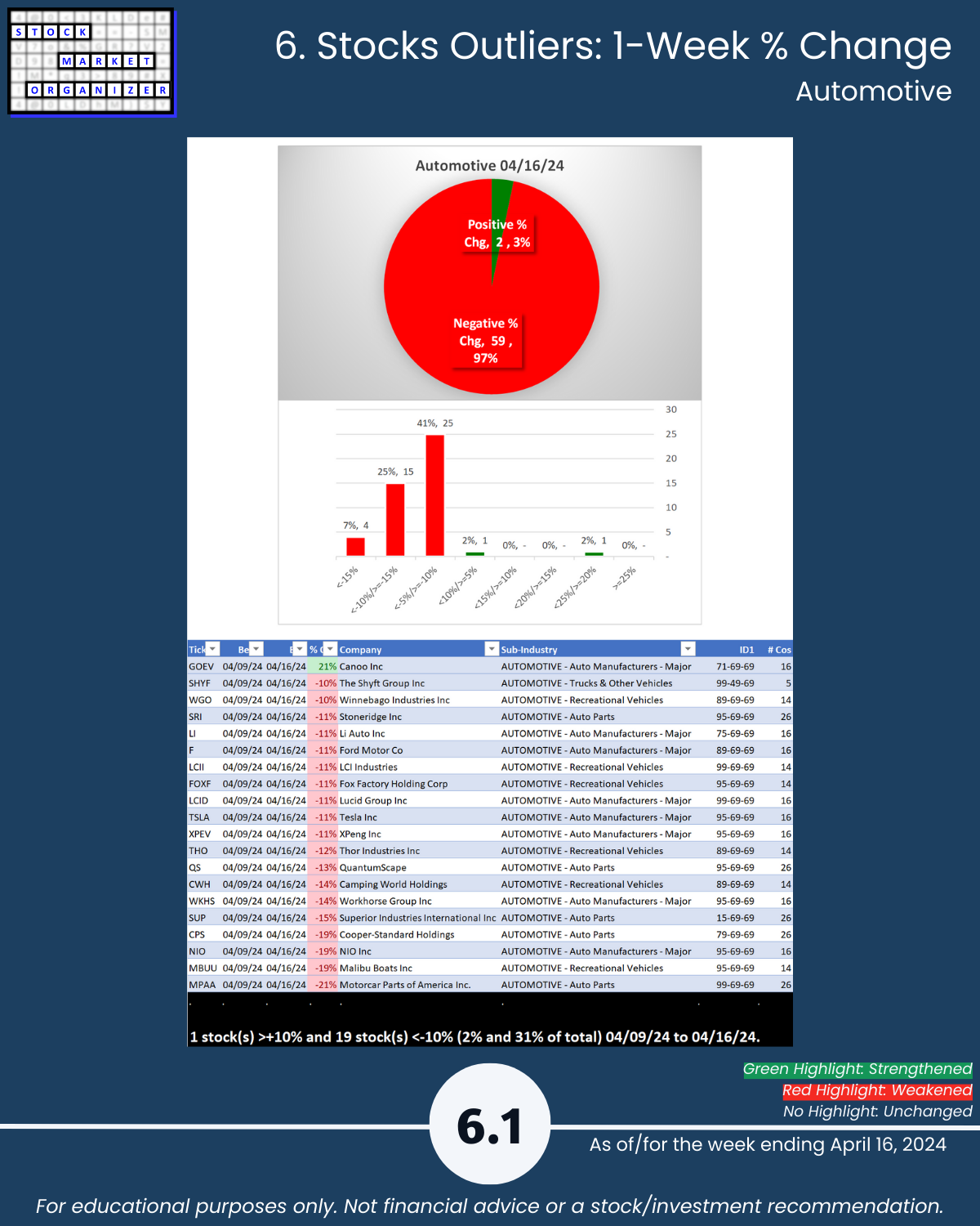 SUMMARY: WEAKENED, 91% NEGATIVE STOCKS THIS WEEK (AUTOMOTIVE 97% NEGATIVE, 31% STOCKS <-10%)