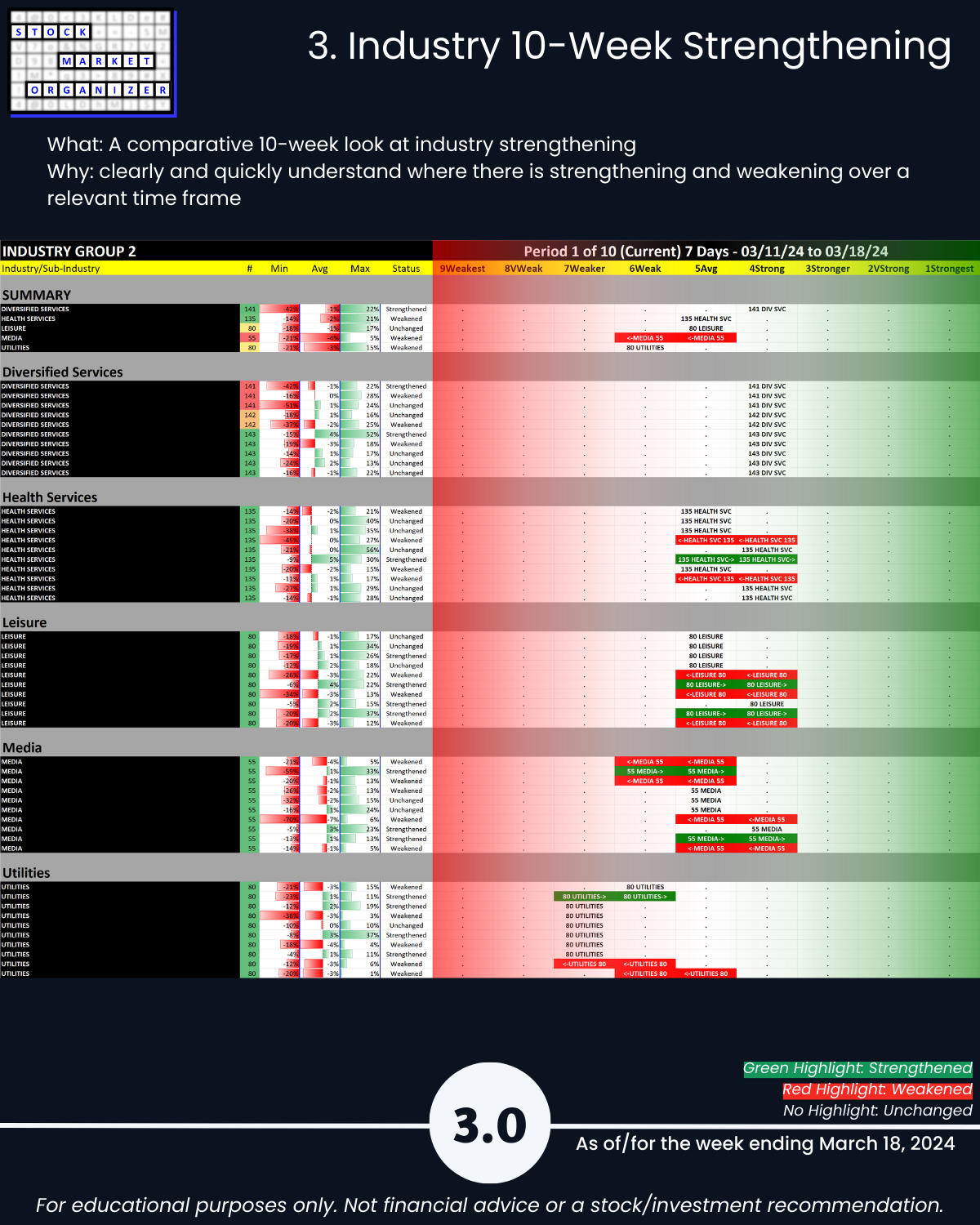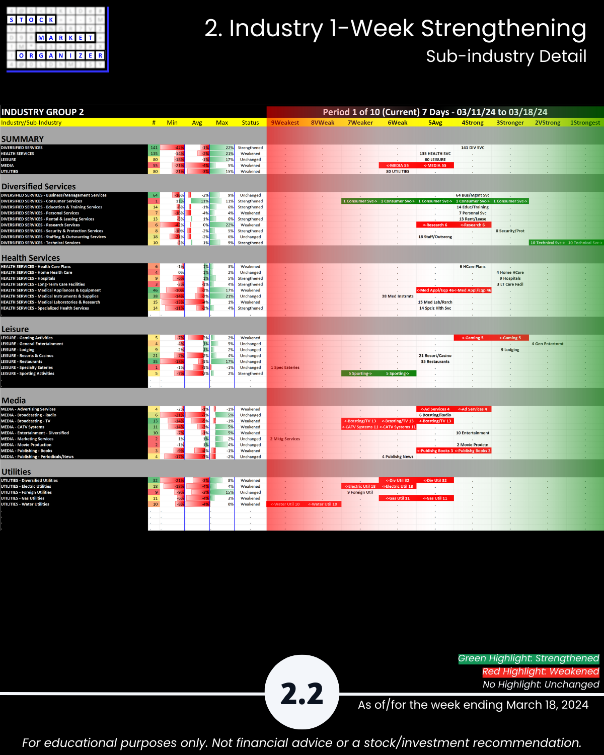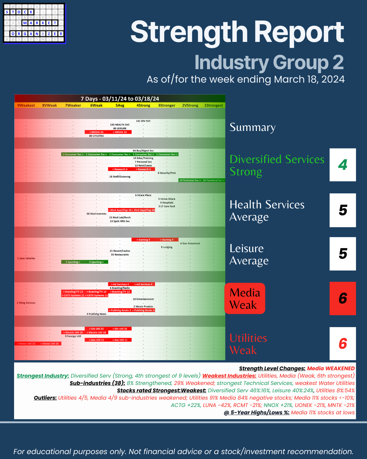 Attached: Strongest- and Weakest-rated Stock Market Organizer stocks and objective strengthening/weakening measurements in the Diversified Services, Health Services, Leisure, Media, and Utilities industries.