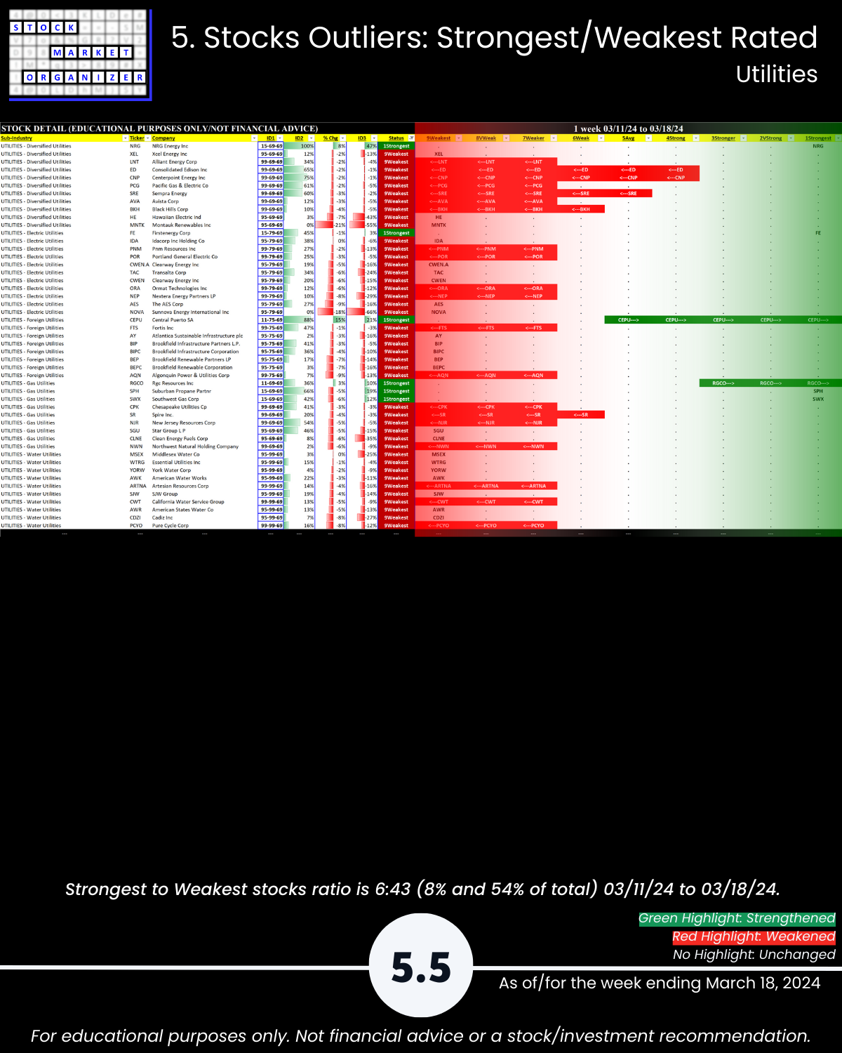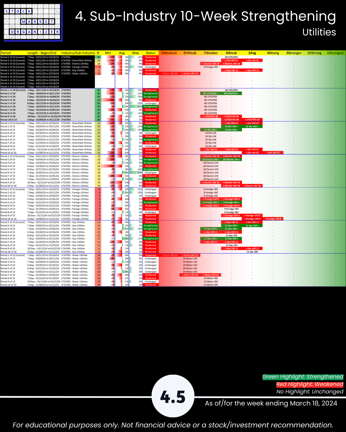 What you may not have known, U.S. stock market 3/18/24 Group 2 (loosely, Services Sector) stocks: Utilities reverted to its weakening ways. ๐น 4/5 sub-industries weakened (Water Utilities is rated Weakest, lowest of 9 strength levels), ๐น 91% negative stocks for the week, and ๐น only 8% of stocks rated Strongest.