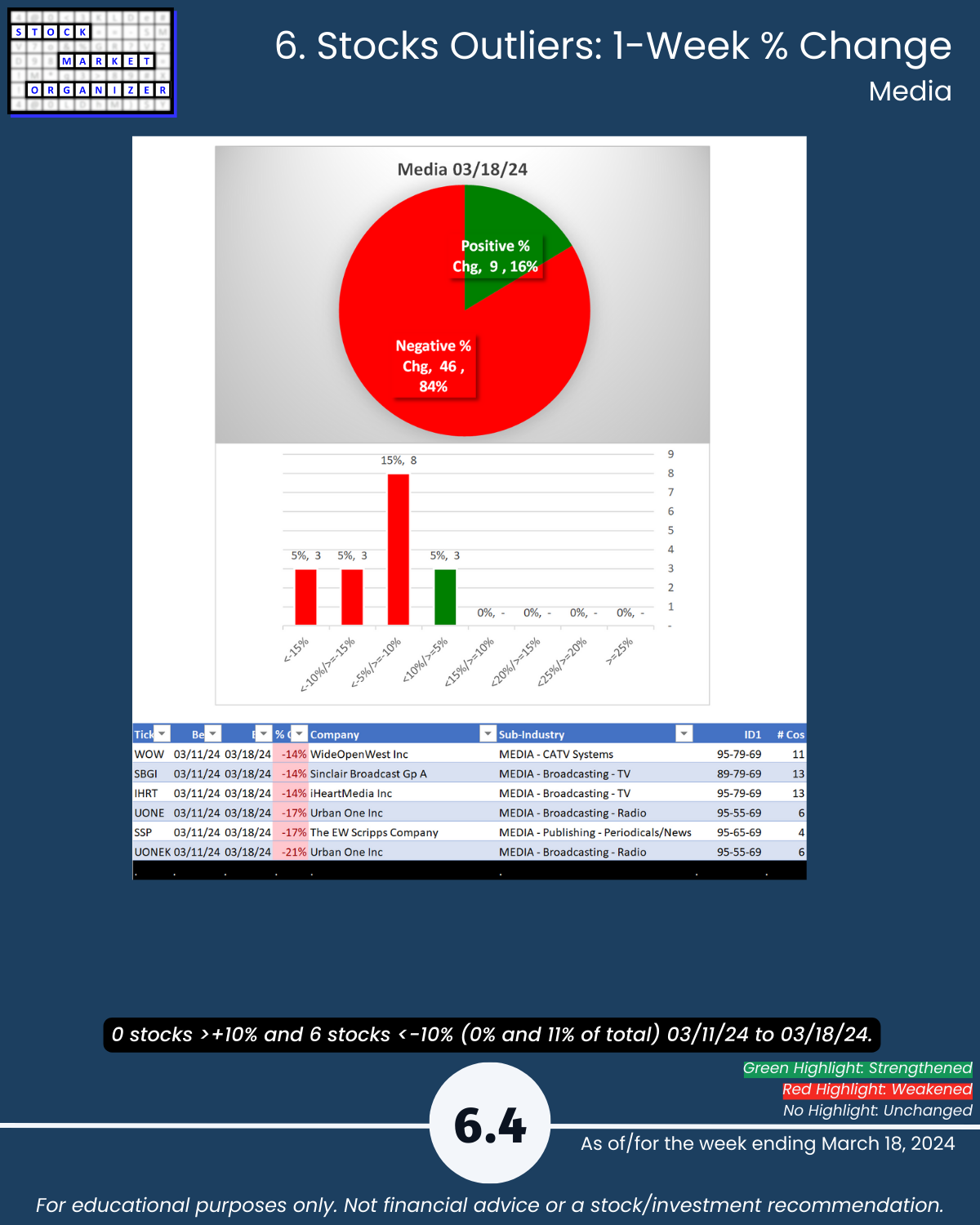 ๐น Outliers: Utilities 4/5, Media 4/9 sub-industries weakened; Utilities 91% Media 84% negative stocks; Media 11% stocks <-10%; ACTG +22%, LUNA -42%, RCMT -21%; NNOX +21%, UONEK -21%, MNTK -21%