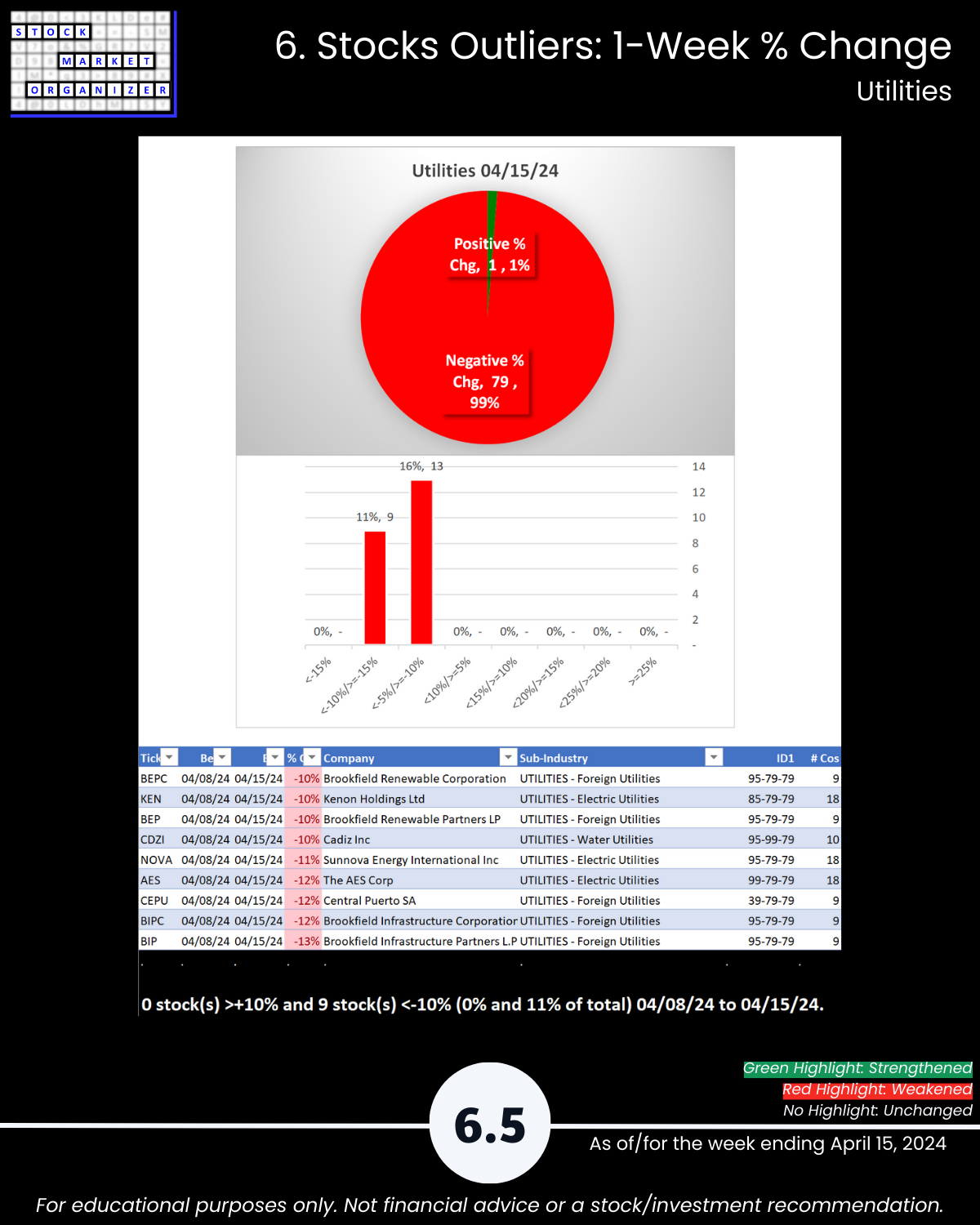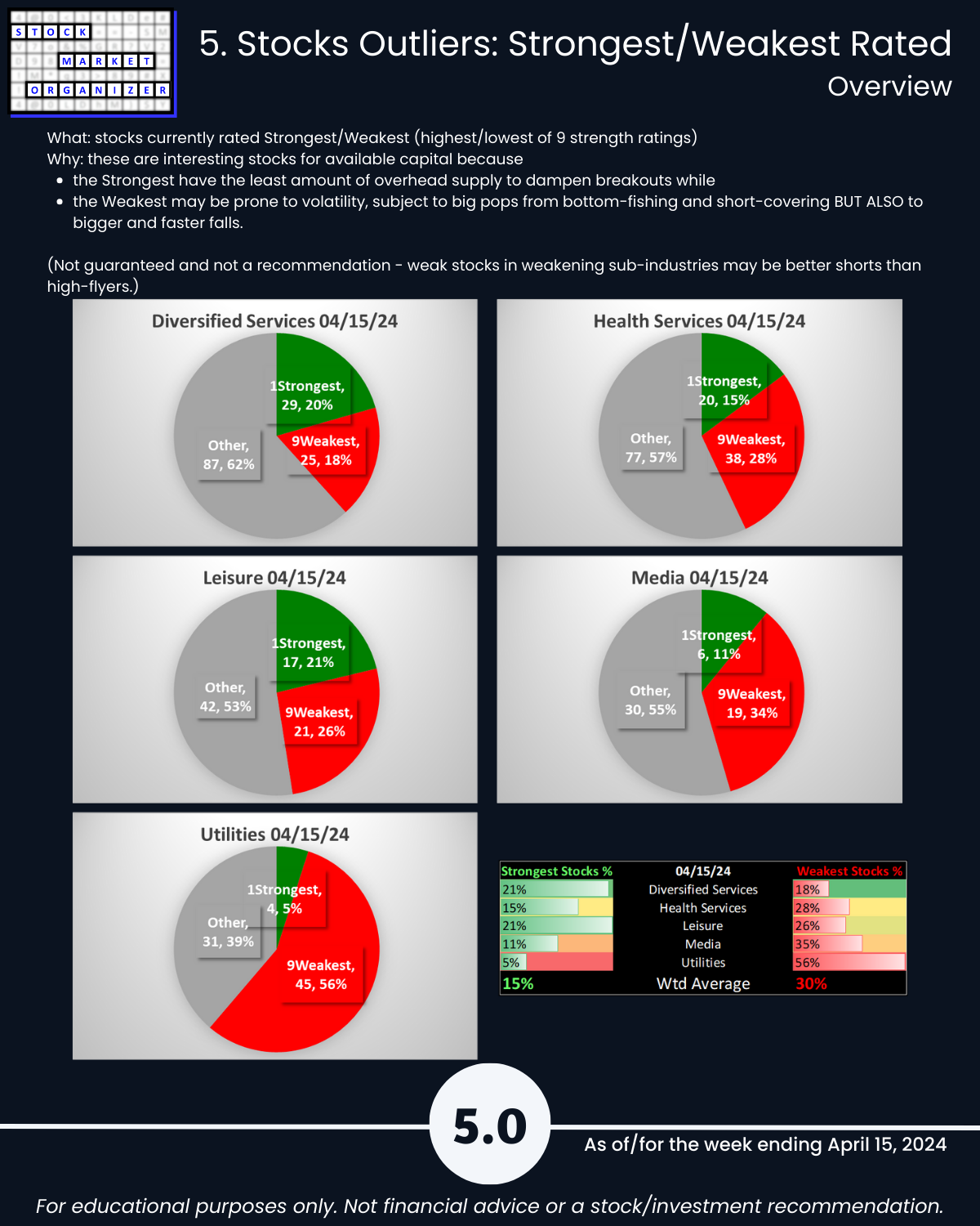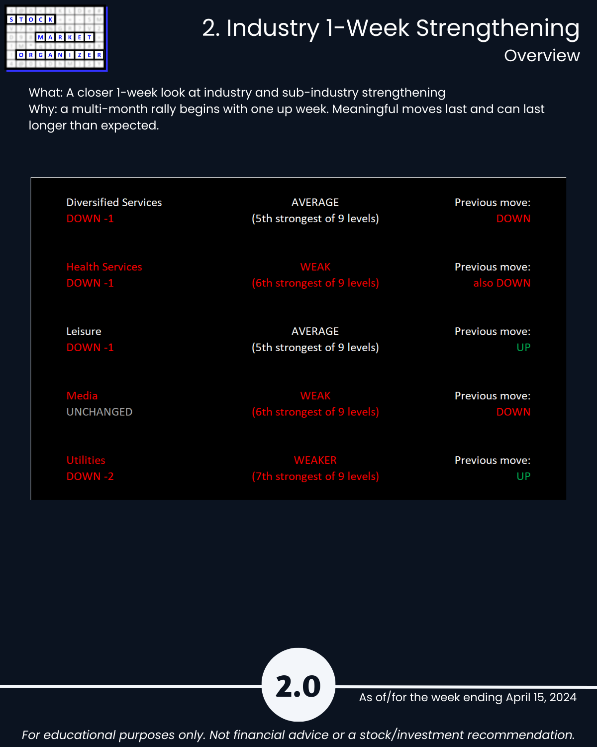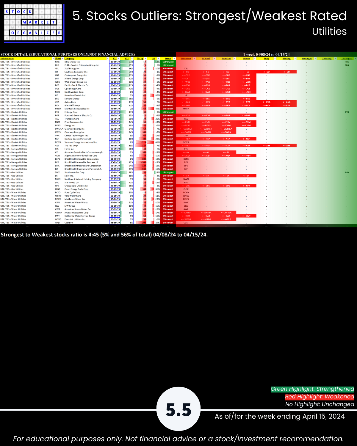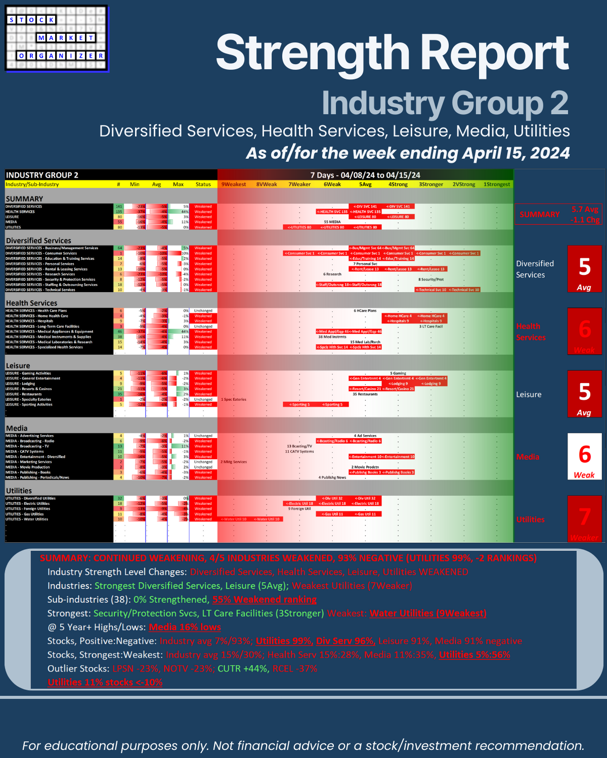 U.S. taxes due day 4/15/24 as longs are “taxed” with a loss to start the week, continuing recent market weakness. Especially Utilities: 🔹 Utilities -2 strength rankings to 7Weaker (7th strongest of 9 levels and now lowest of all 29 industries), 99% negative stocks with -5% average return for the week, 5%:56% 1Strongest:9Weakest stocks ratio, 11% stocks at 5+ year lows, 🔹 the Industry Group ranking fell by a large -1.1 to 5.7 weighted average composite ranking, 🔹 55% of sub-industries weakened rankings as 84% sub-industries weakened generally.