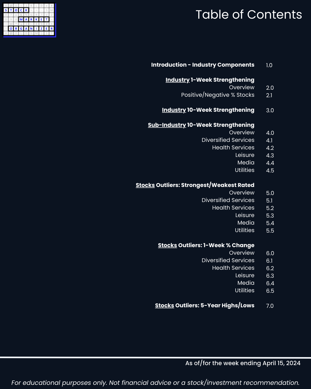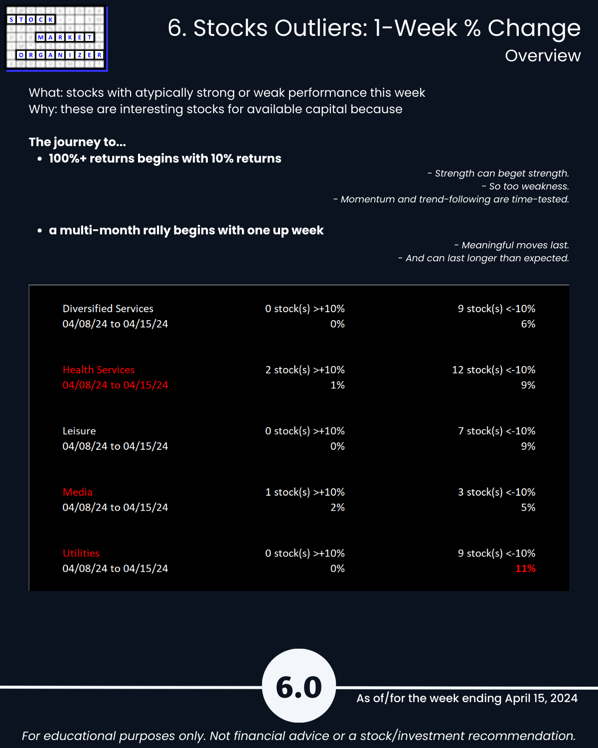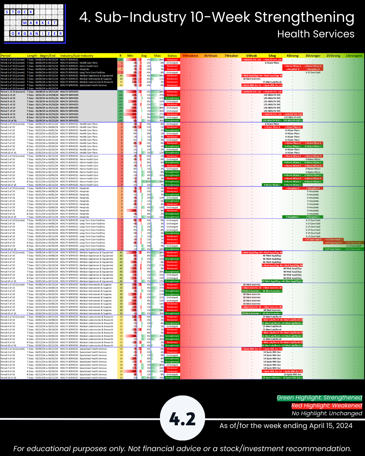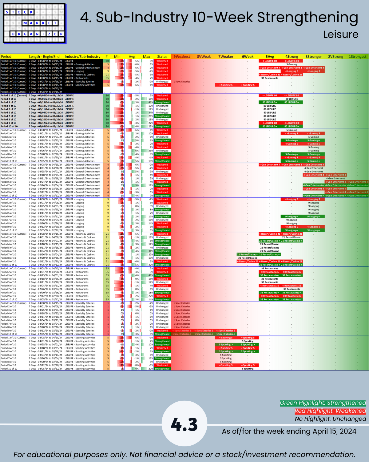 U.S. taxes due day 4/15/24 as longs are “taxed” with a loss to start the week, continuing recent market weakness. Especially Utilities: 🔹 Utilities -2 strength rankings to 7Weaker (7th strongest of 9 levels and now lowest of all 29 industries), 99% negative stocks with -5% average return for the week, 5%:56% 1Strongest:9Weakest stocks ratio, 11% stocks at 5+ year lows, 🔹 the Industry Group ranking fell by a large -1.1 to 5.7 weighted average composite ranking, 🔹 55% of sub-industries weakened rankings as 84% sub-industries weakened generally.