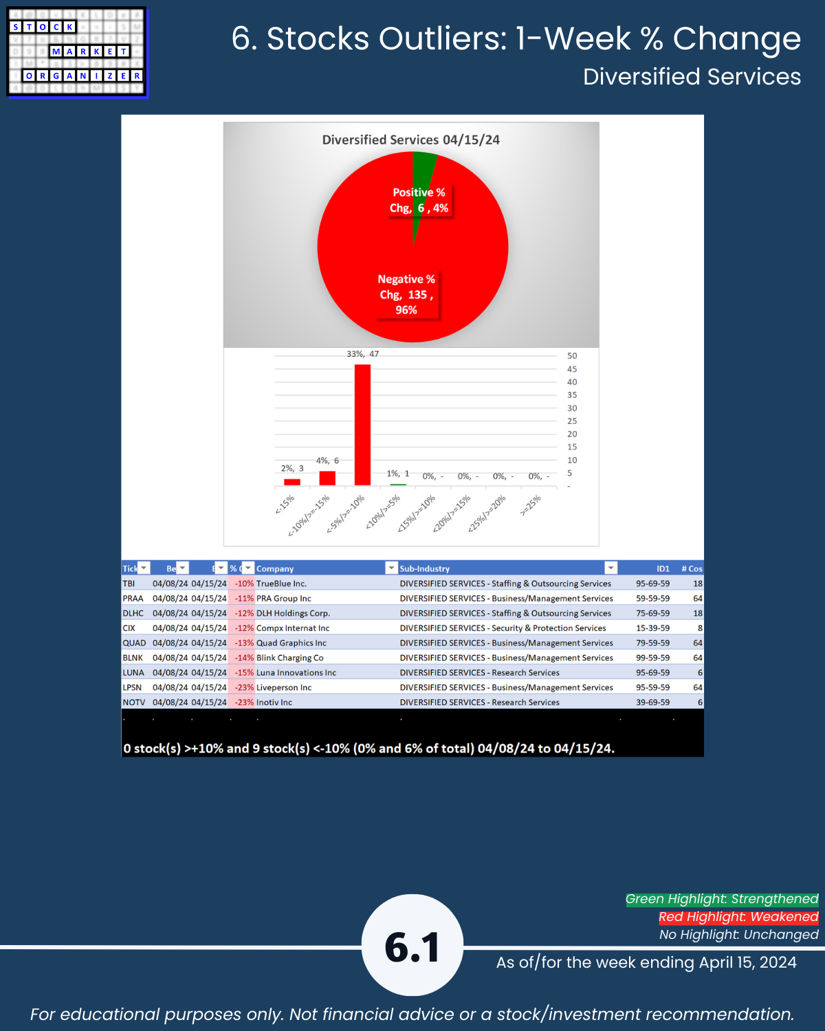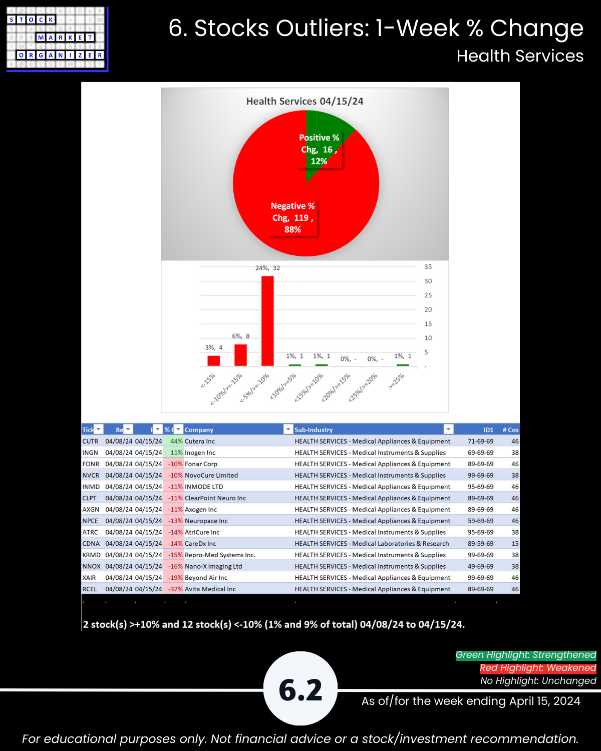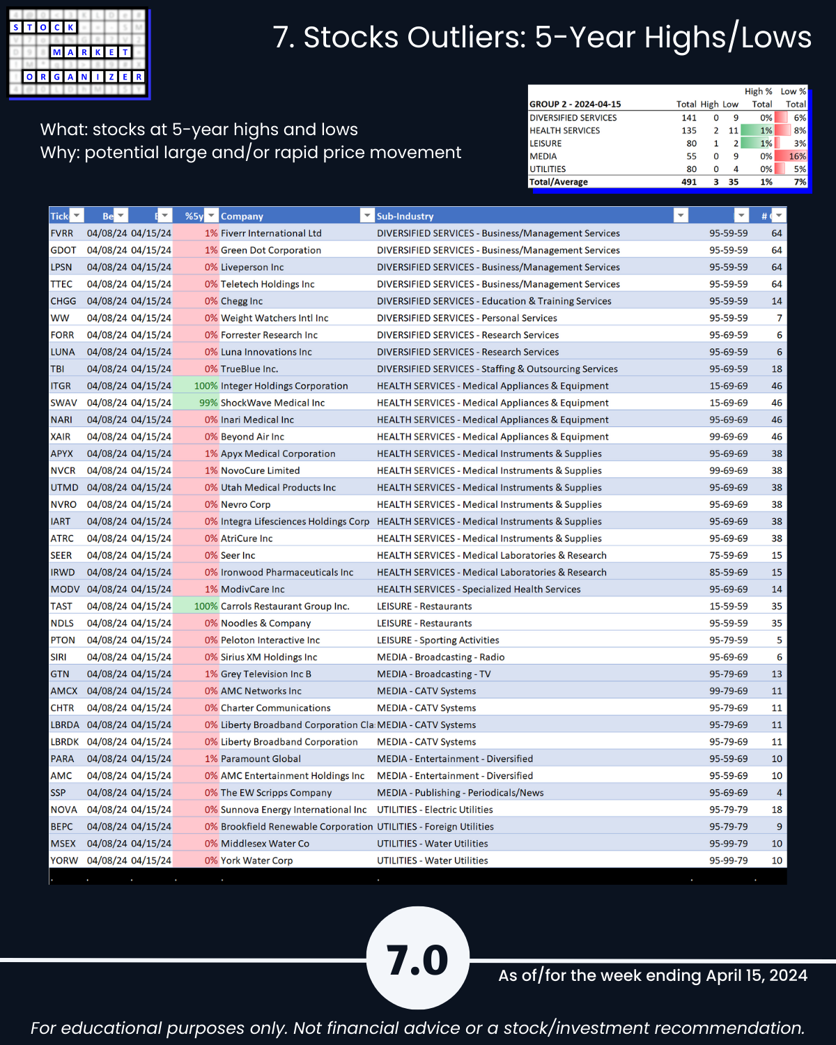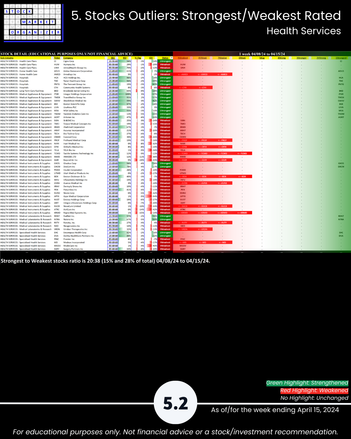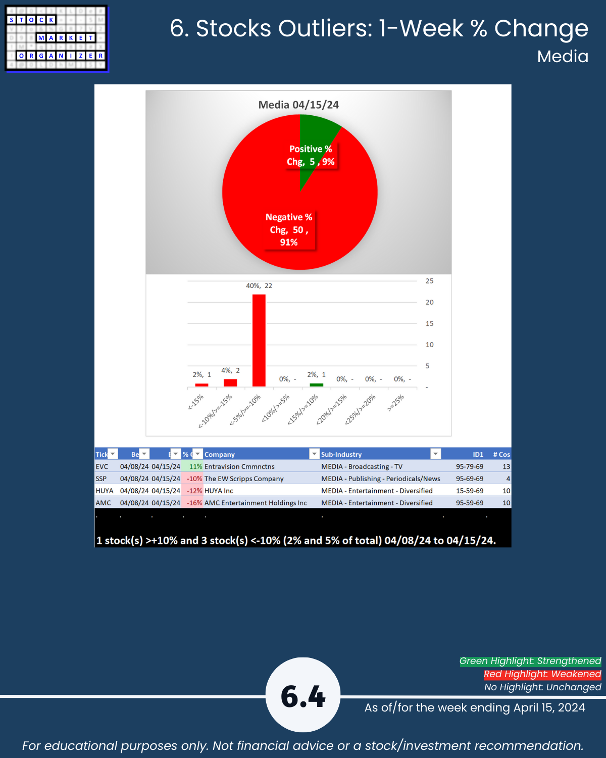 U.S. taxes due day 4/15/24 as longs are “taxed” with a loss to start the week, continuing recent market weakness. Especially Utilities: 🔹 Utilities -2 strength rankings to 7Weaker (7th strongest of 9 levels and now lowest of all 29 industries), 99% negative stocks with -5% average return for the week, 5%:56% 1Strongest:9Weakest stocks ratio, 11% stocks at 5+ year lows, 🔹 the Industry Group ranking fell by a large -1.1 to 5.7 weighted average composite ranking, 🔹 55% of sub-industries weakened rankings as 84% sub-industries weakened generally.