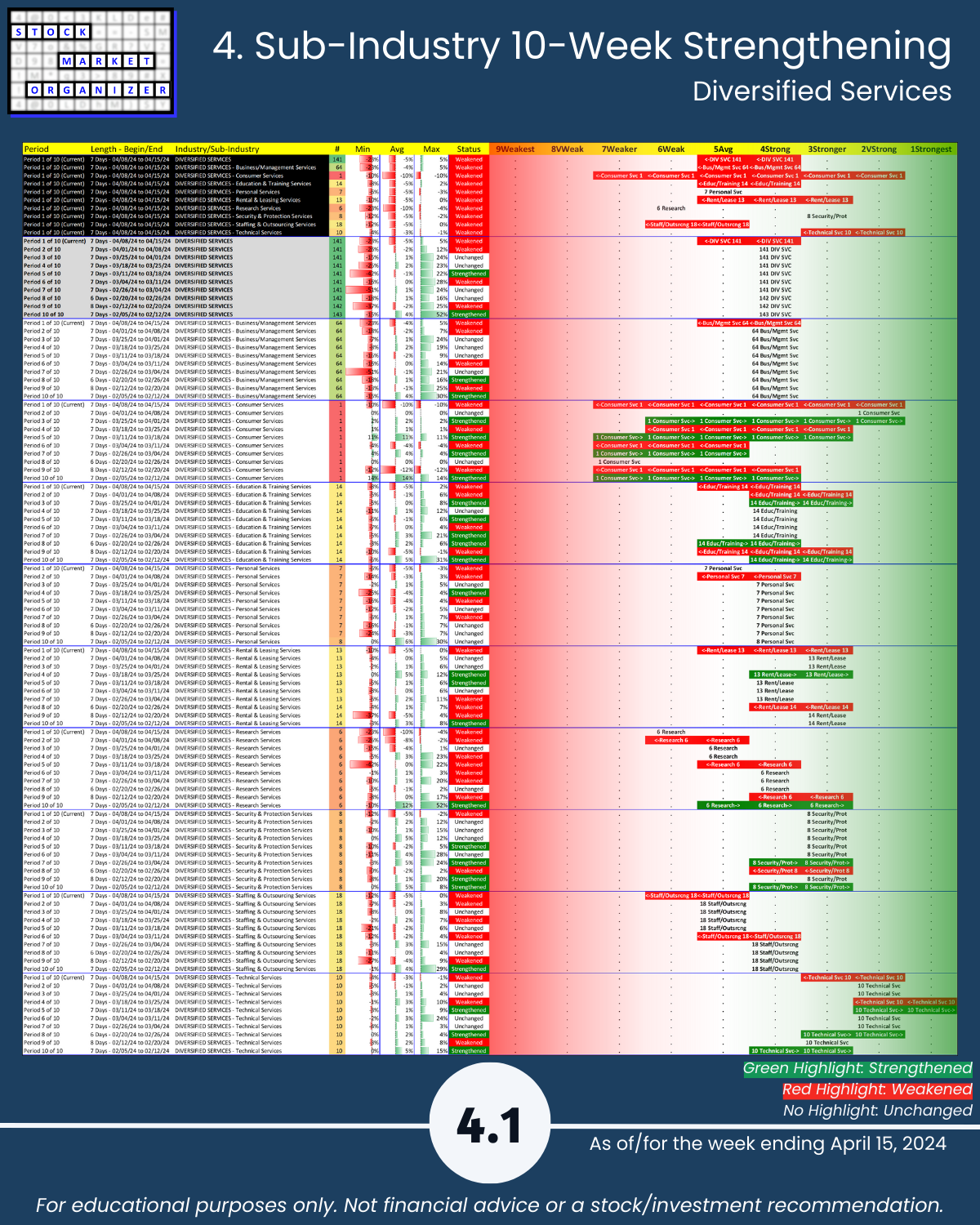 I uncover existing and emerging strength through on-going strength measurement in 29 industries, 198 sub-industries, and almost 2,700 stocks.