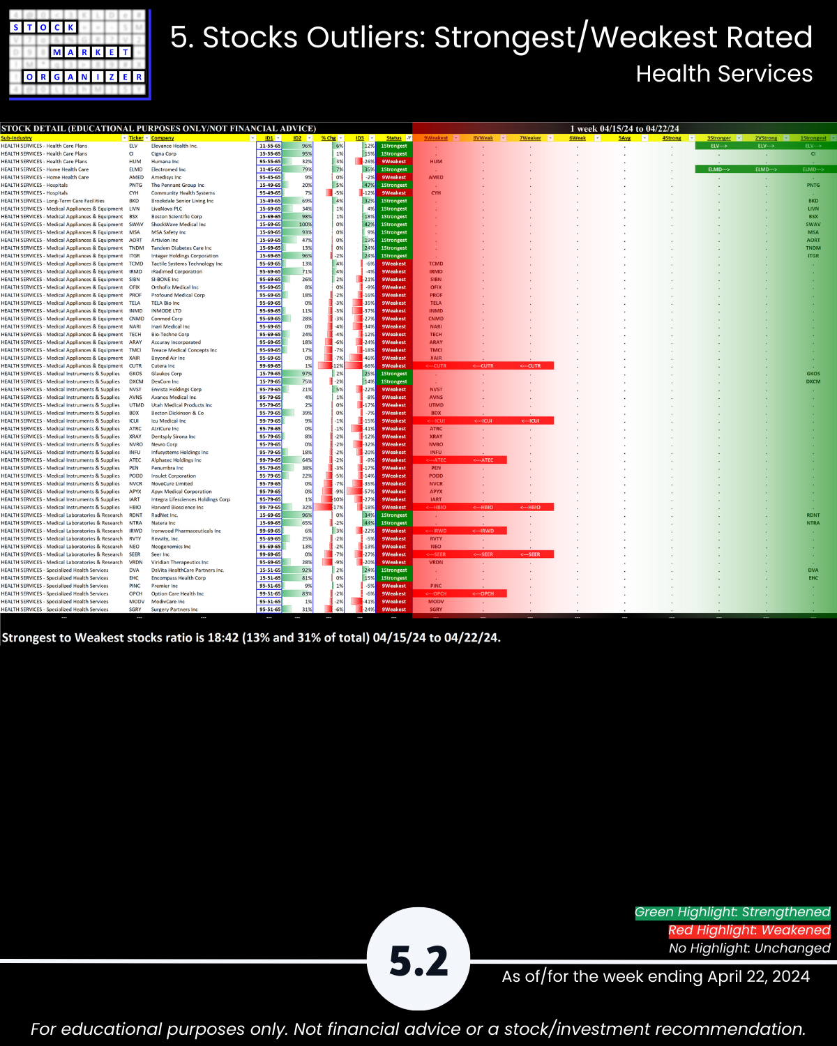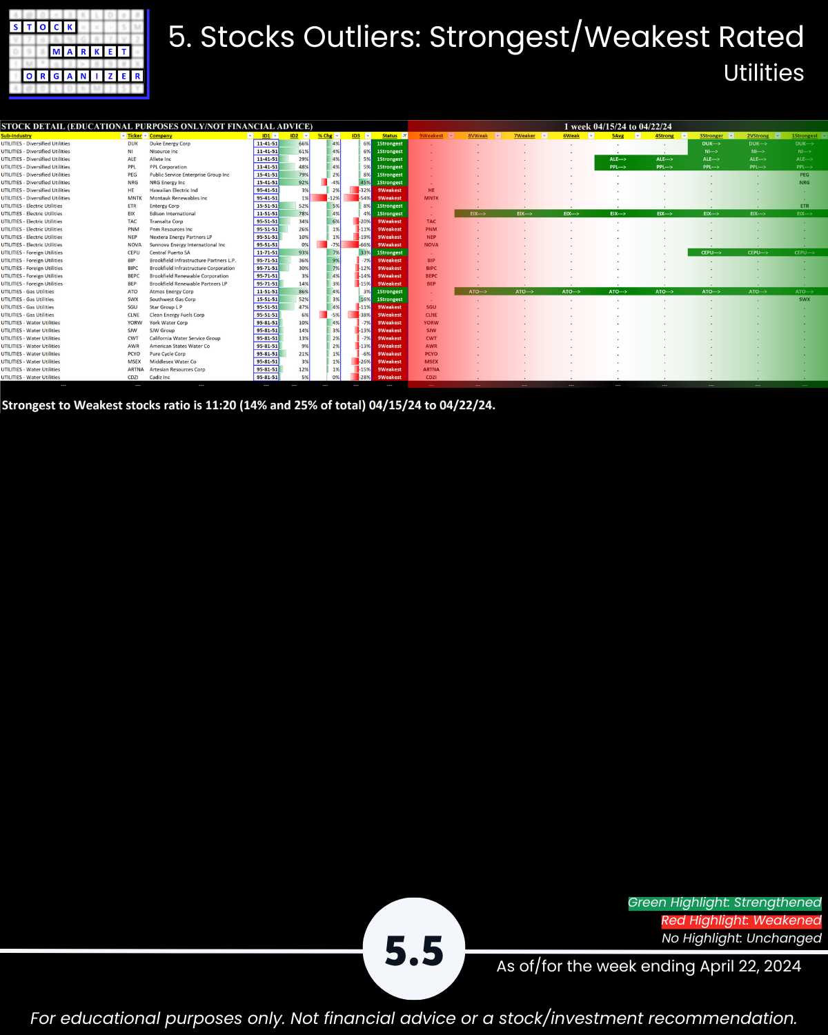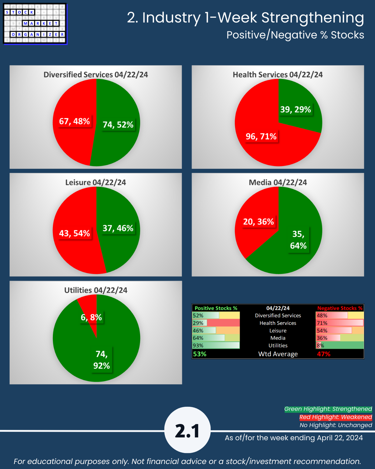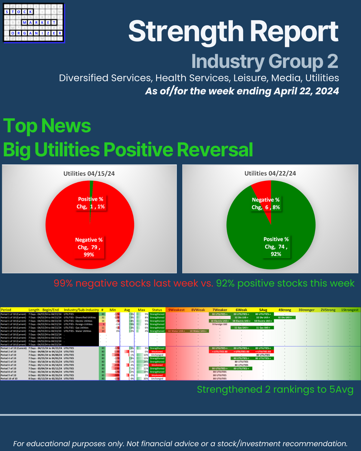 What you may not know that could be relevant: 🔹 Utilities completely reversed last week’s debacle and re-strengthened the 2 ranking levels it lost, enjoying 92% positive stocks vs. last week’s 99% negative, 🔹 Health Services is this group’s weak link with 71% negative stocks and a lagging Strongest:Weakest ratio of 13%:31%.
