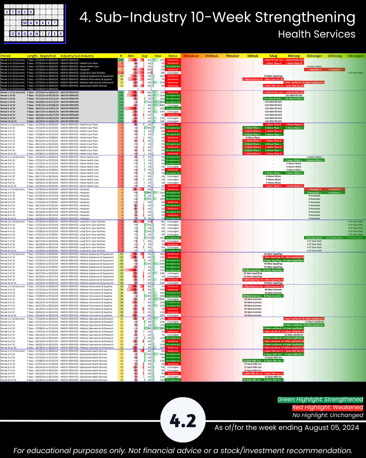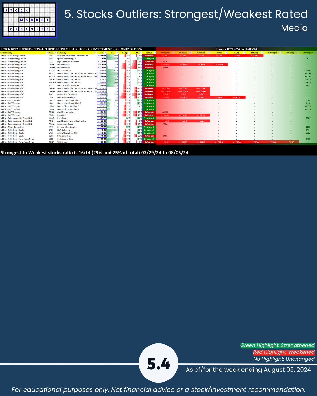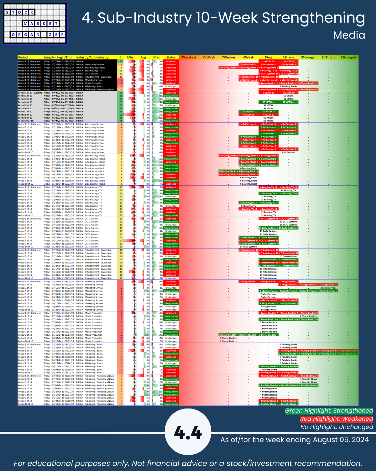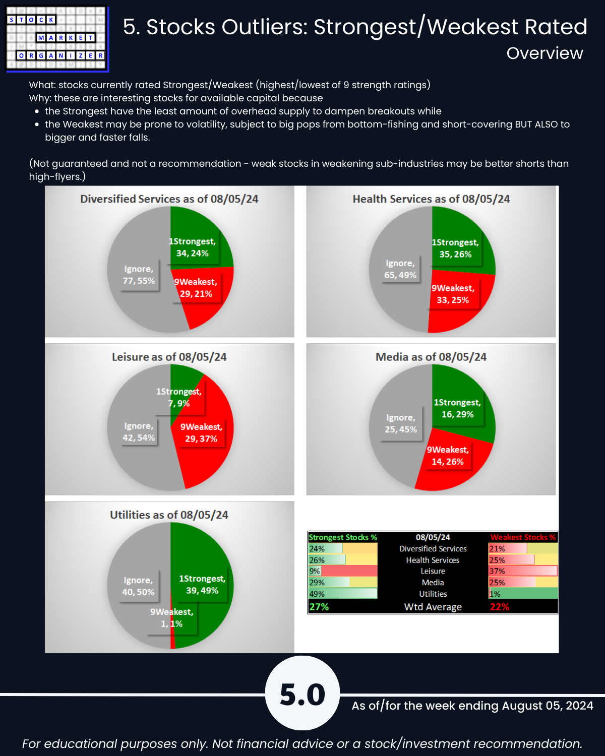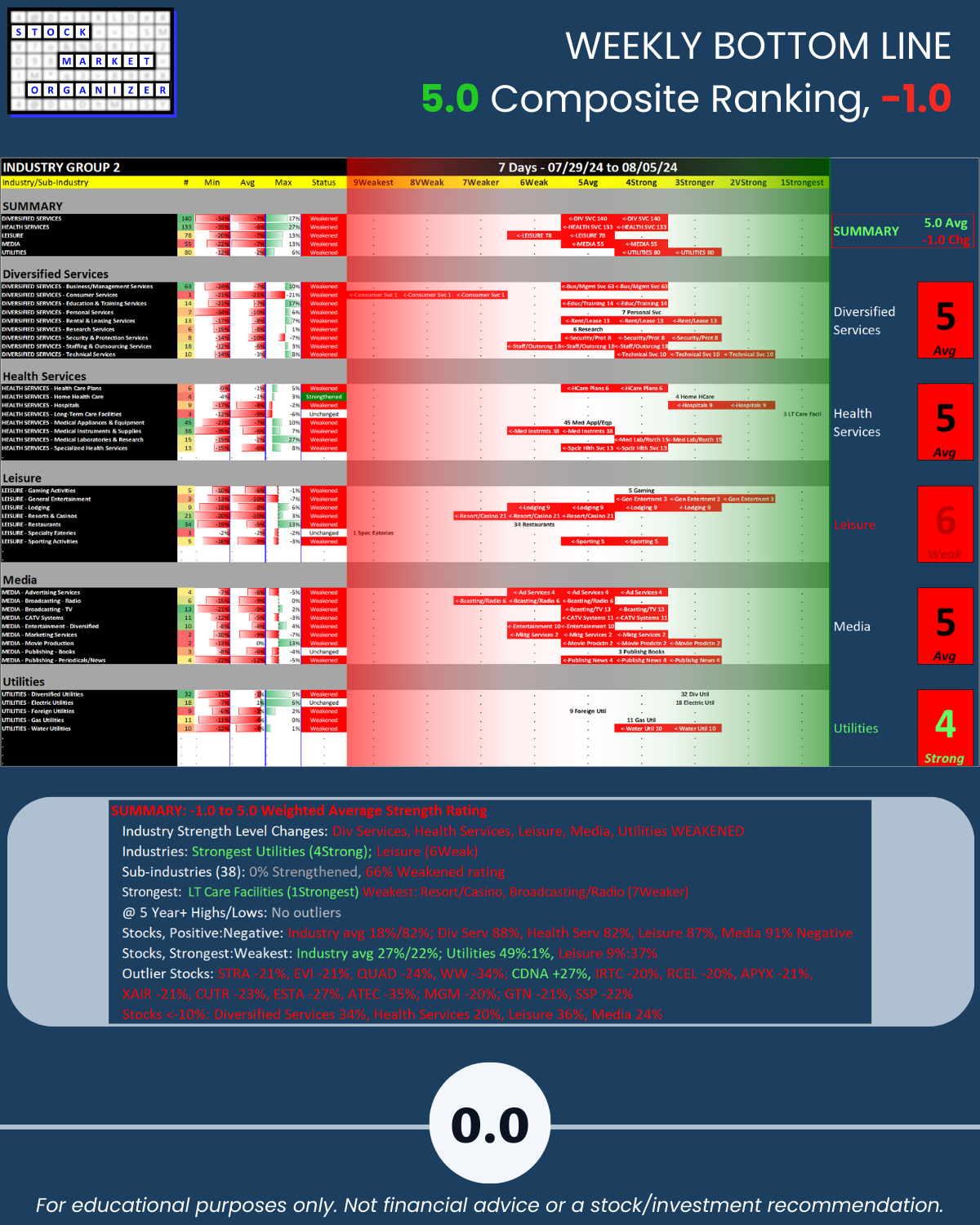 Back to this strength report – this industry grouping weakened significantly over the past week by -1.0 to a 5.0 weighted average strength rating. Much more detail in the attached including a segmenting by sub-industry of the Strongest and Weakest (in Stock Market Organizer parlance) stocks.