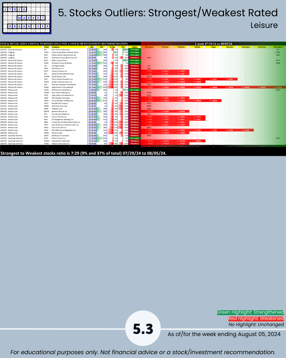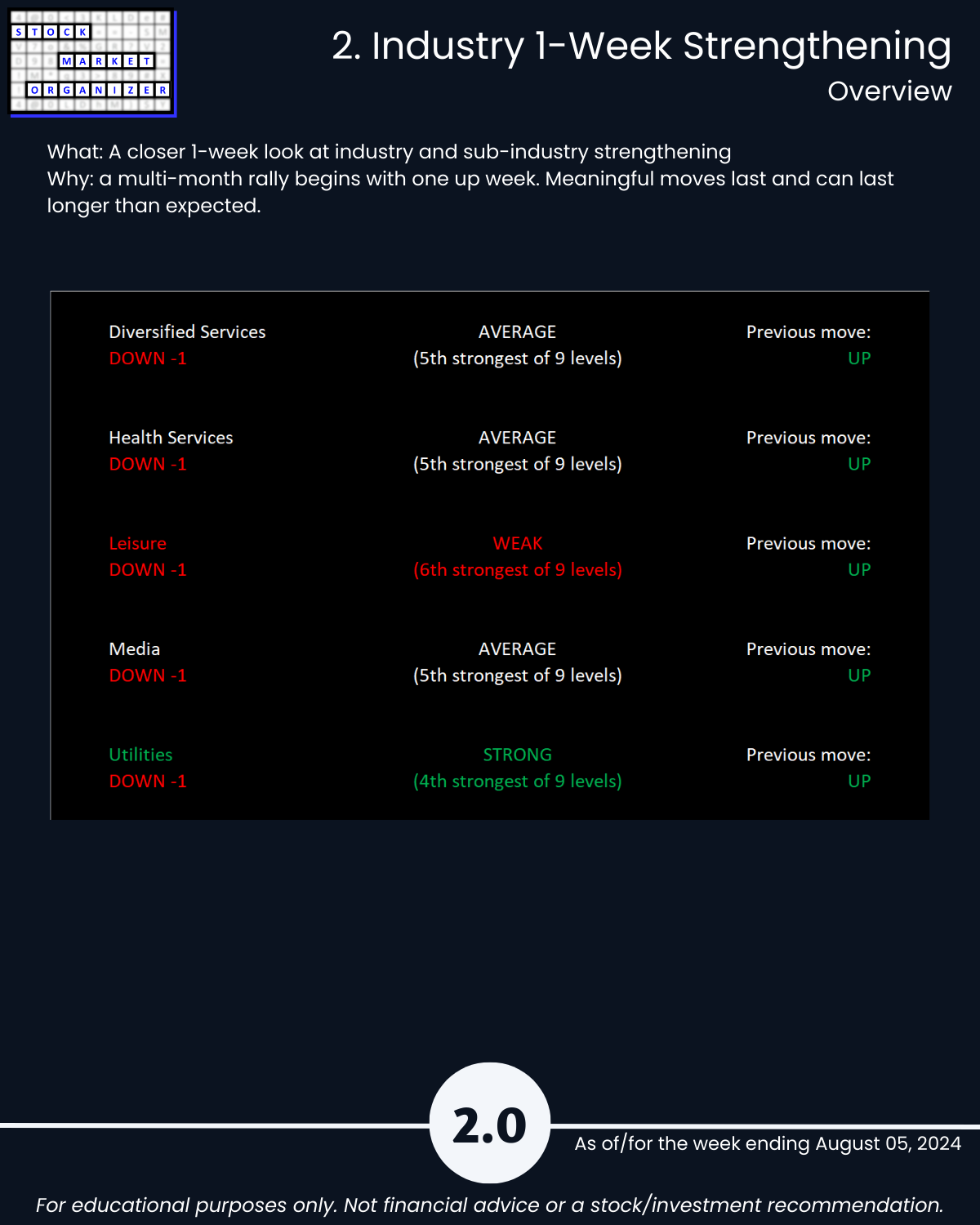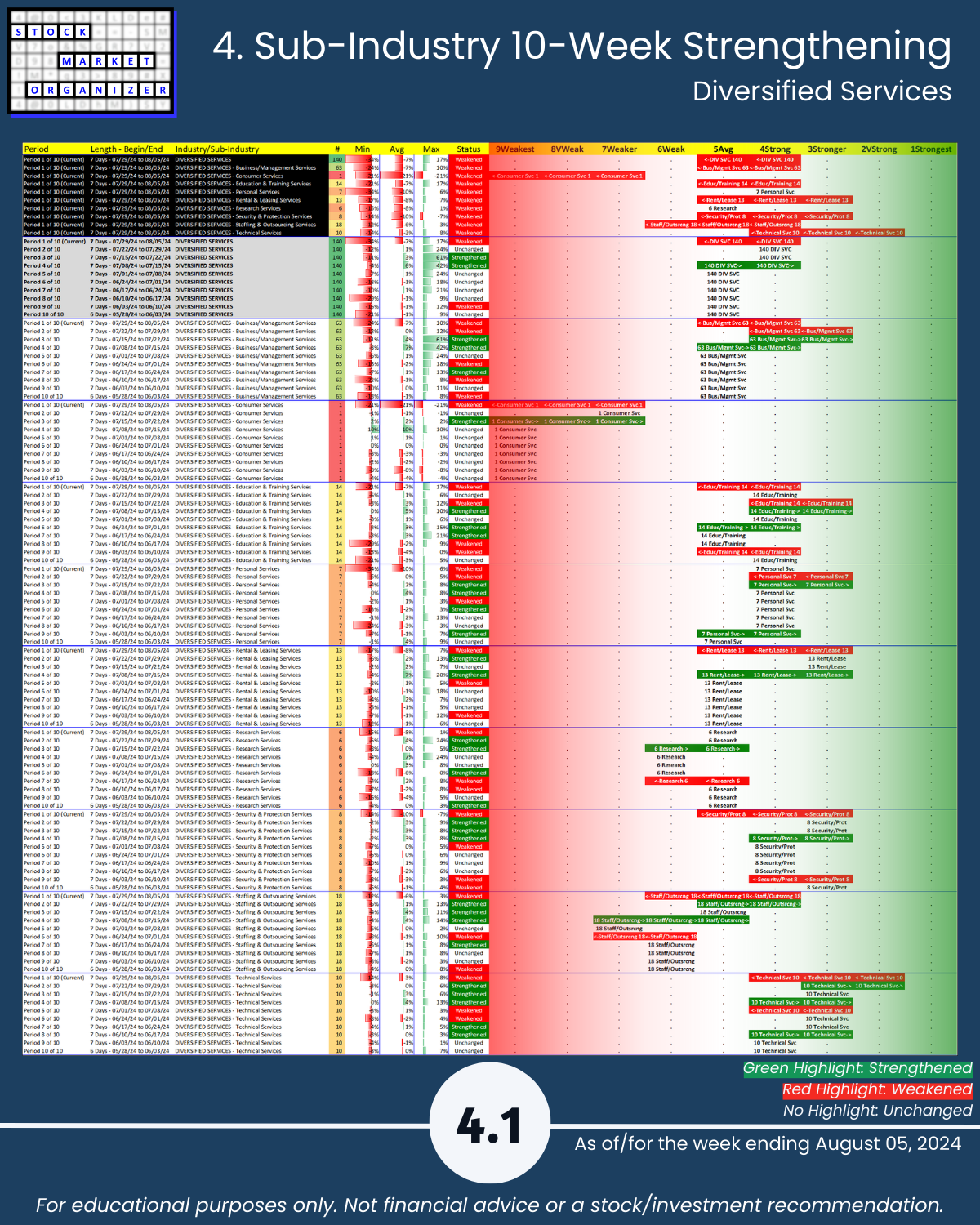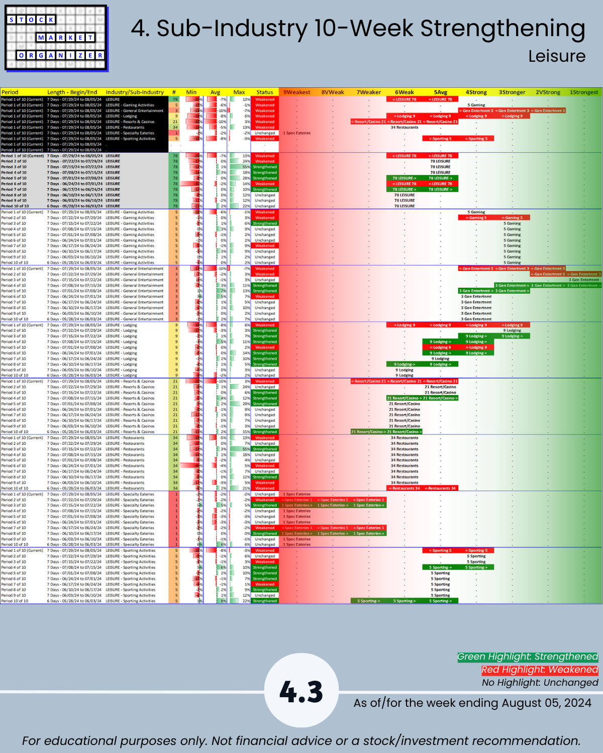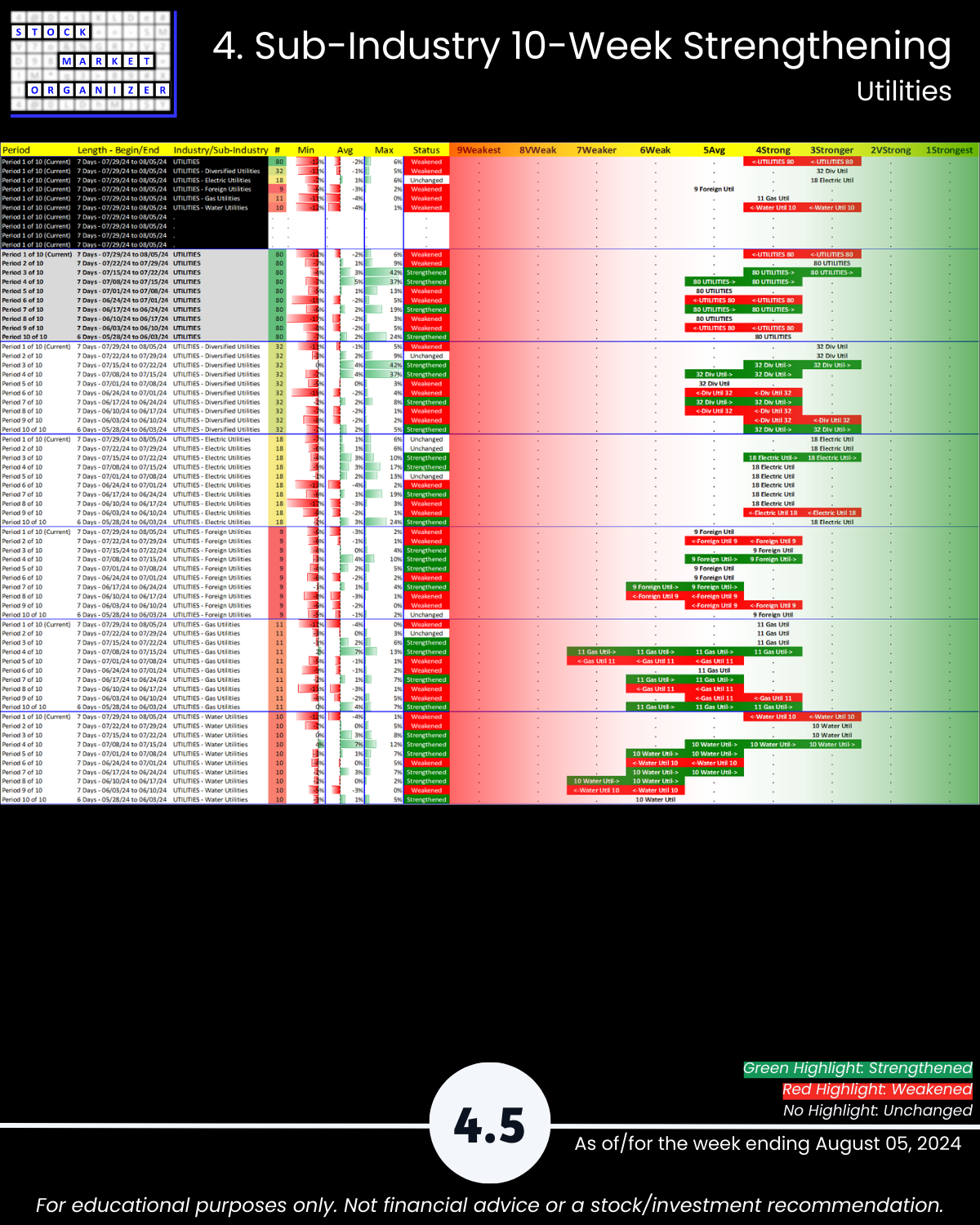 Back to this strength report – this industry grouping weakened significantly over the past week by -1.0 to a 5.0 weighted average strength rating. Much more detail in the attached including a segmenting by sub-industry of the Strongest and Weakest (in Stock Market Organizer parlance) stocks.