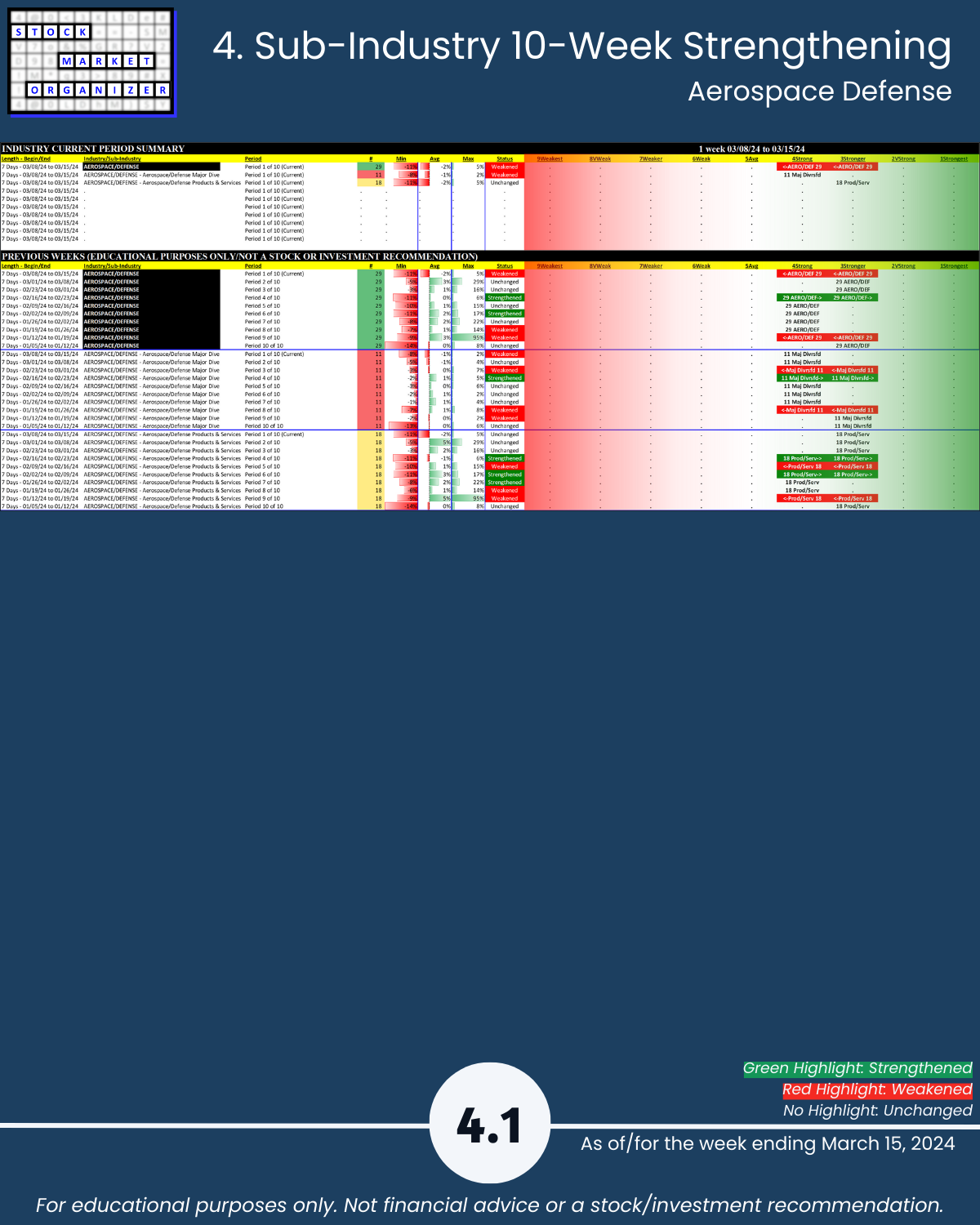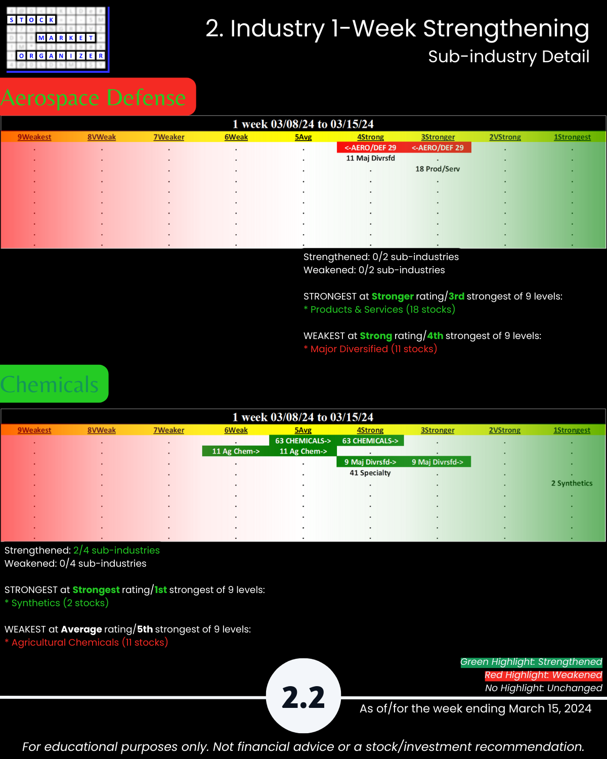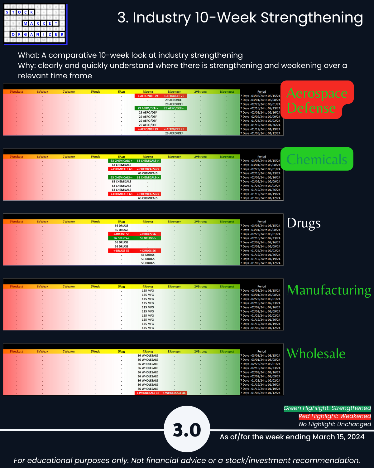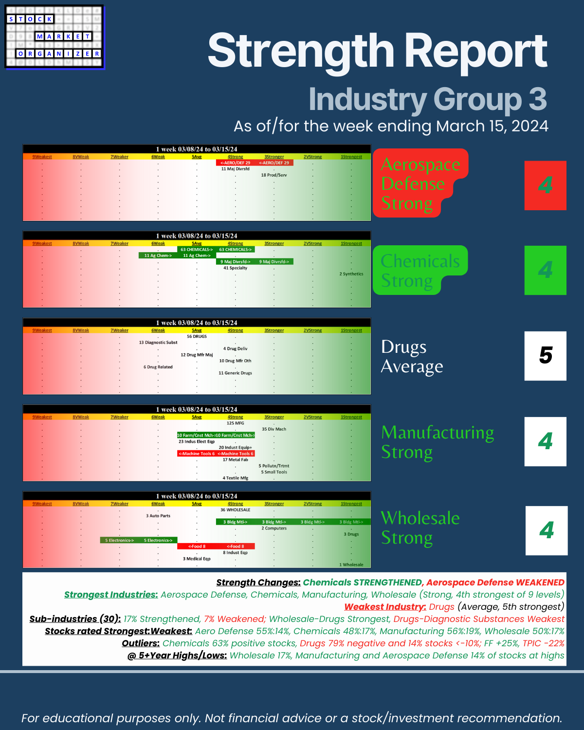 Cats and dogs industry review of Group 3 - Aerospace Defense, Chemicals, Drugs, Manufacturing, and Wholesale including Strongest-/Weakest-rated Stock Market Organizer stocks and objective strengthening/weakening measurements for each industry.