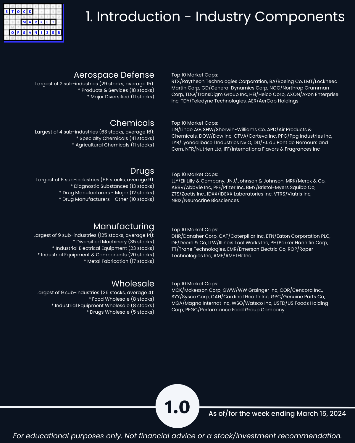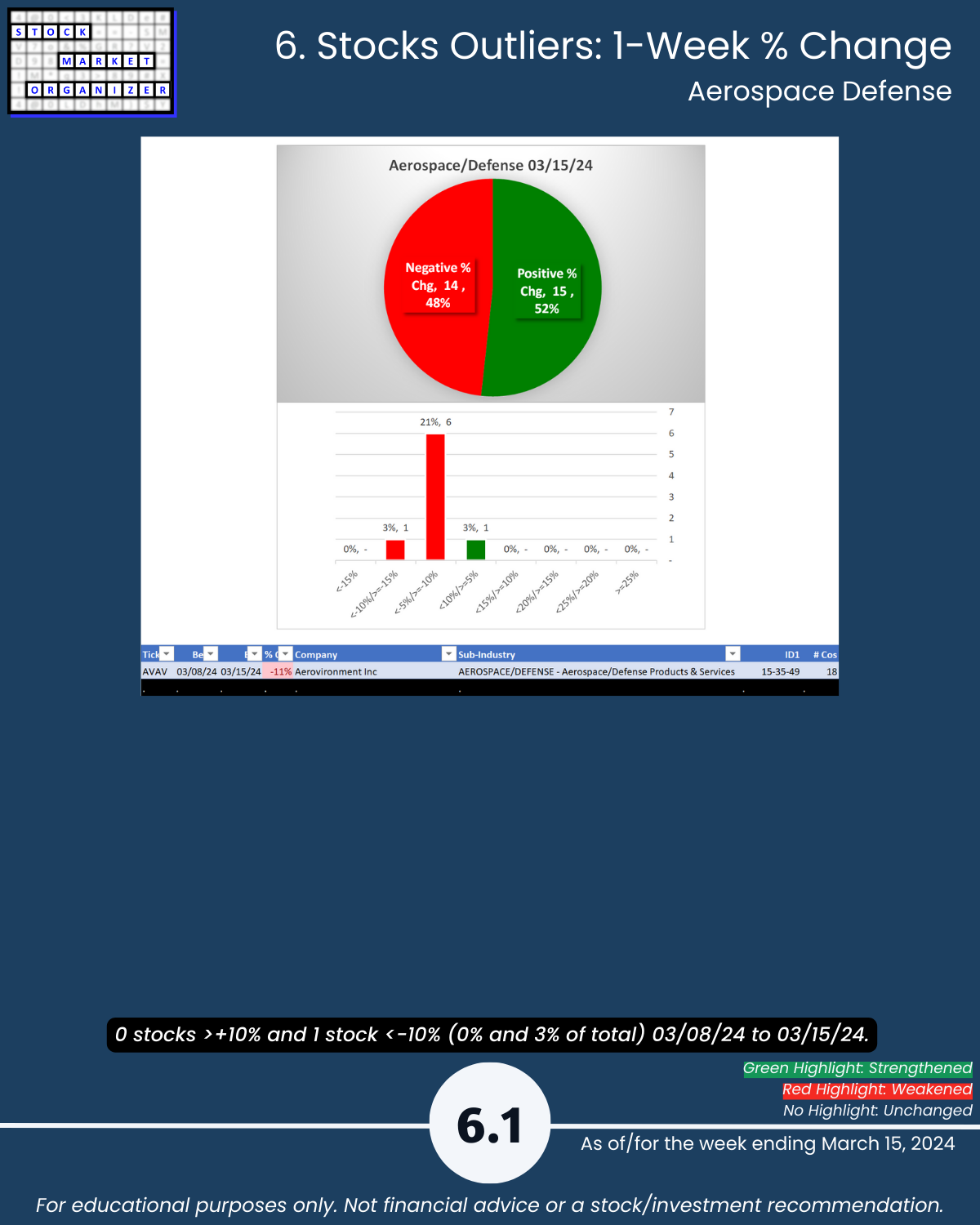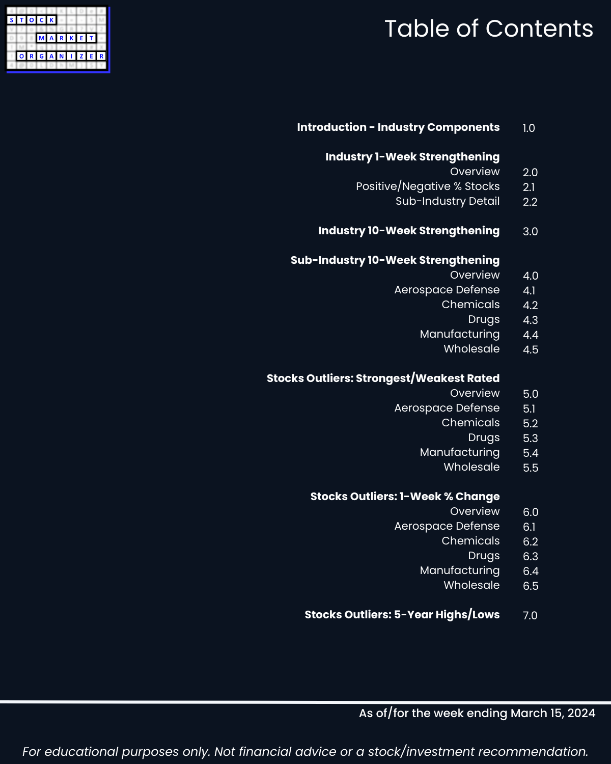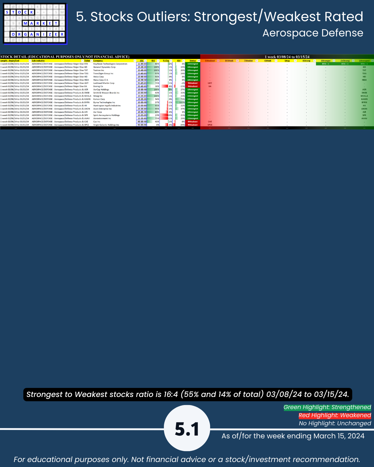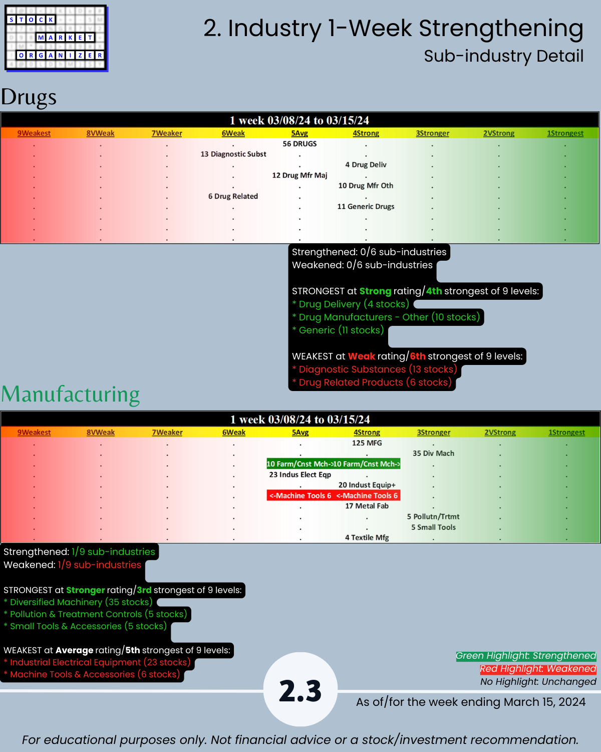 Cats and dogs industry review of Group 3 - Aerospace Defense, Chemicals, Drugs, Manufacturing, and Wholesale including Strongest-/Weakest-rated Stock Market Organizer stocks and objective strengthening/weakening measurements for each industry.