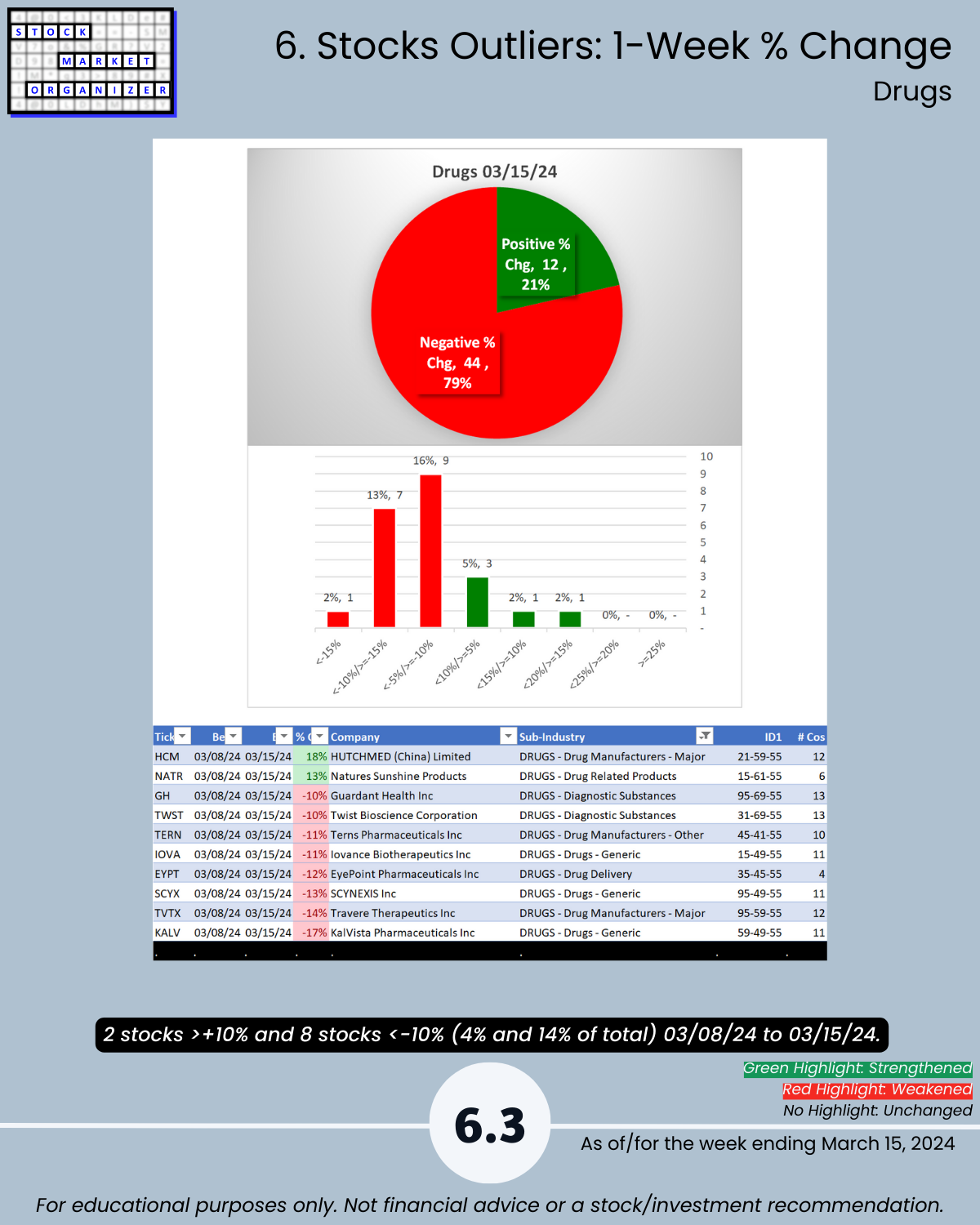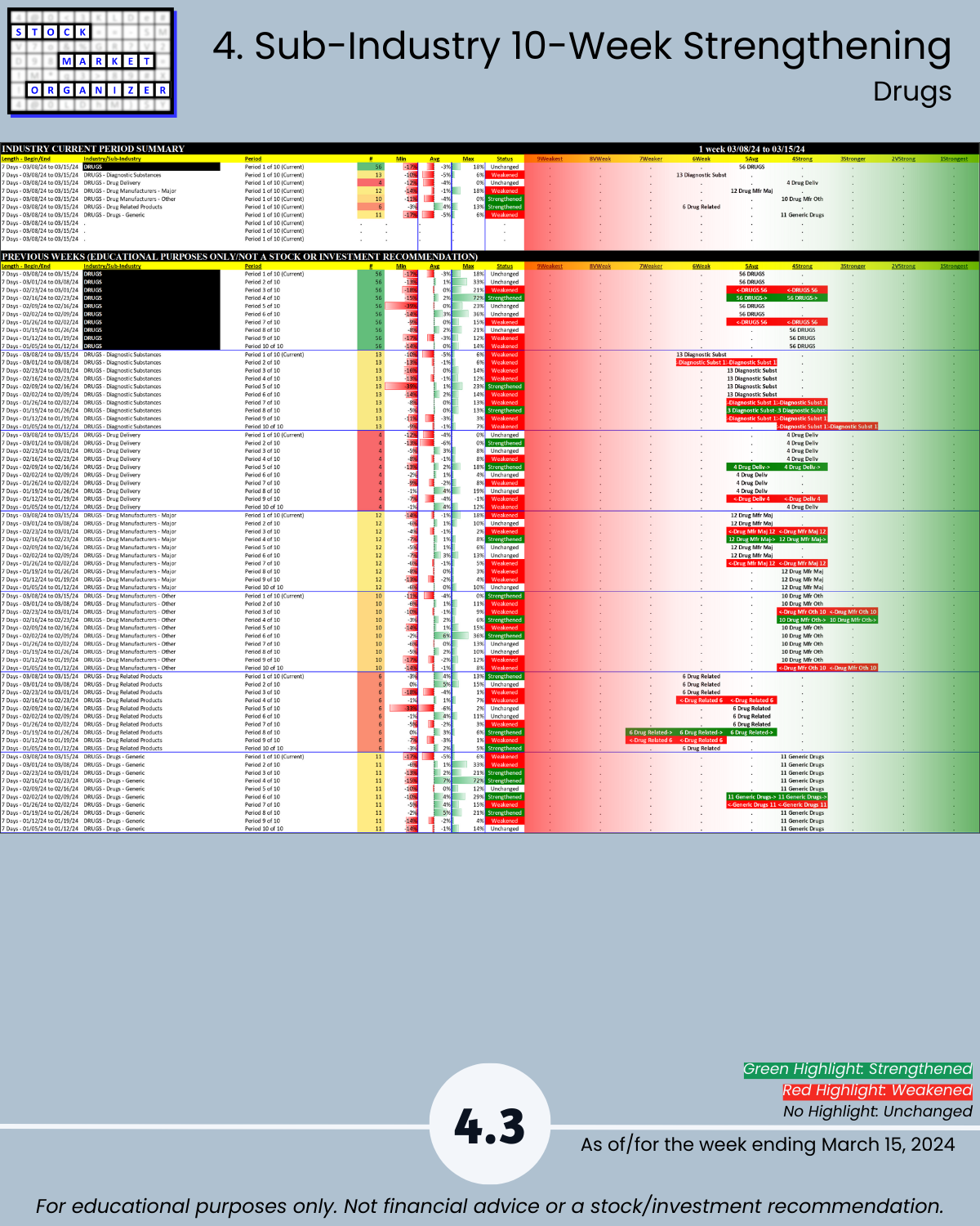 🔹 Sub-industries (30): 17% Strengthened, 7% Weakened; Wholesale-Drugs Strongest, Drugs-Diagnostic Substances Weakest