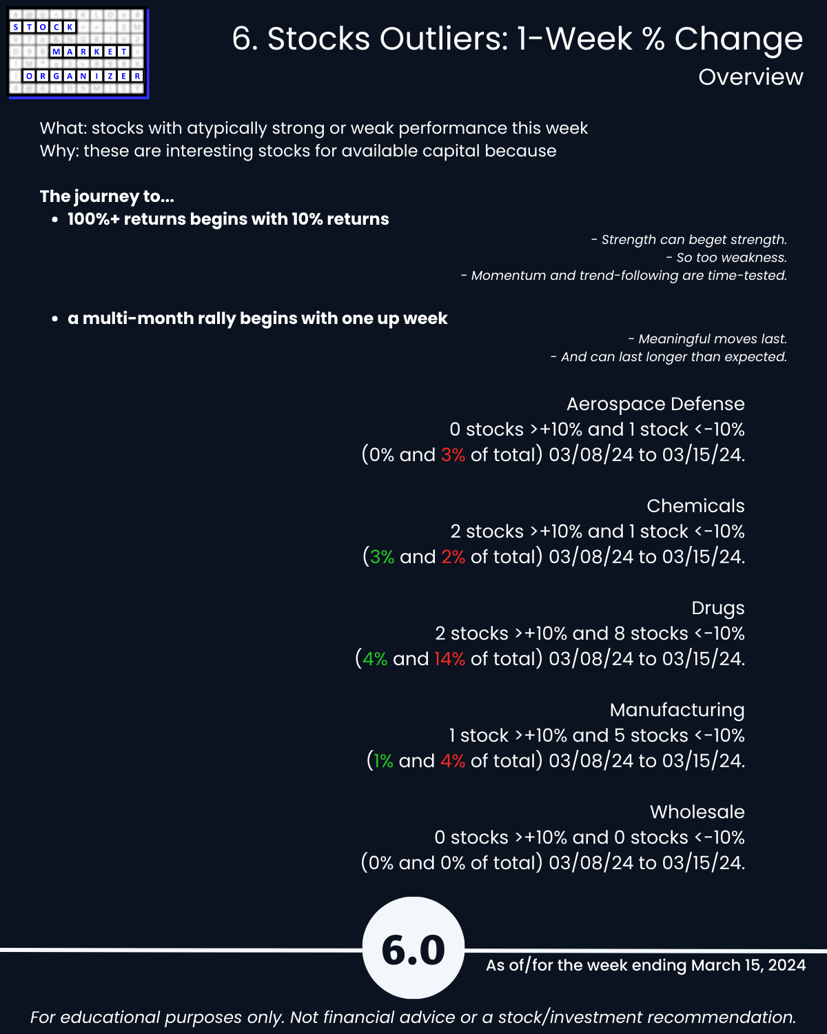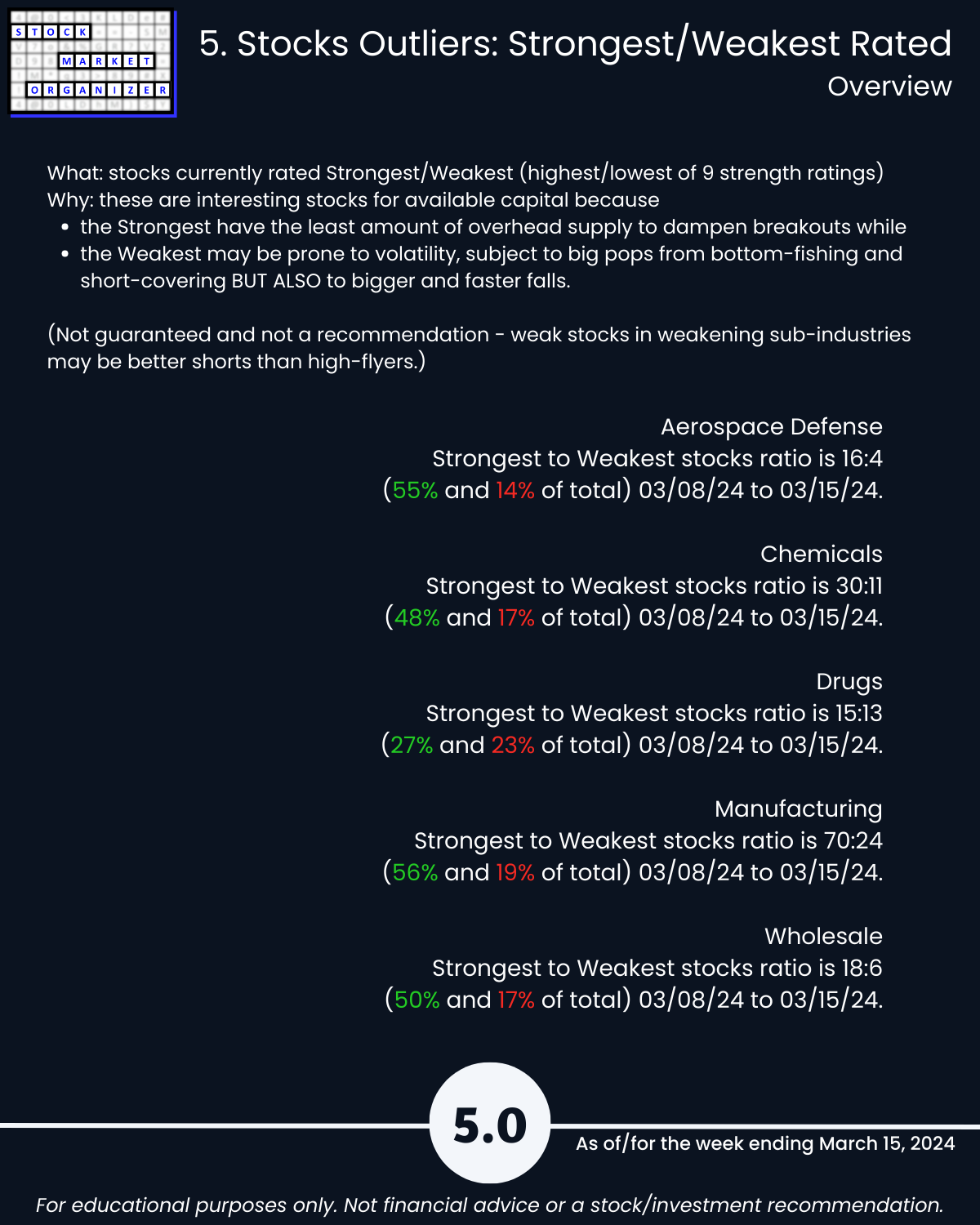 🔹 Stocks rated Strongest:Weakest: Aero Defense 55%:14%, Chemicals 48%:17%, Manufacturing 56%:19%, Wholesale 50%:17%