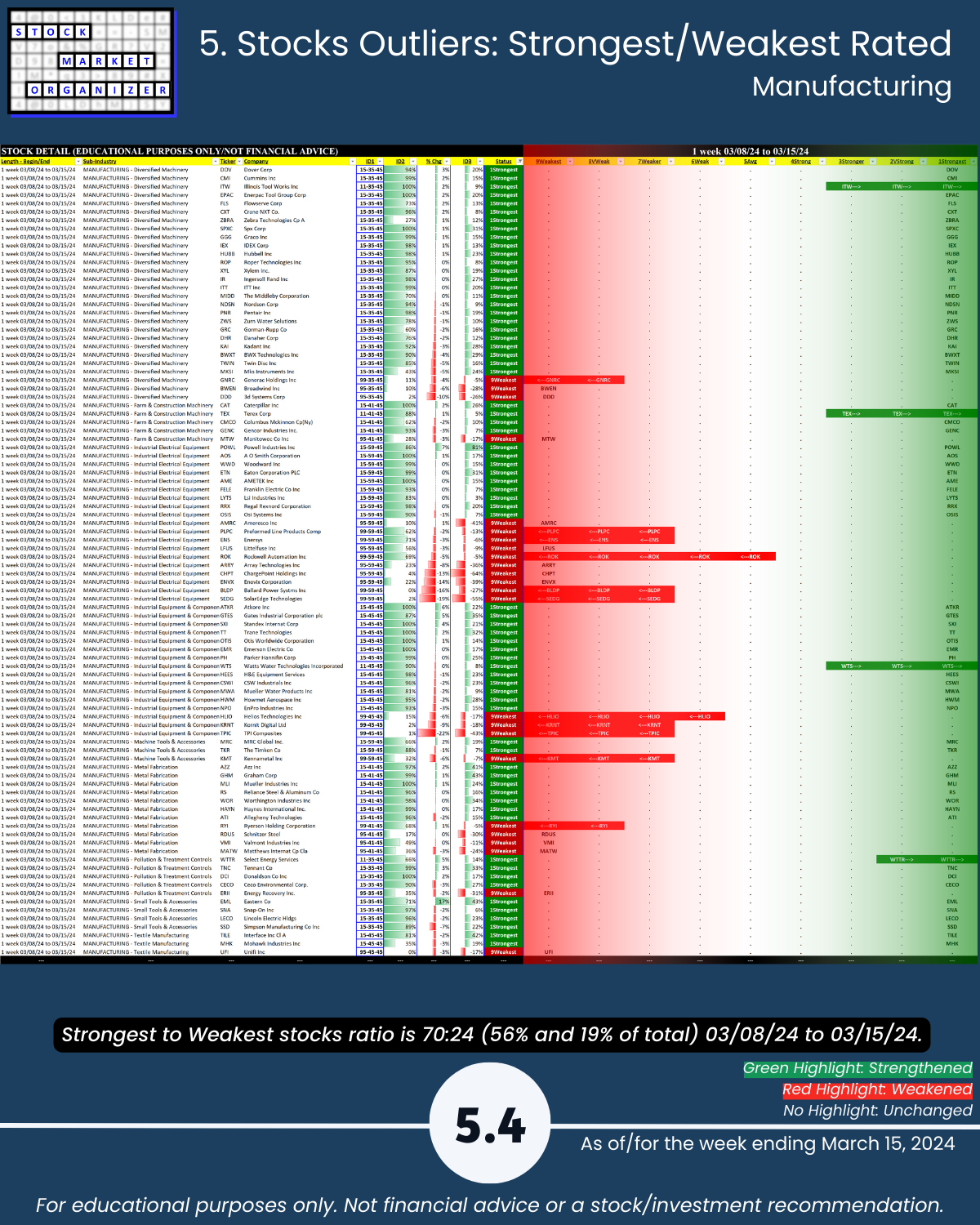 What you probably didn’t know, U.S. stock market strength 3/15/24 Group 3 industries: Manufacturing industry = strong. 🔹 1-year leader POWL +293% 🔹 1-year 32% of the industry’s stocks >40% 🔹 56% of its stocks rated Strongest (highest of 9 strength levels) 🔹 14% of its 125 stocks at 5+ year highs w/1-year 43% average returns (range +17% to +76%).