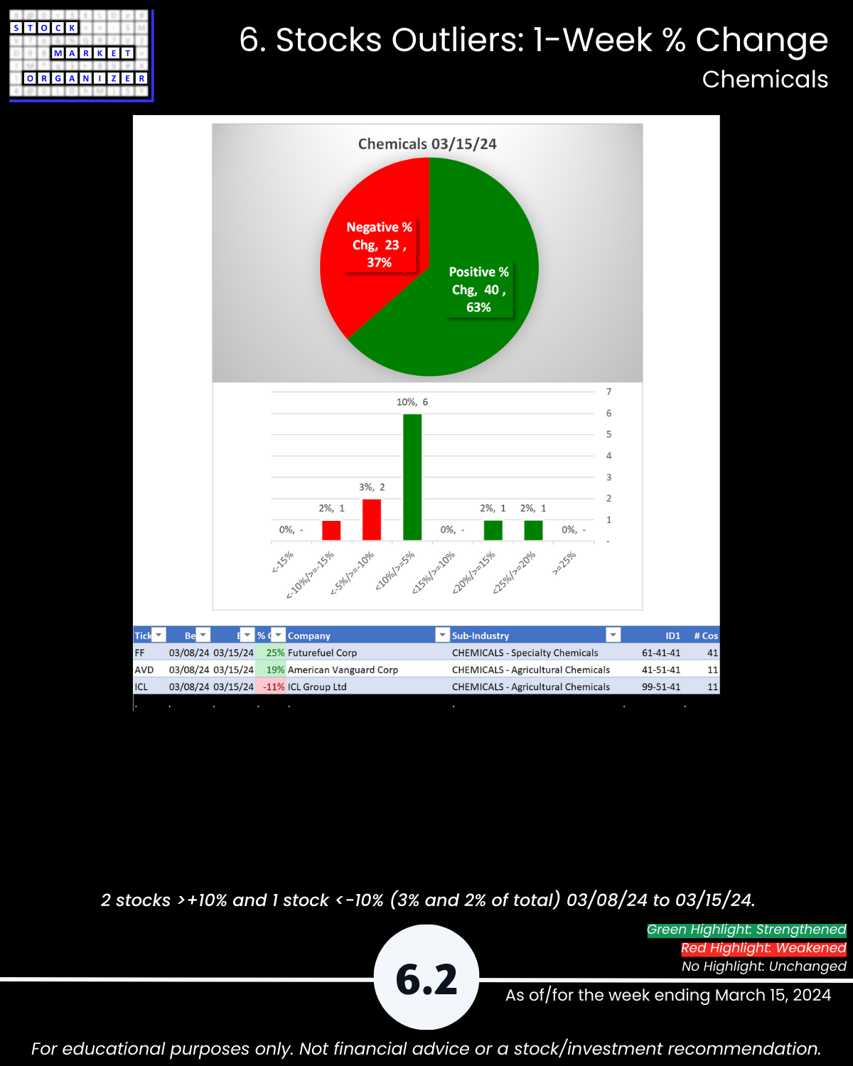 🔹 How all stocks in each sub-industry and industry stack up against each other in terms of current strengthening and weakening. These relationships may not continue, but it’s hard to meaningfully discern where you could go if you don’t know where you currently are. This analysis enables you to quickly see the best and worst stocks and ignore the rest.
