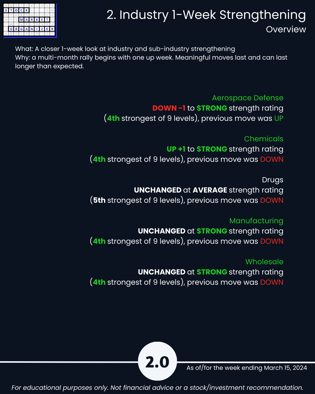 🔹 Strongest Industries: Aerospace Defense, Chemicals, Manufacturing, Wholesale (Strong, 4th strongest of 9 levels)
