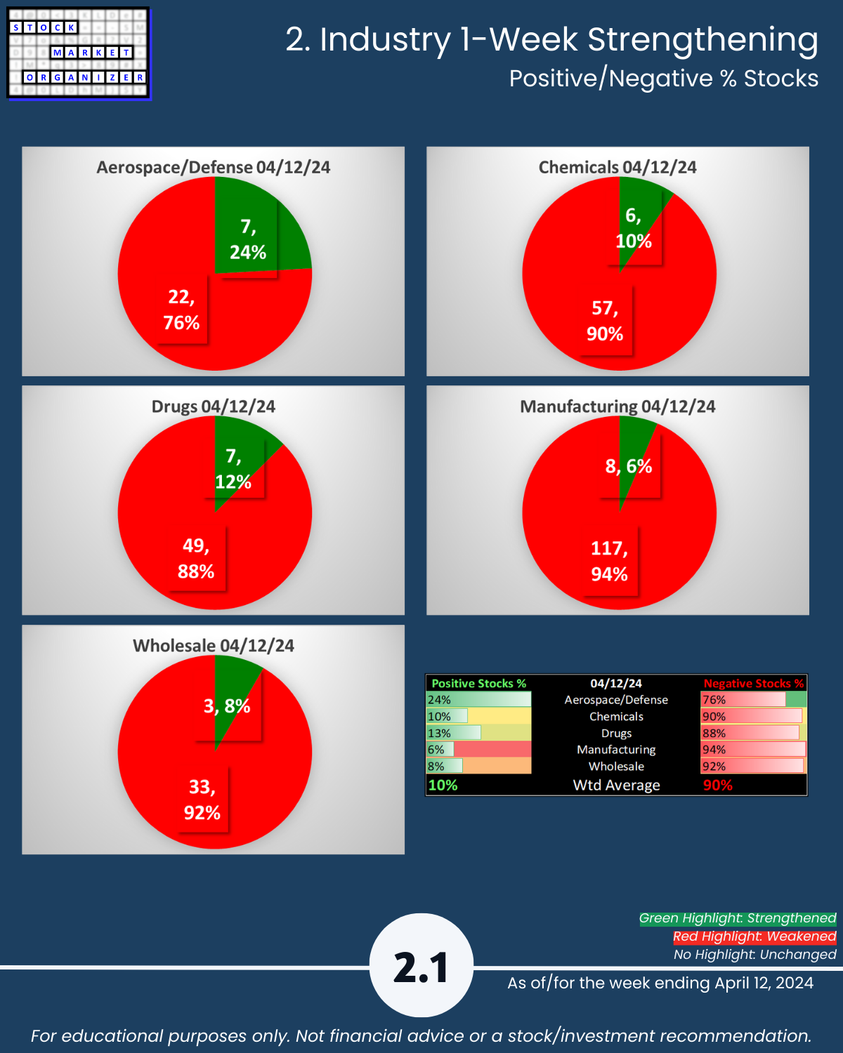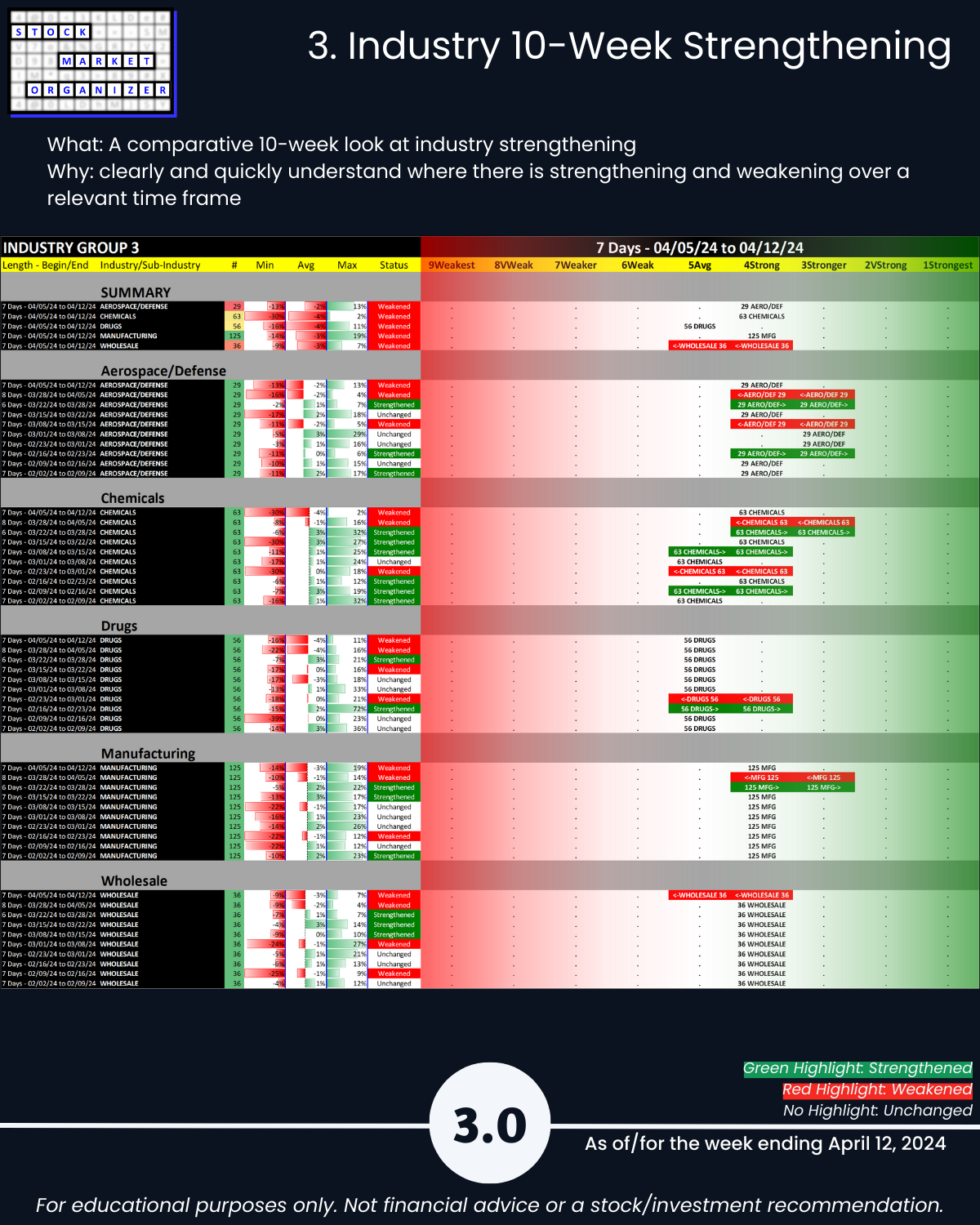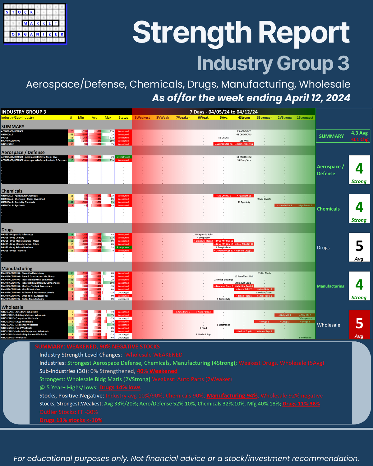 Last report before full market report 4/12/24 – Industry Group 3, Aerospace Defense, Chemicals, Drugs, Manufacturing, and Wholesale. Unique U.S. Stock Market strength-based insights: 🔹 Drugs has 14% of its stocks at 5+ year lows, a poor 11%:38% ratio of 1Strongest:9Weakest stocks, and 12% of its stocks dropping more than -10% 🔹 90% average negative stocks with Manufacturing 94%, Wholesale 92%, and Chemicals 90% 🔹 40% weakening sub-industries with none strengthening.