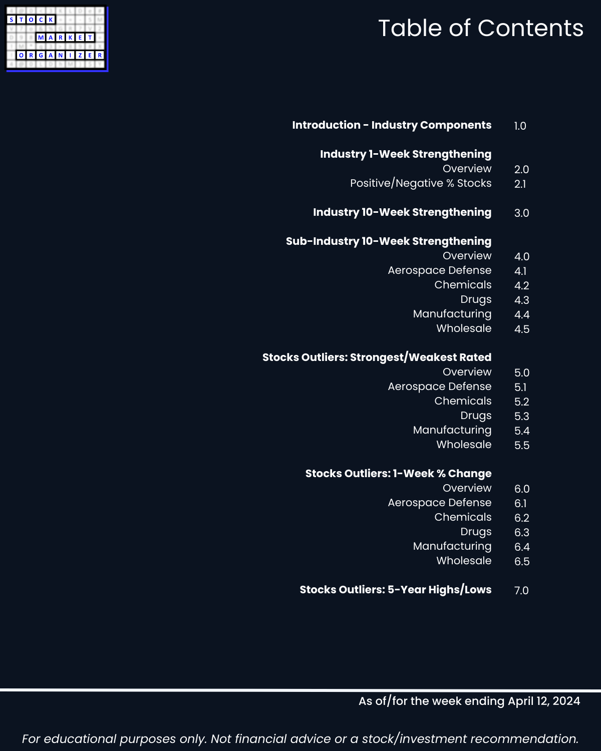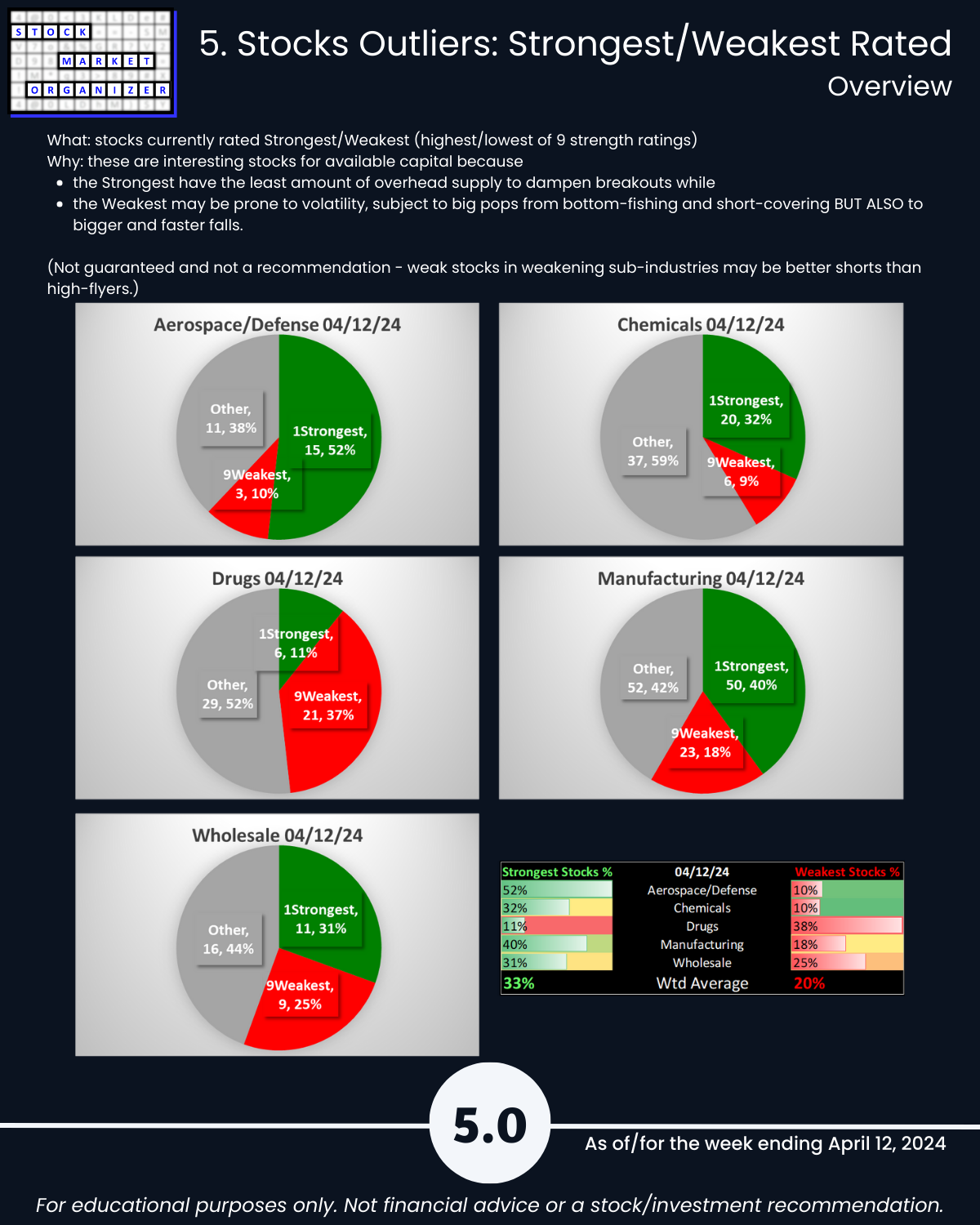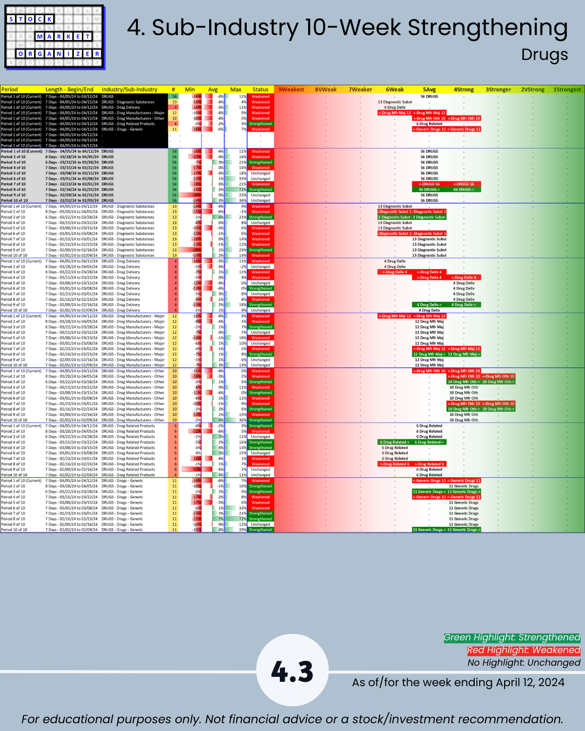 Last report before full market report 4/12/24 – Industry Group 3, Aerospace Defense, Chemicals, Drugs, Manufacturing, and Wholesale. Unique U.S. Stock Market strength-based insights: 🔹 Drugs has 14% of its stocks at 5+ year lows, a poor 11%:38% ratio of 1Strongest:9Weakest stocks, and 12% of its stocks dropping more than -10% 🔹 90% average negative stocks with Manufacturing 94%, Wholesale 92%, and Chemicals 90% 🔹 40% weakening sub-industries with none strengthening.