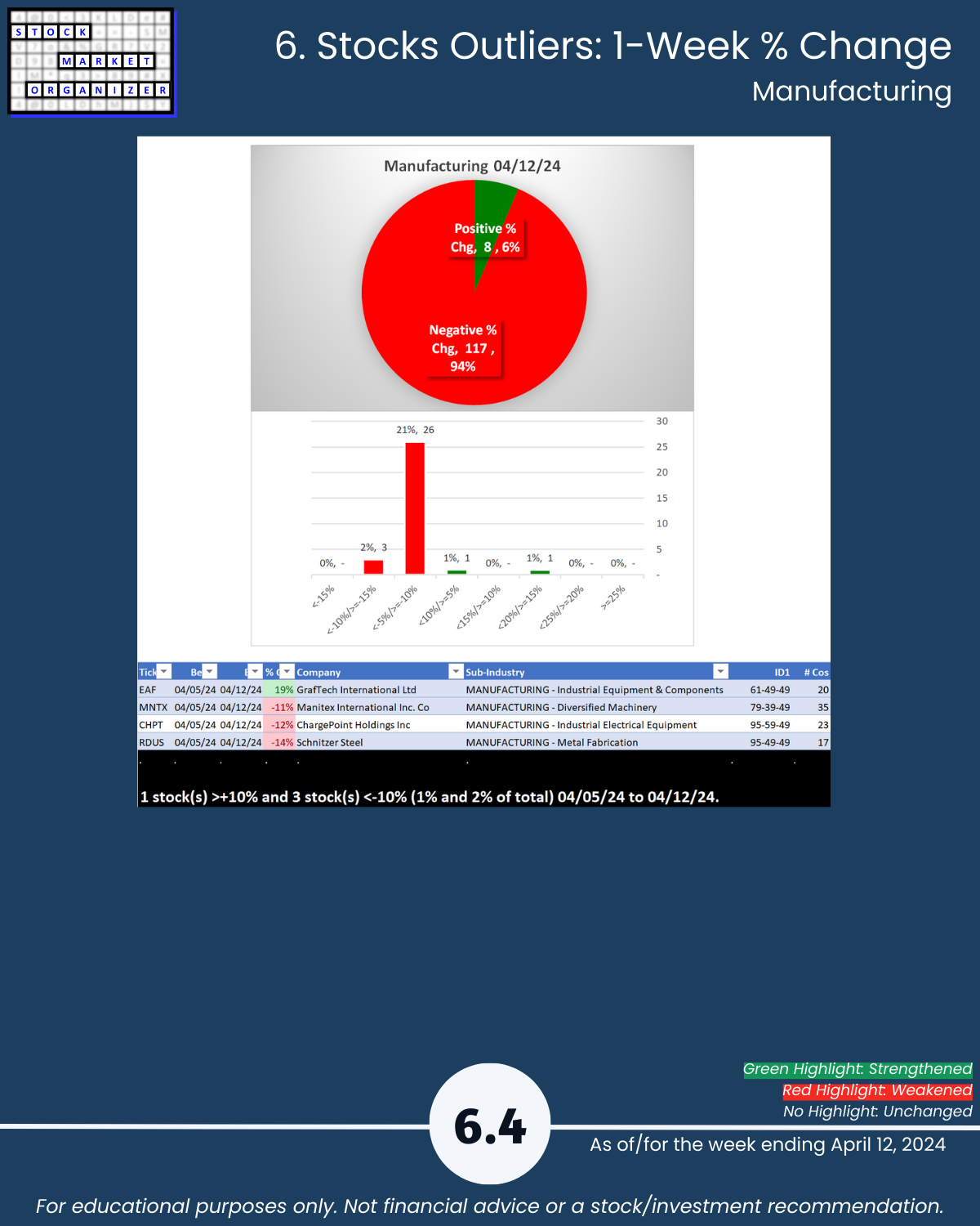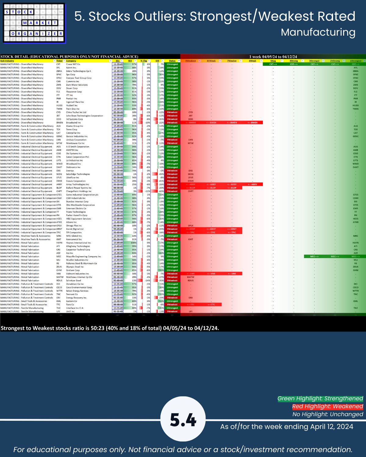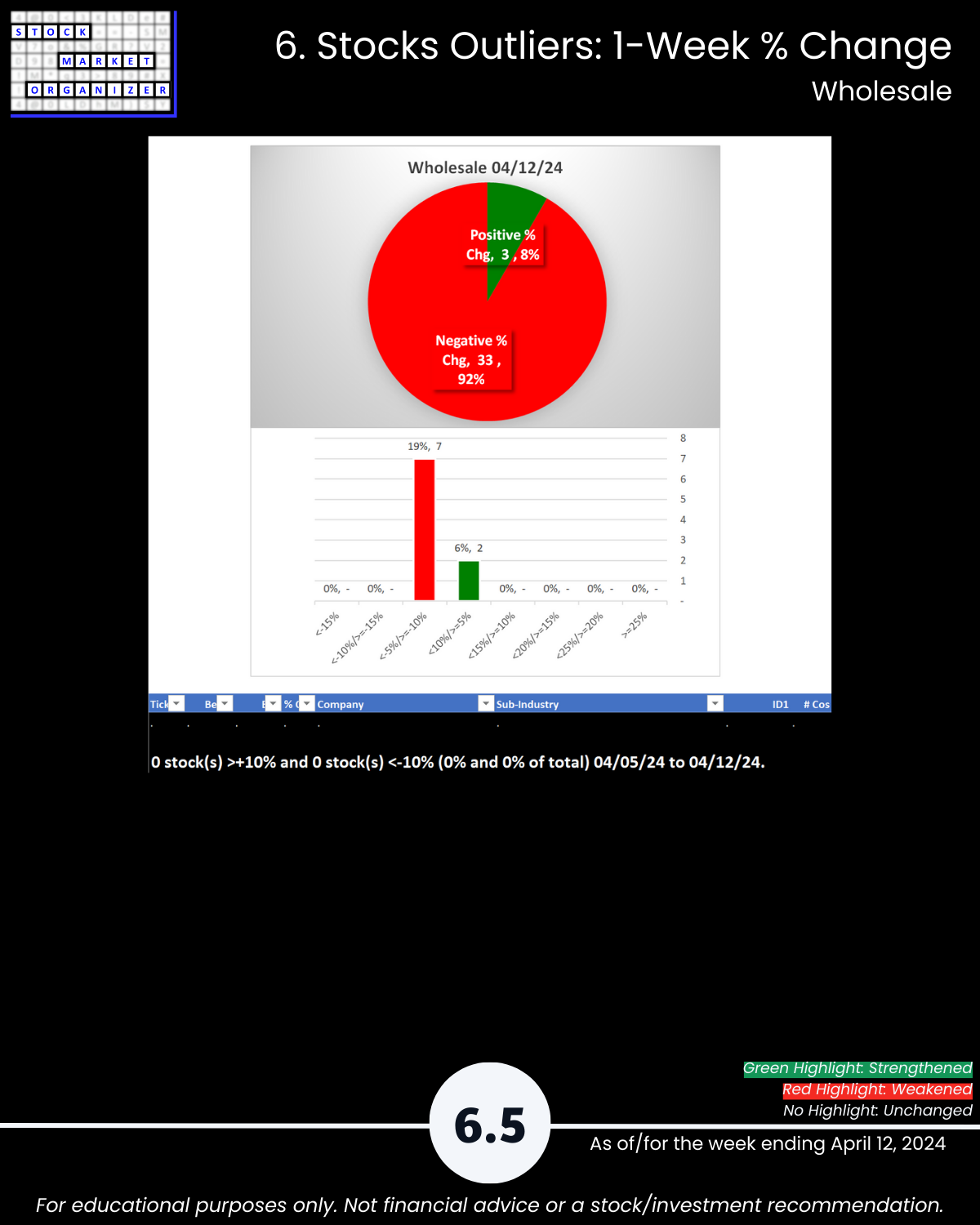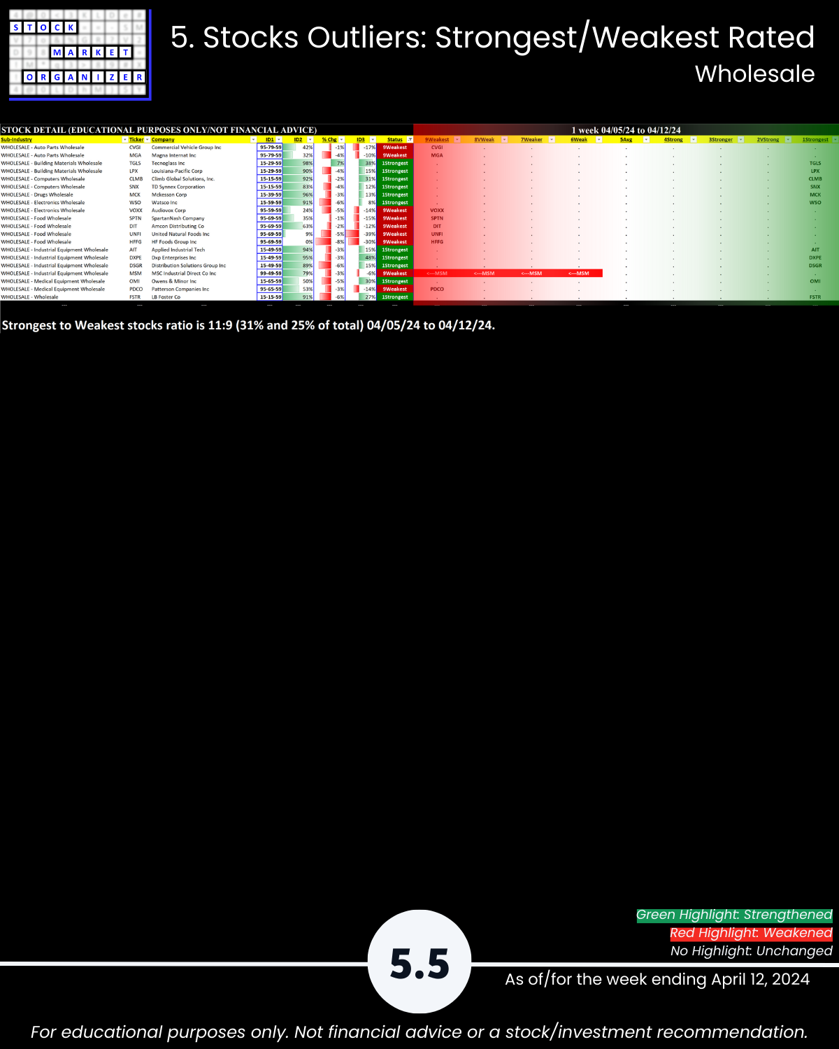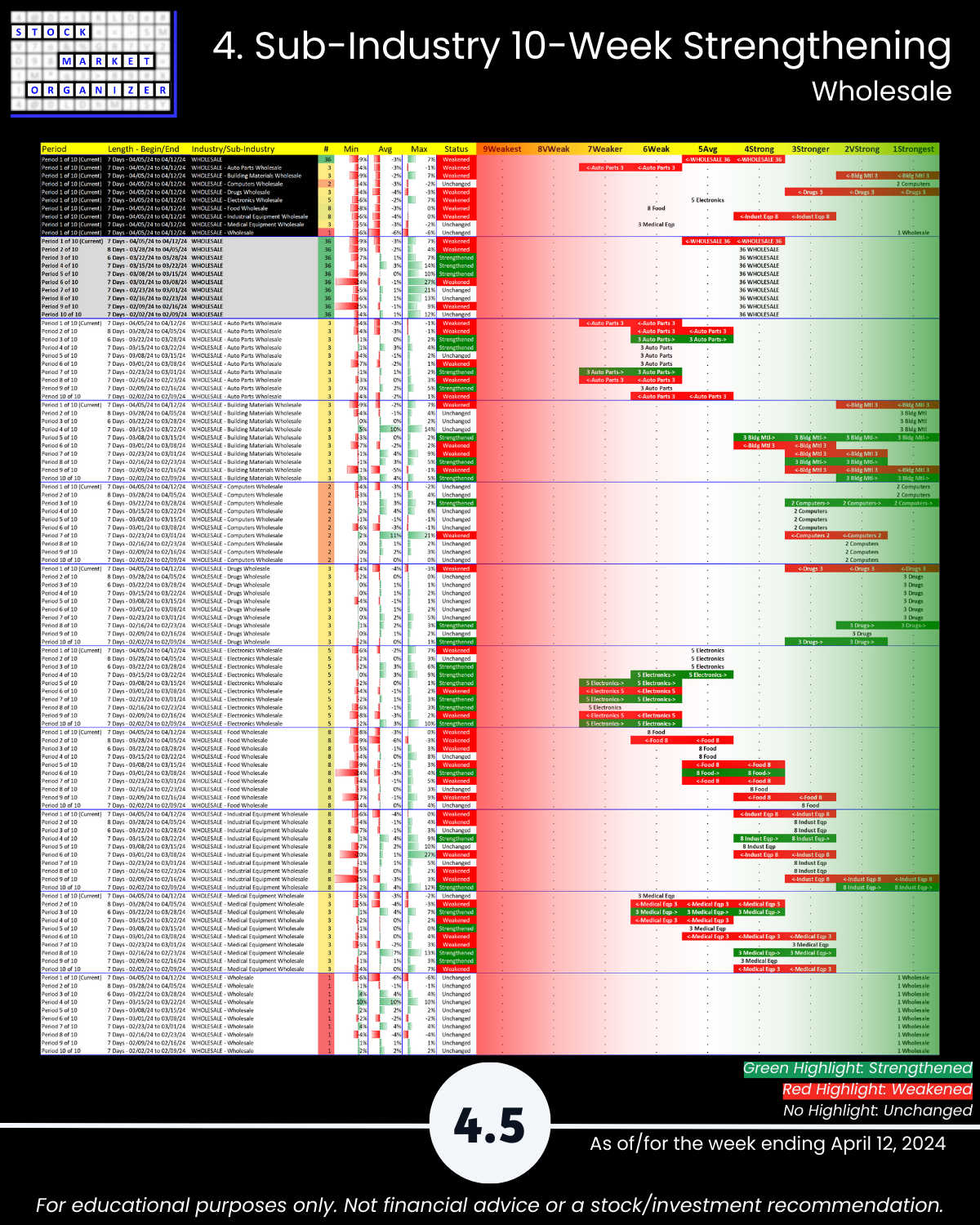 - Strongest: Wholesale Bldg Matls (2VStrong) Weakest: Auto Parts (7Weaker)