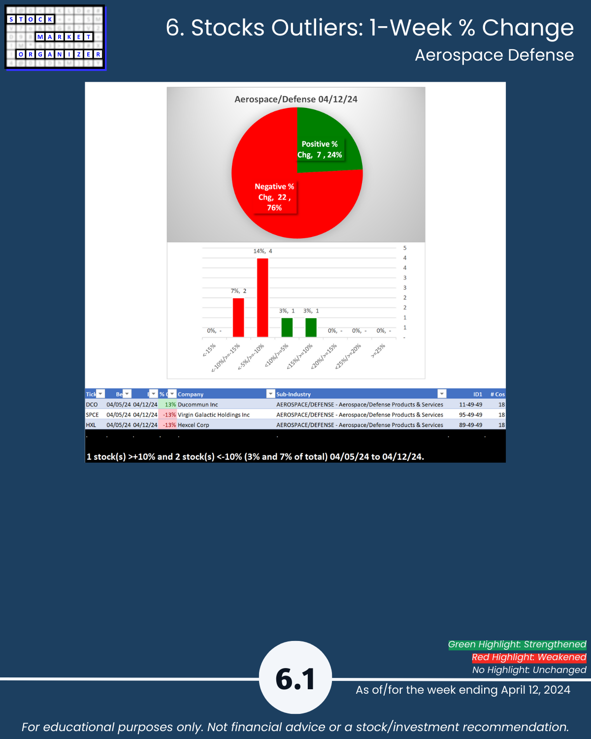 - Strongest:Weakest: Avg 33%/20%; Aero/Defense 52%:10%, Chemicals 32%:10%, Mfg 40%:18%; Drugs 11%:38%