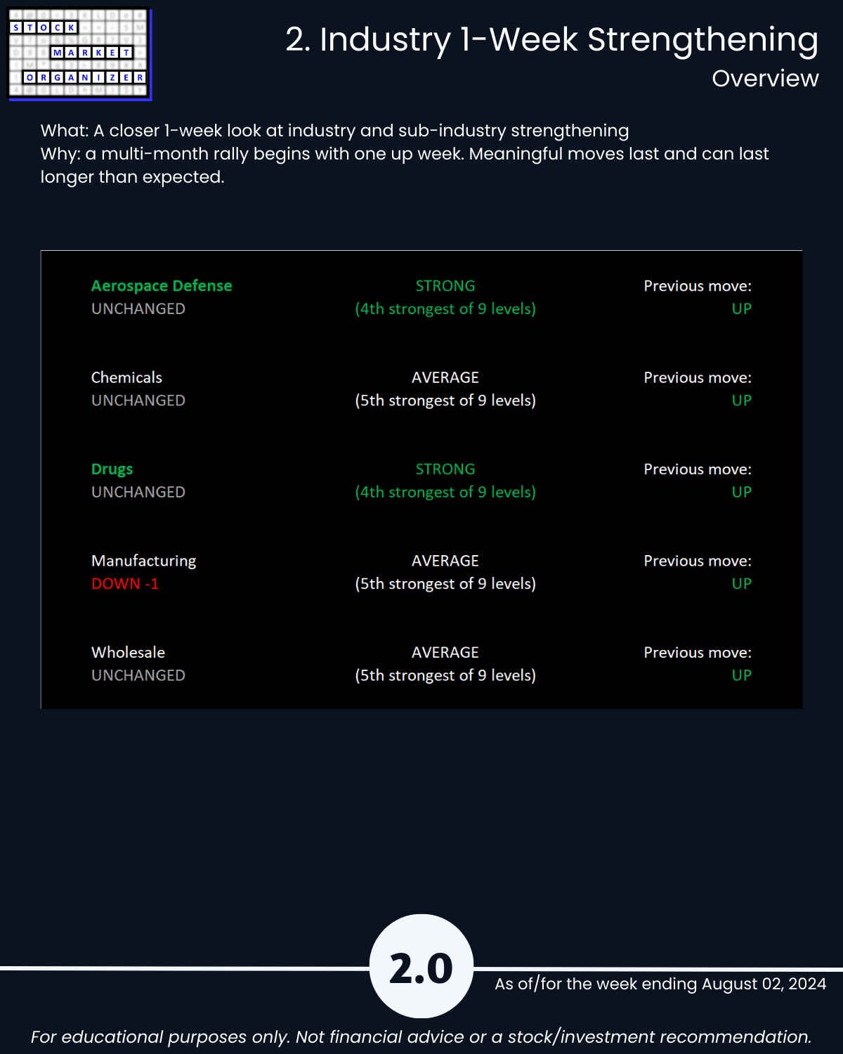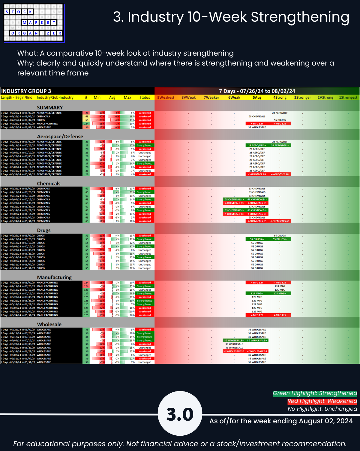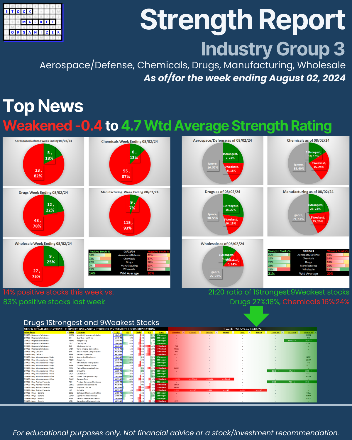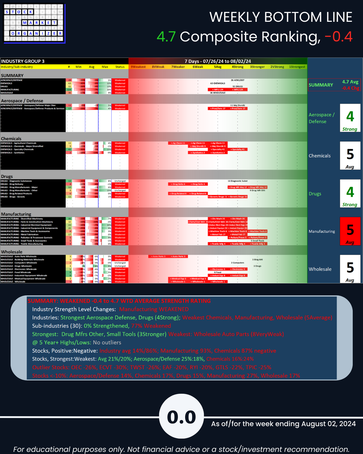 As the Nikkei goes through its biggest 2 day drop ever, here’s the 8/2/24 Stock Market Organizer Industry Group 3 strength report (Aerospace Defense, Chemicals, Drugs, Manufacturing, and Wholesale). Weakened slightly by -0.4 to a 4.7 weighted average strength rating. Much more detail in the attached including a segmenting by sub-industry of the Strongest and Weakest (in Stock Market Organizer parlance) stocks.