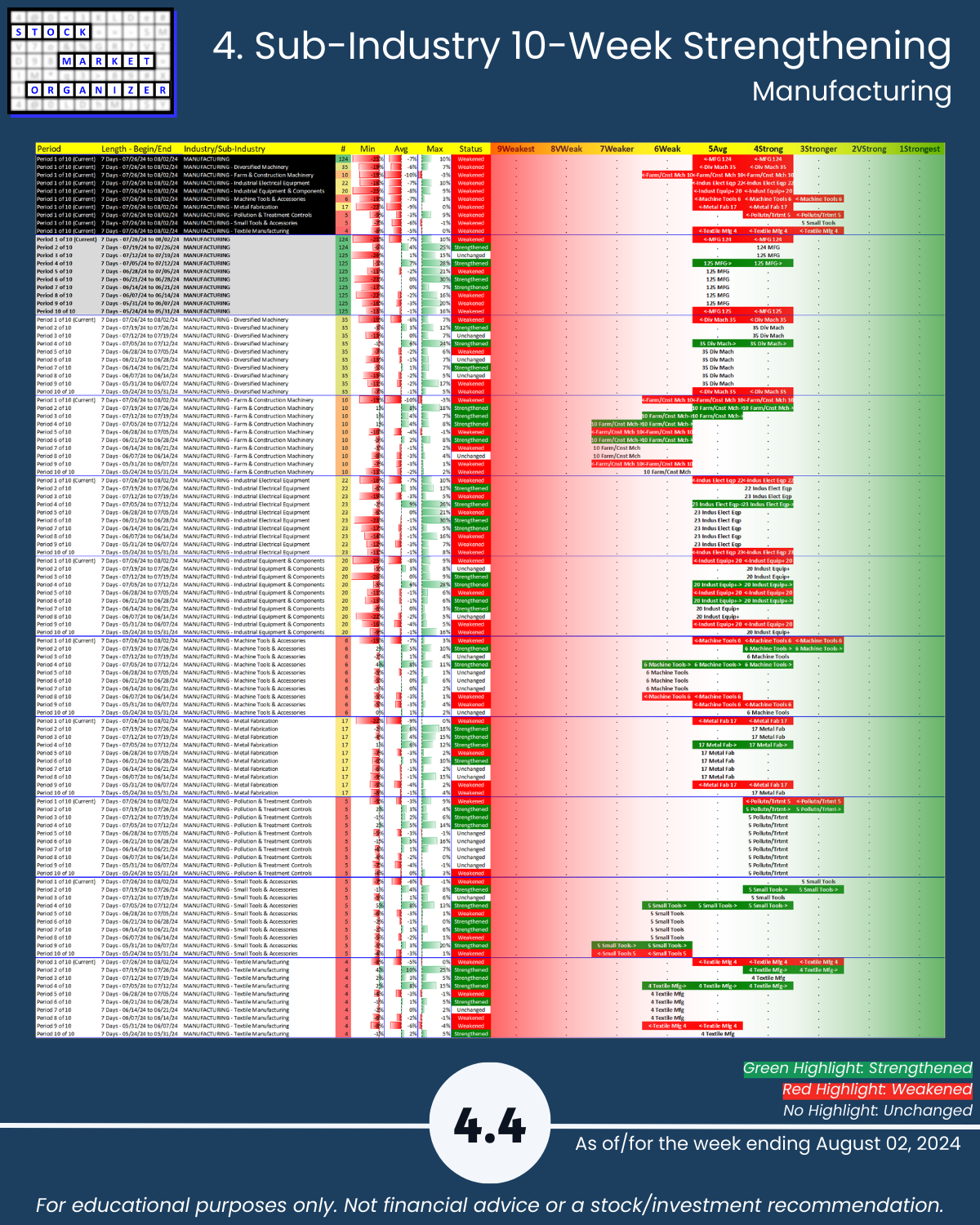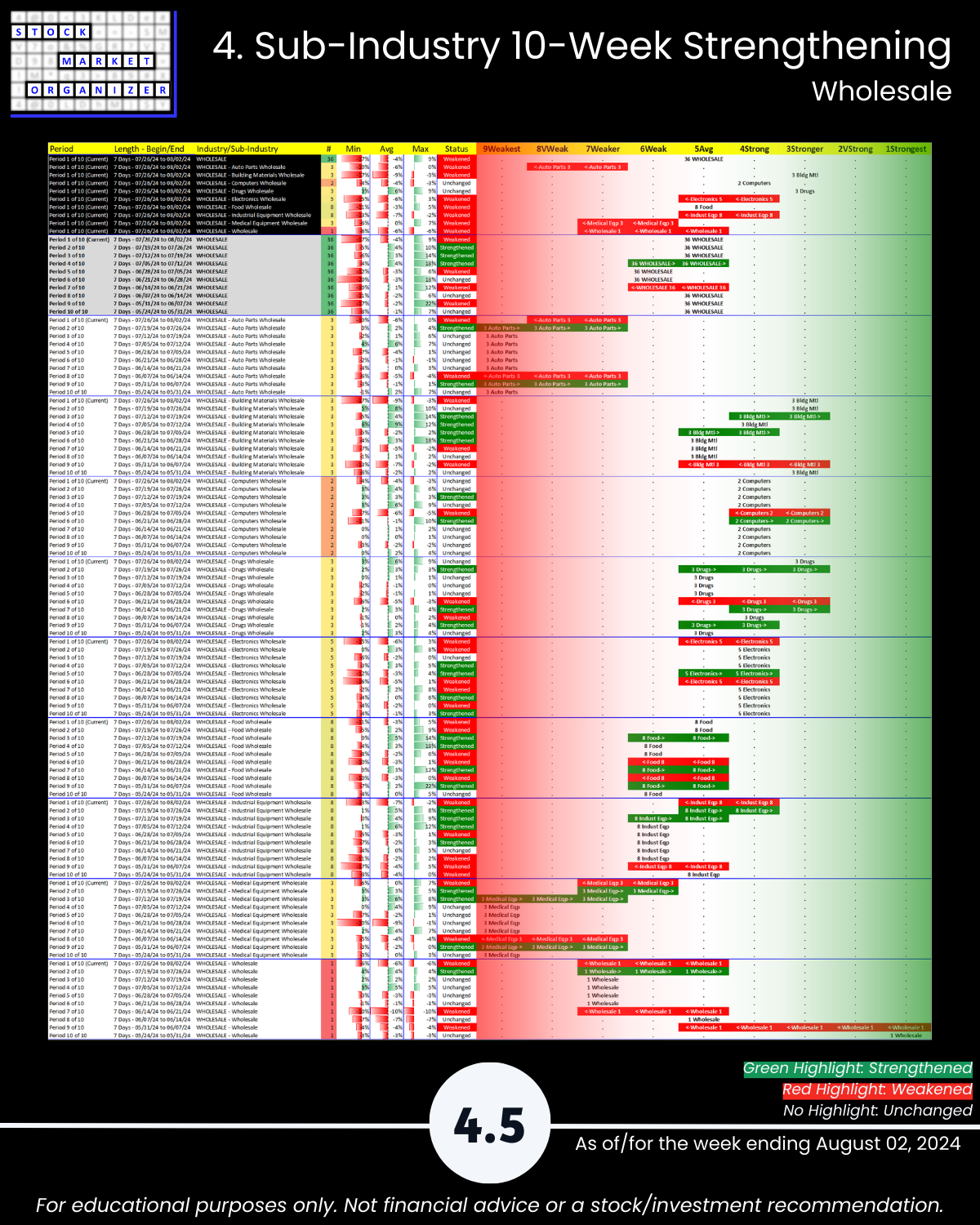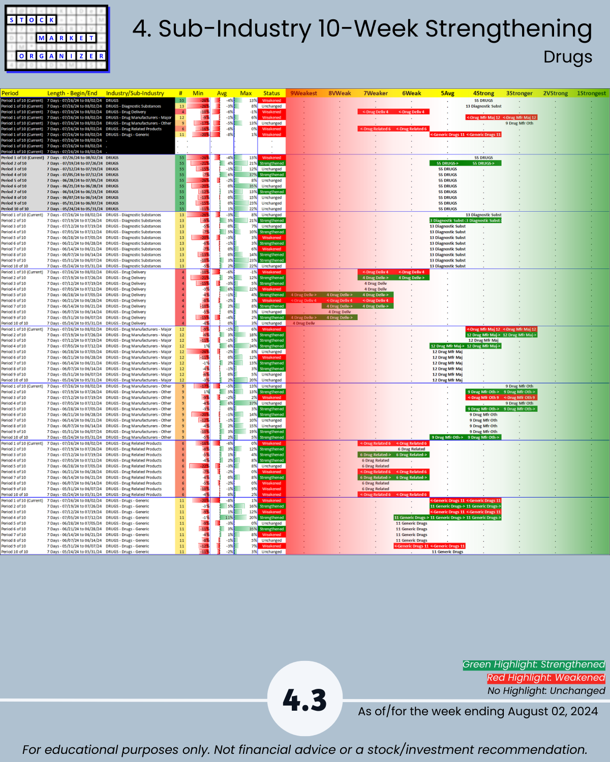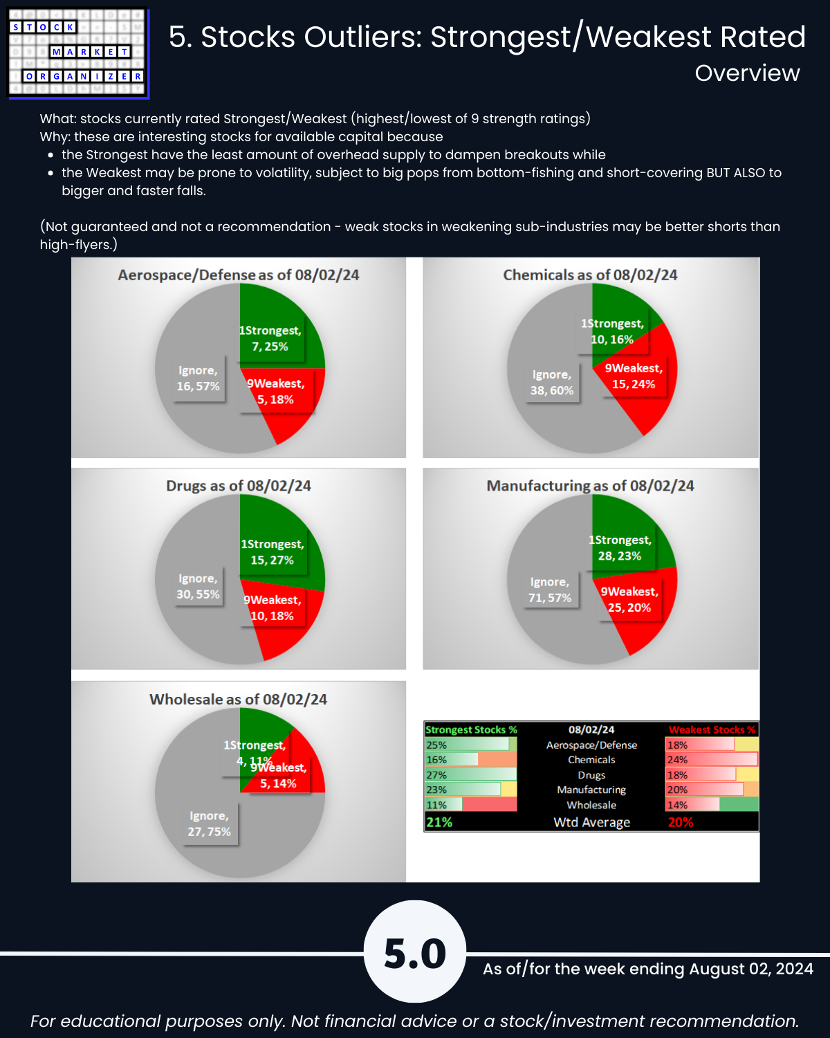 As the Nikkei goes through its biggest 2 day drop ever, here’s the 8/2/24 Stock Market Organizer Industry Group 3 strength report (Aerospace Defense, Chemicals, Drugs, Manufacturing, and Wholesale). Weakened slightly by -0.4 to a 4.7 weighted average strength rating. Much more detail in the attached including a segmenting by sub-industry of the Strongest and Weakest (in Stock Market Organizer parlance) stocks.