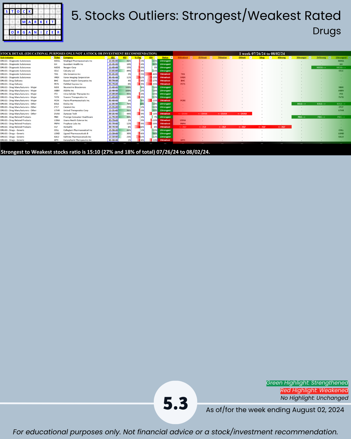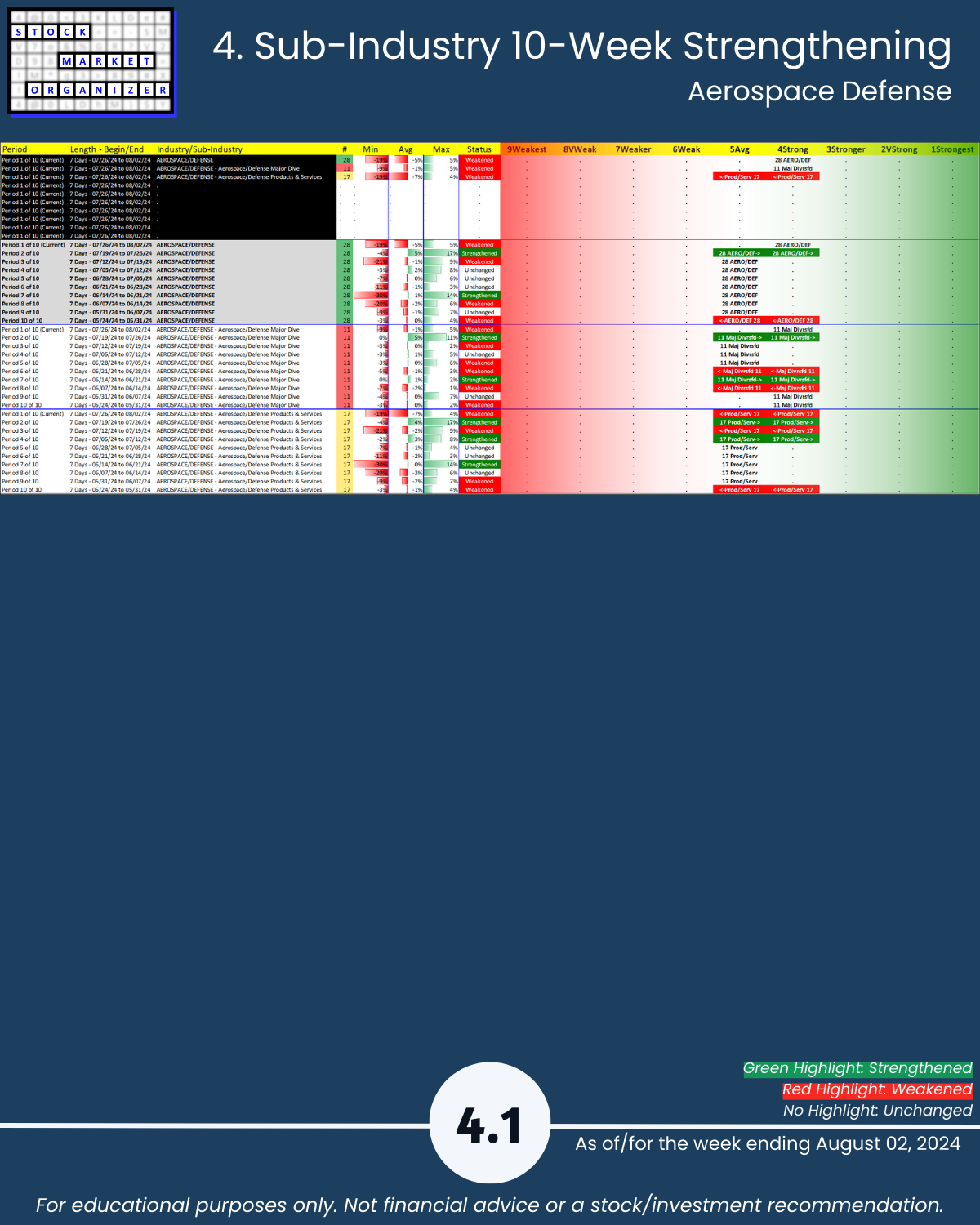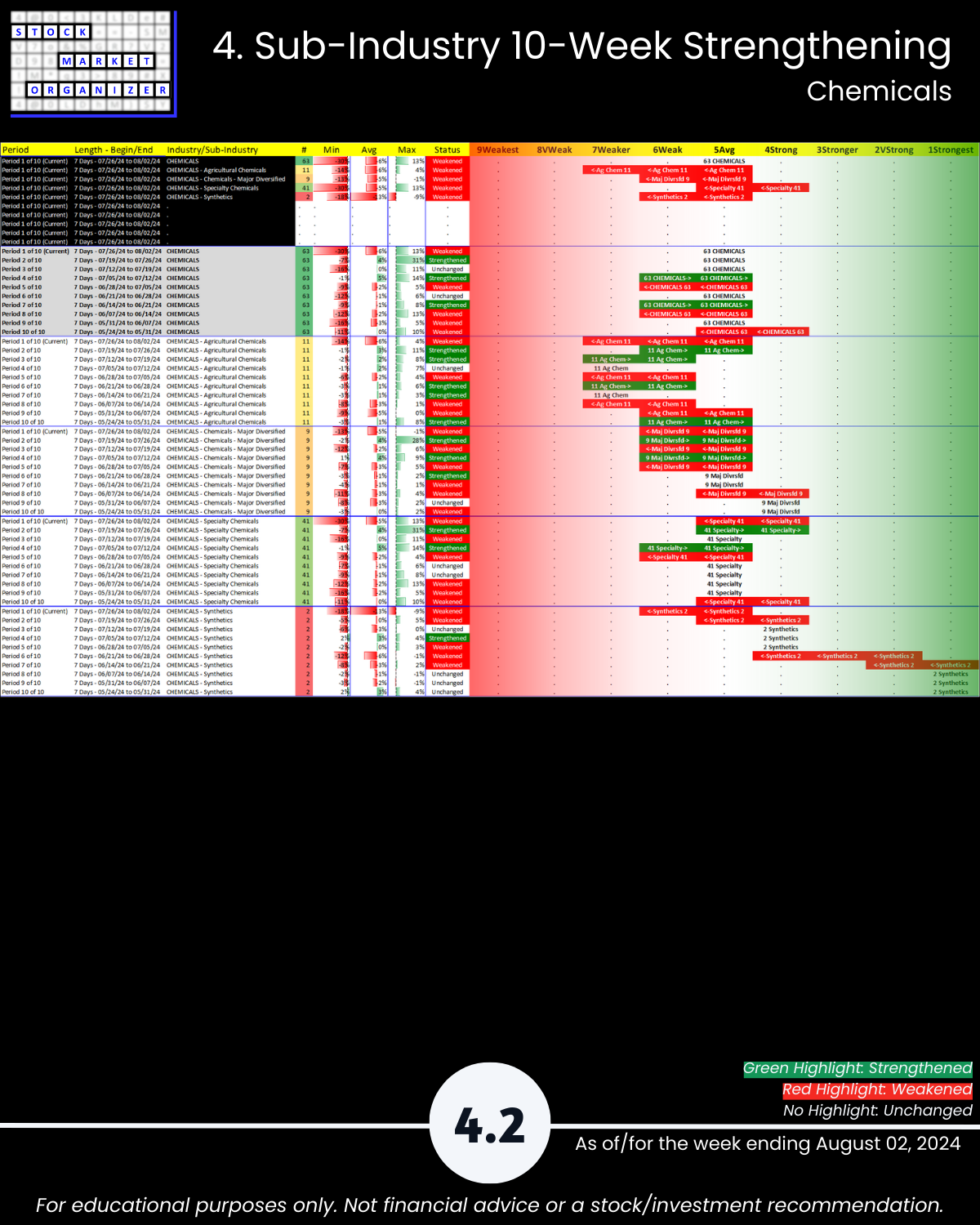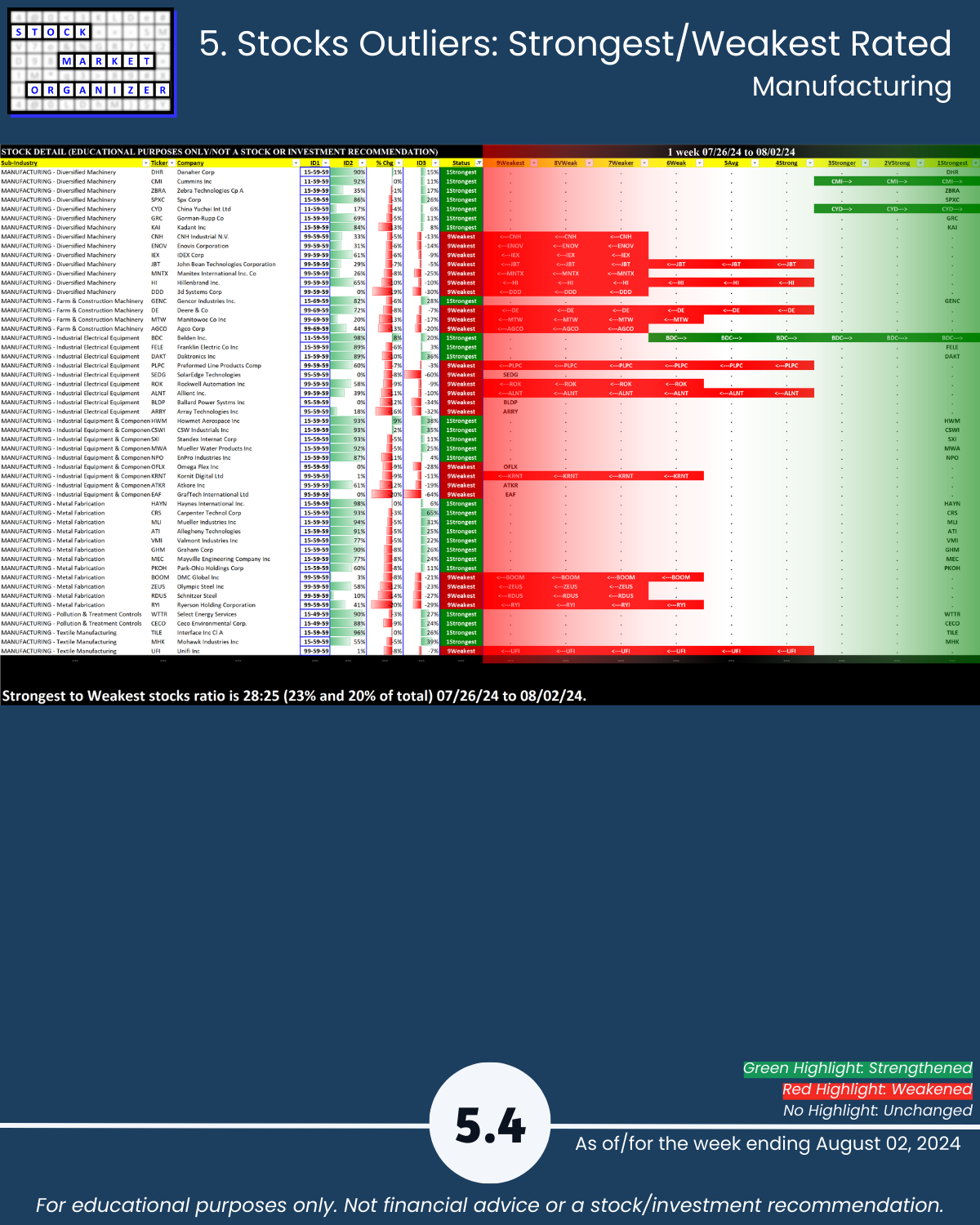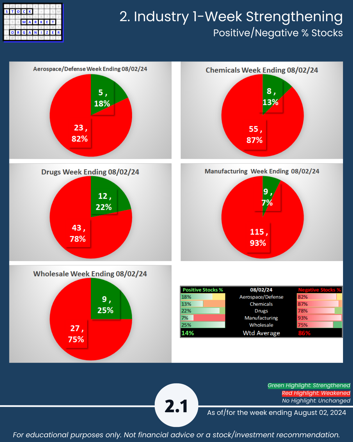 As the Nikkei goes through its biggest 2 day drop ever, here’s the 8/2/24 Stock Market Organizer Industry Group 3 strength report (Aerospace Defense, Chemicals, Drugs, Manufacturing, and Wholesale). Weakened slightly by -0.4 to a 4.7 weighted average strength rating. Much more detail in the attached including a segmenting by sub-industry of the Strongest and Weakest (in Stock Market Organizer parlance) stocks.