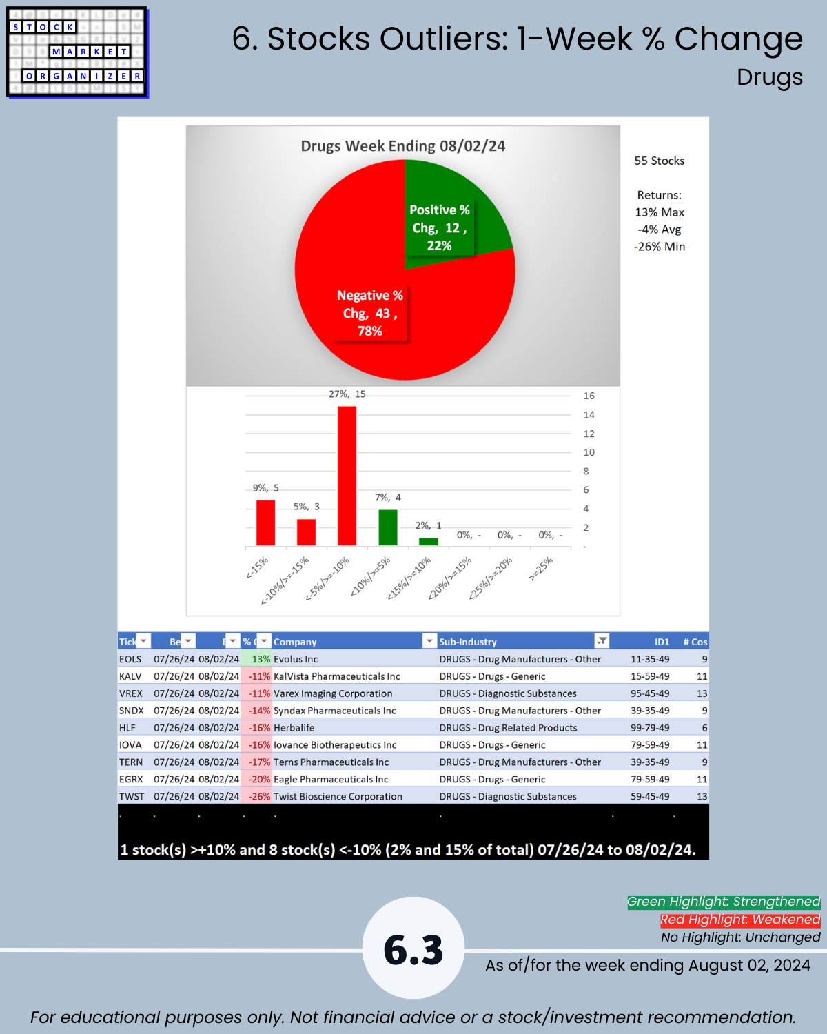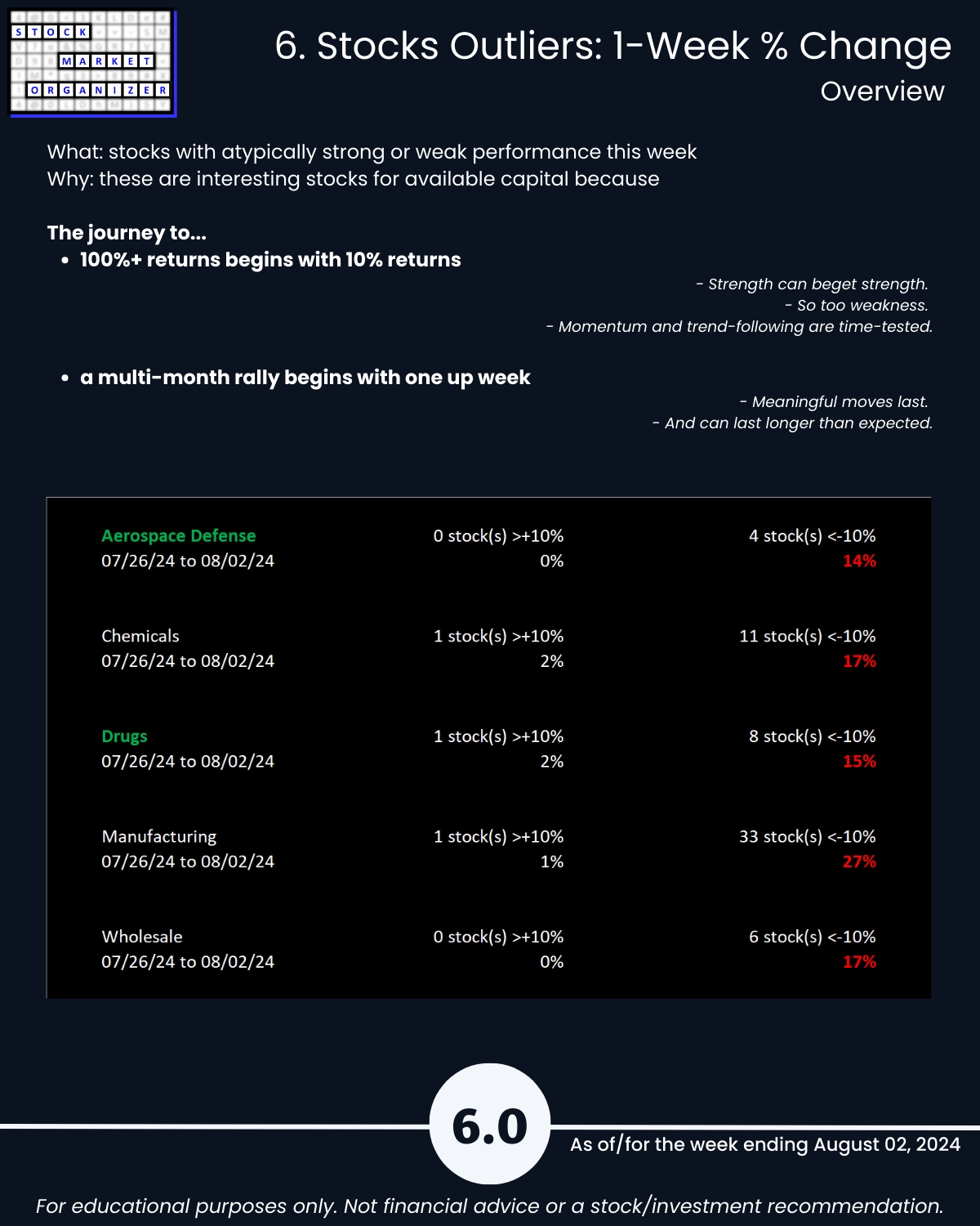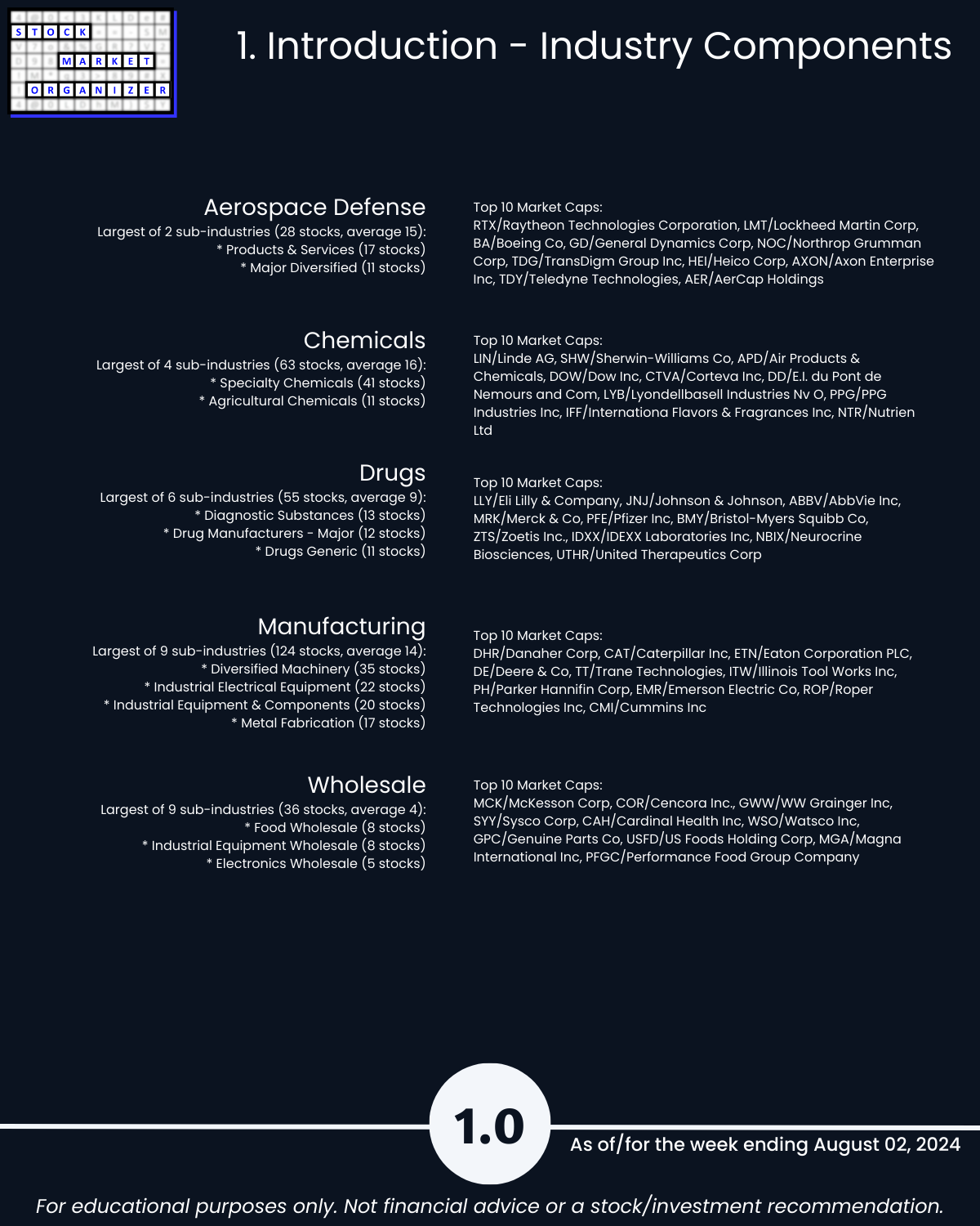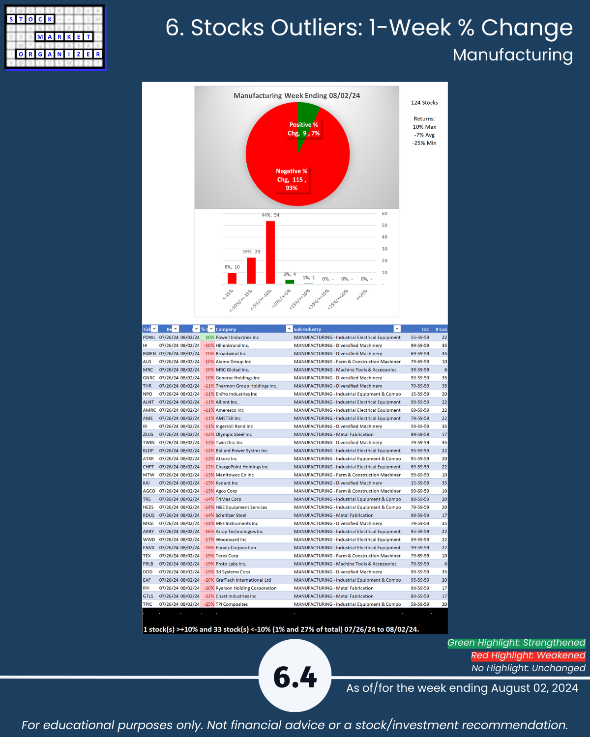 As the Nikkei goes through its biggest 2 day drop ever, here’s the 8/2/24 Stock Market Organizer Industry Group 3 strength report (Aerospace Defense, Chemicals, Drugs, Manufacturing, and Wholesale). Weakened slightly by -0.4 to a 4.7 weighted average strength rating. Much more detail in the attached including a segmenting by sub-industry of the Strongest and Weakest (in Stock Market Organizer parlance) stocks.