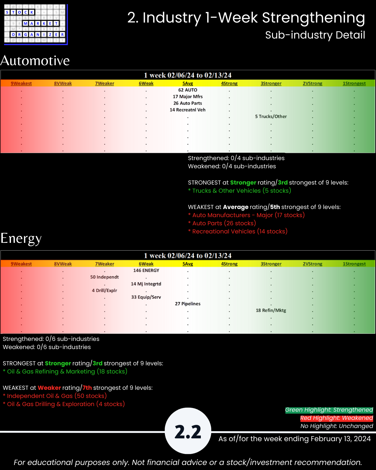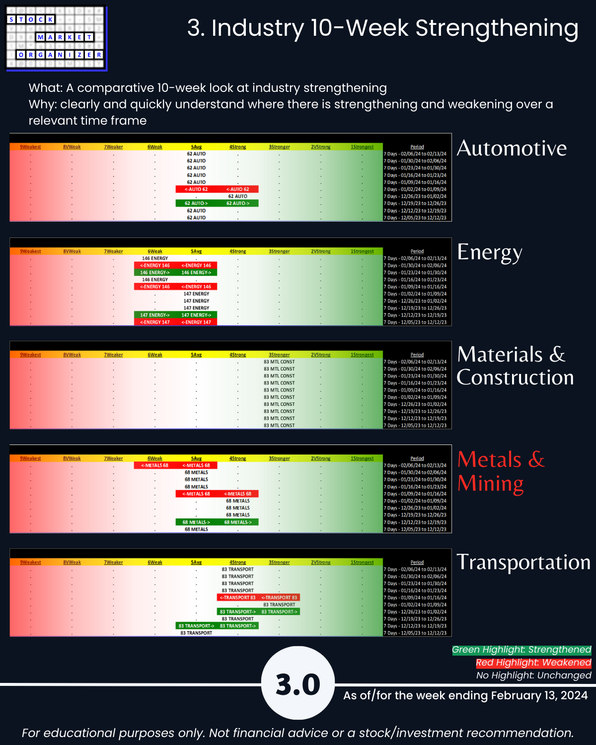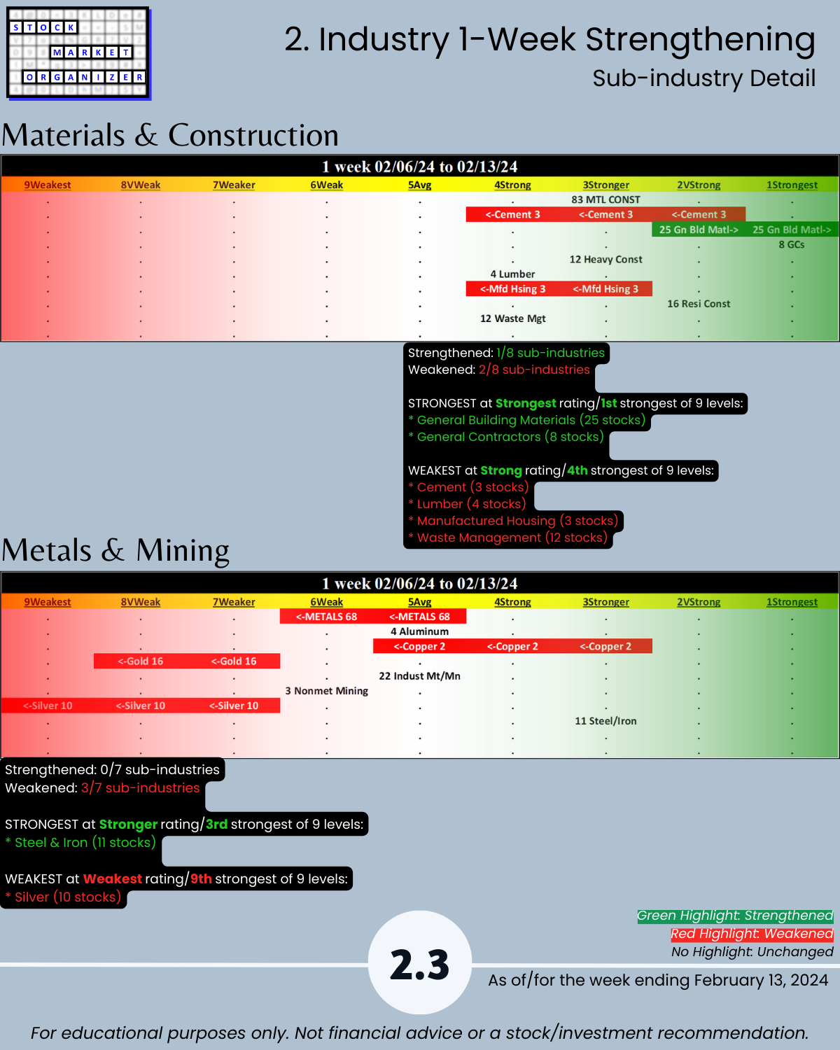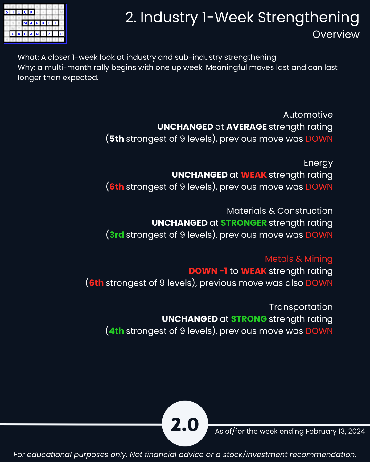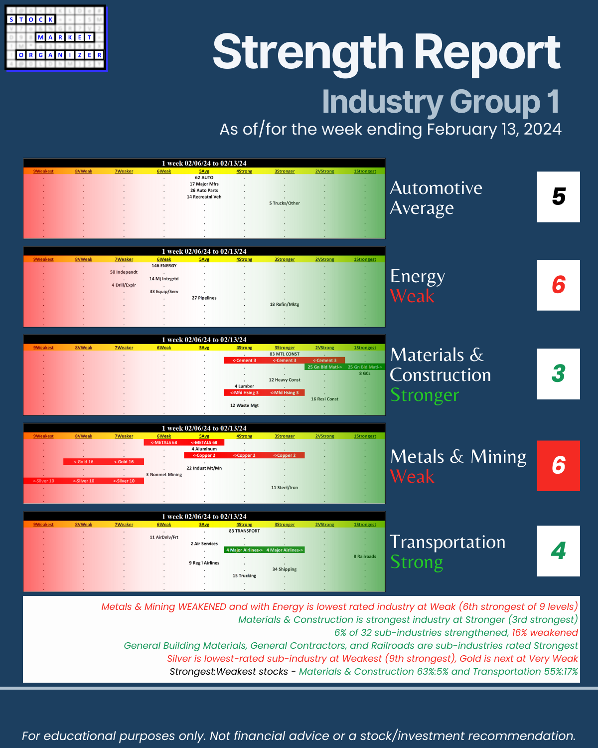 Including today’s 2/13/24 market gut punch (for longs) action, Metals & Mining industry WEAKENED to Weak (6th strongest of 9 levels) for the week ending 2/13/24. More detail below/attached for Automotive, Energy, Materials & Construction, Metals & Mining, and Transportation industries including Strongest-/Weakest-rated Stock Market Organizer stocks and objective strengthening/weakening measurements.