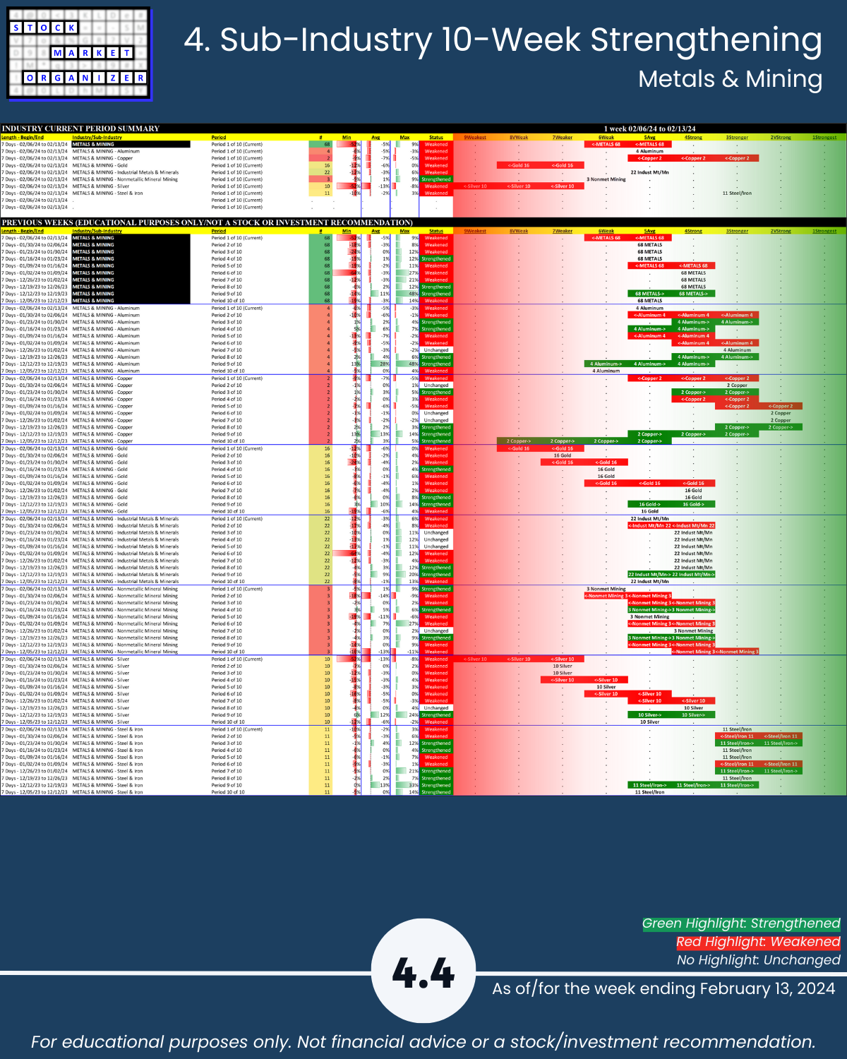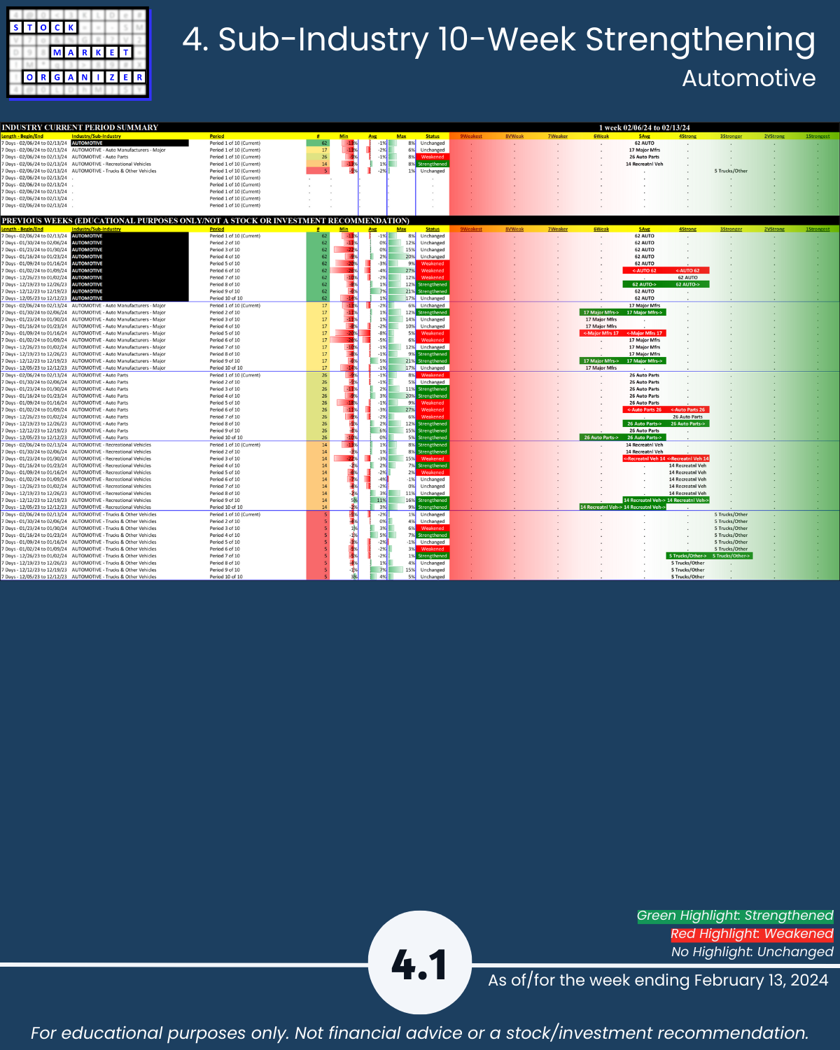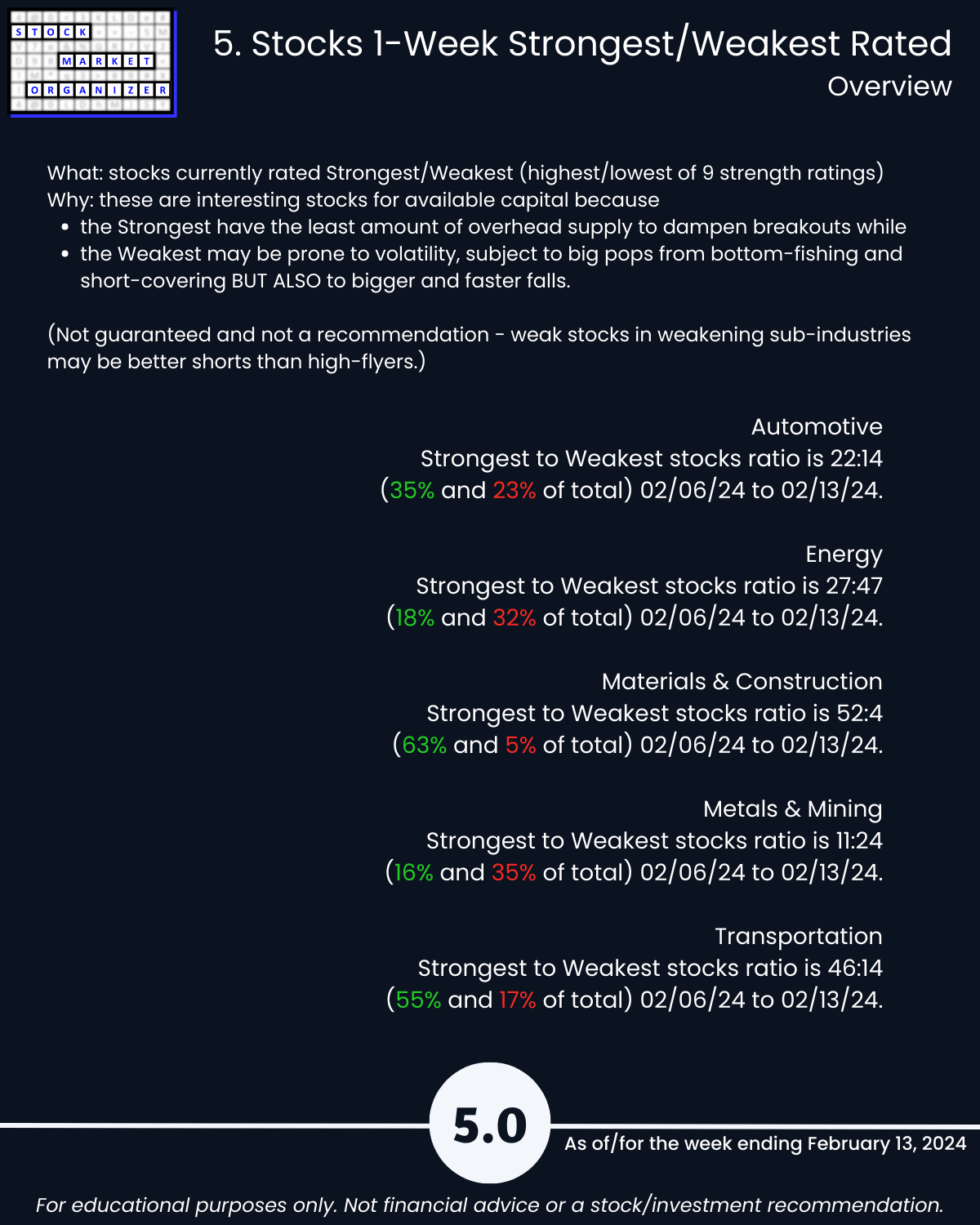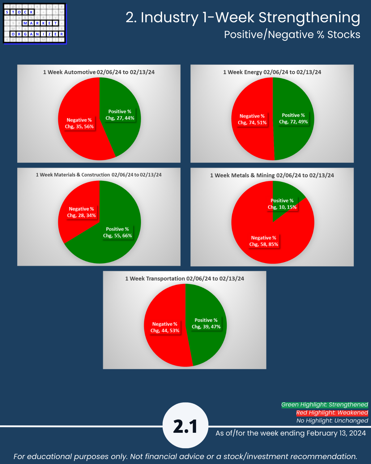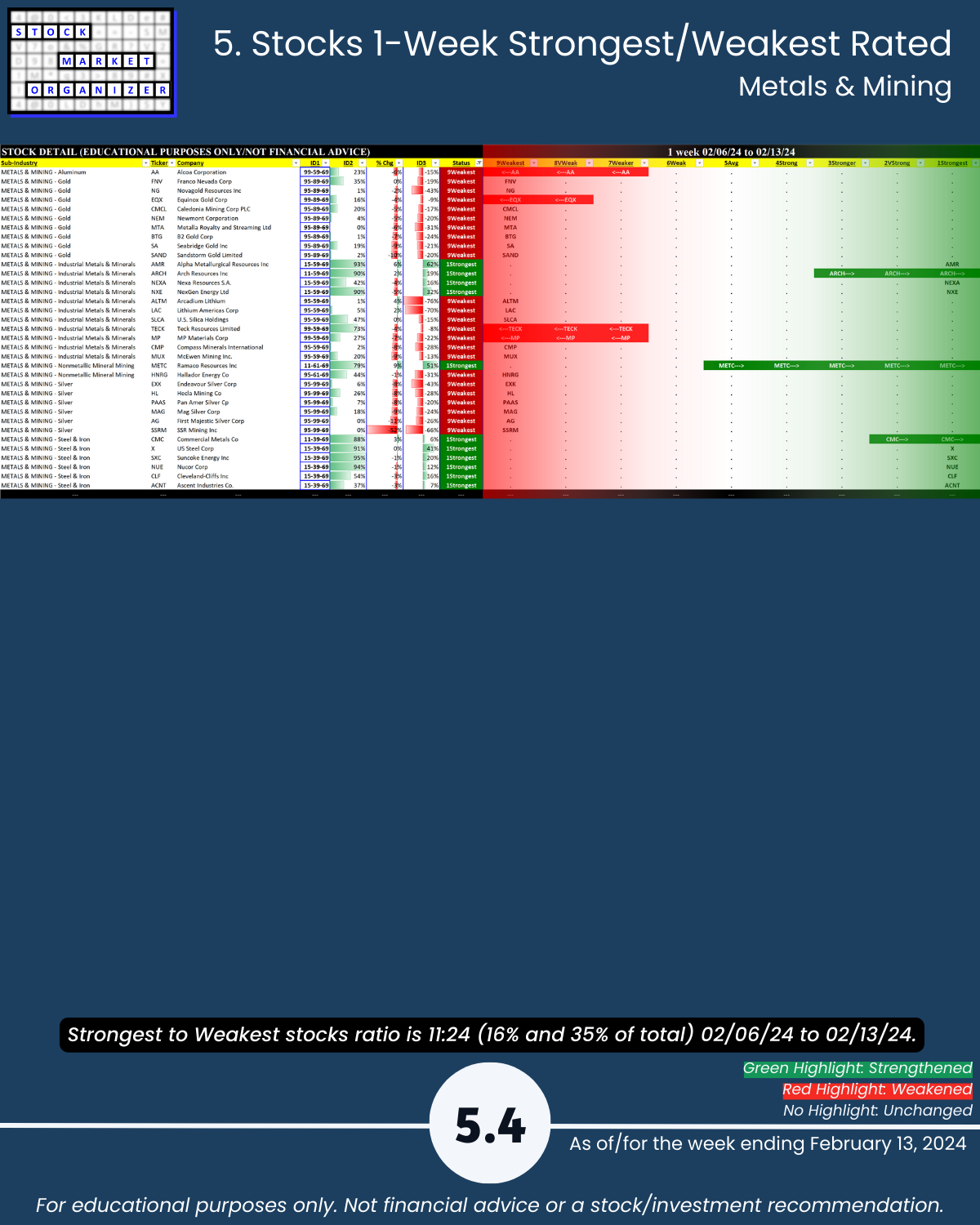 Including today’s 2/13/24 market gut punch (for longs) action, Metals & Mining industry WEAKENED to Weak (6th strongest of 9 levels) for the week ending 2/13/24. More detail below/attached for Automotive, Energy, Materials & Construction, Metals & Mining, and Transportation industries including Strongest-/Weakest-rated Stock Market Organizer stocks and objective strengthening/weakening measurements.
