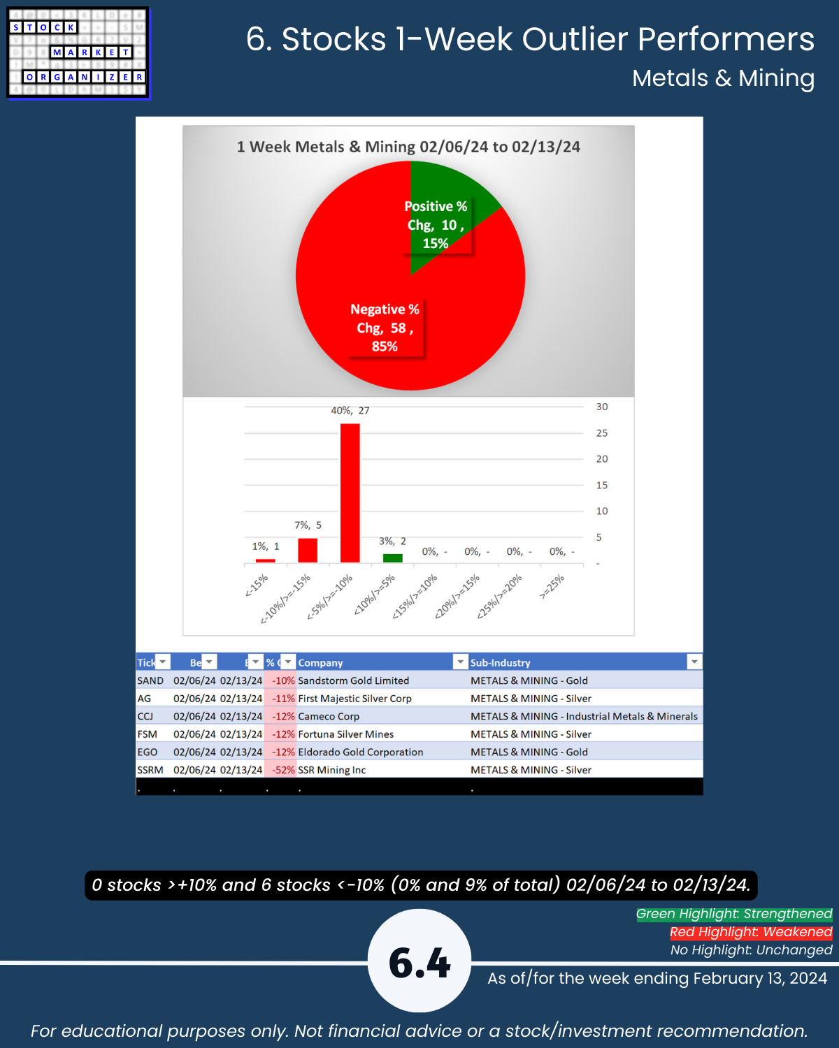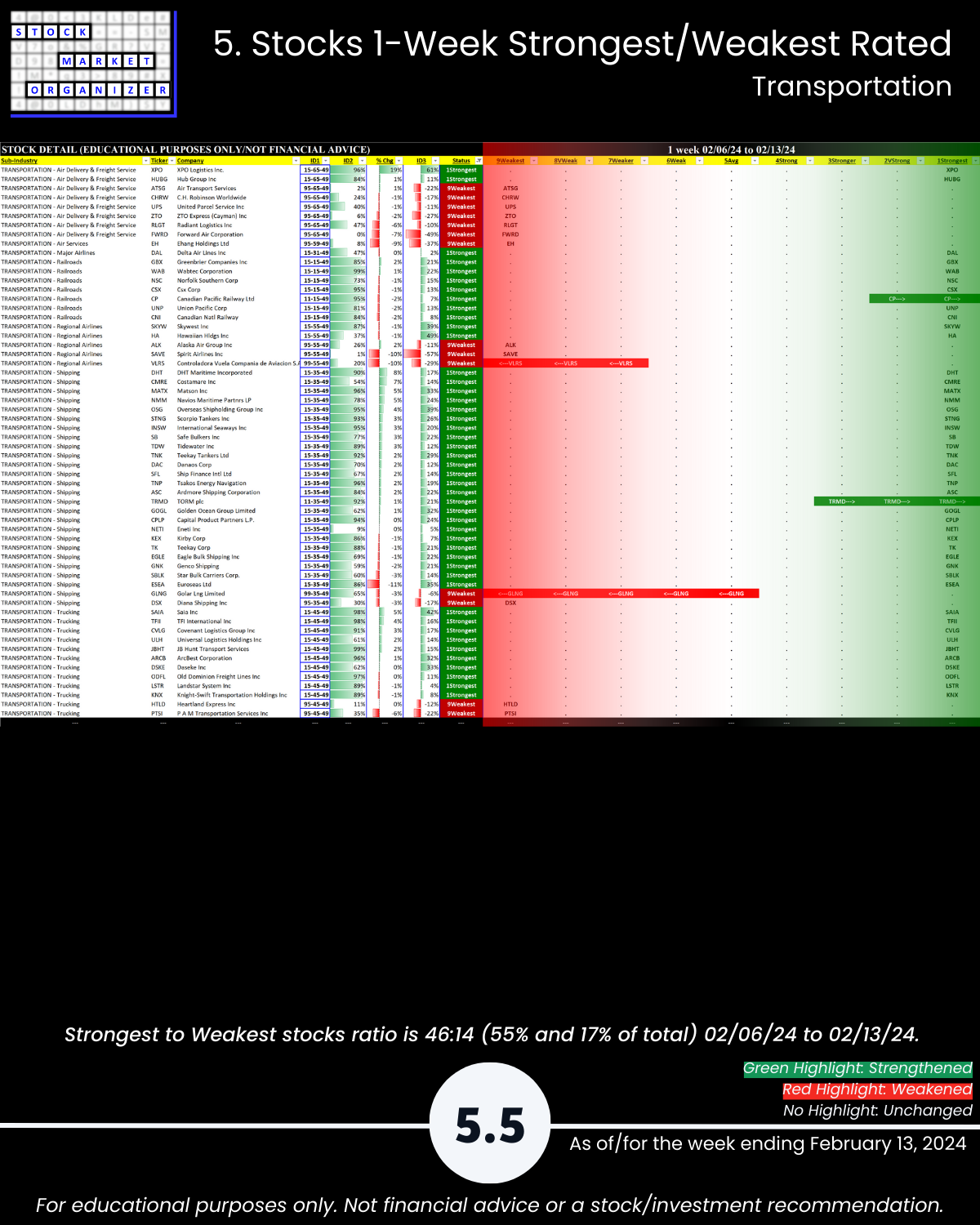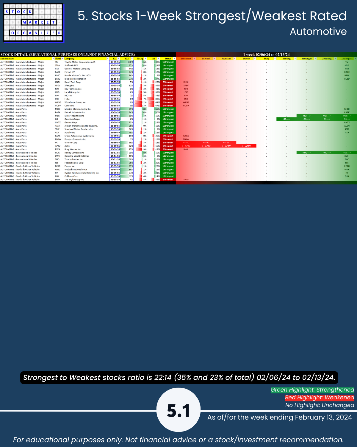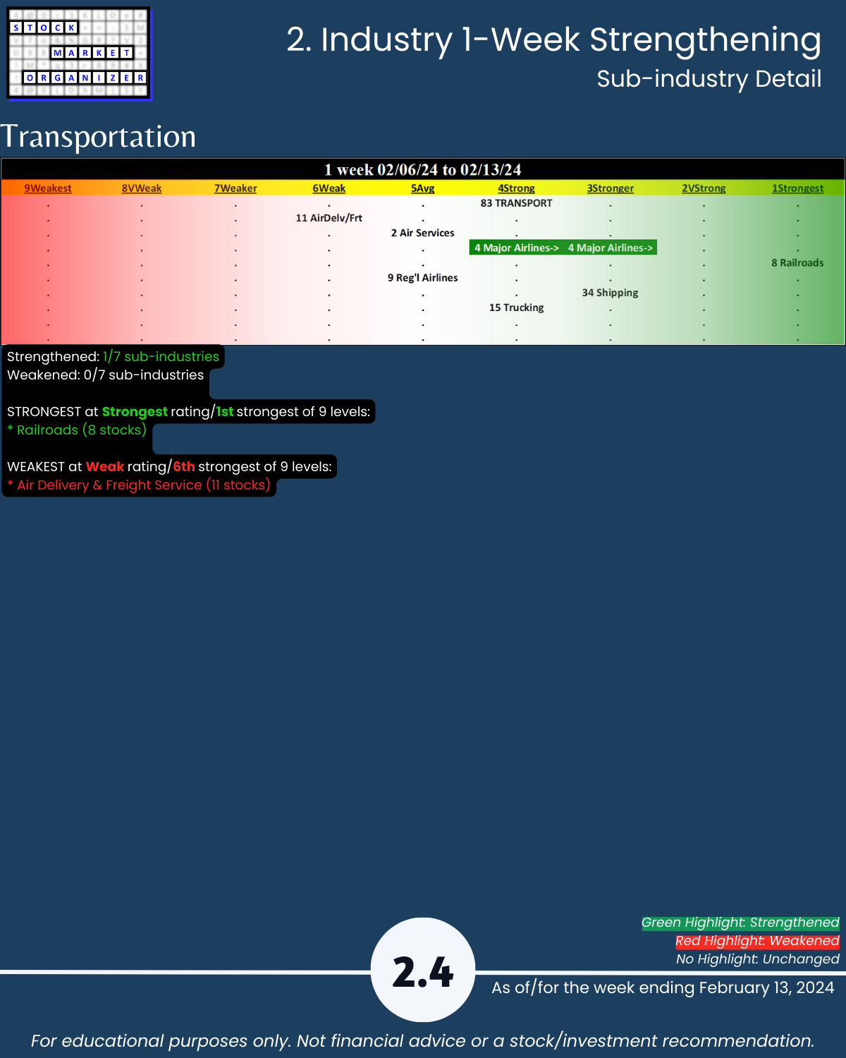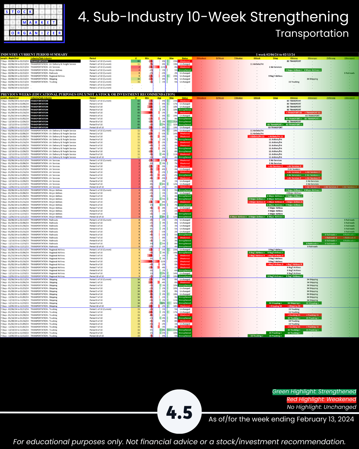 Including today’s 2/13/24 market gut punch (for longs) action, Metals & Mining industry WEAKENED to Weak (6th strongest of 9 levels) for the week ending 2/13/24. More detail below/attached for Automotive, Energy, Materials & Construction, Metals & Mining, and Transportation industries including Strongest-/Weakest-rated Stock Market Organizer stocks and objective strengthening/weakening measurements.
