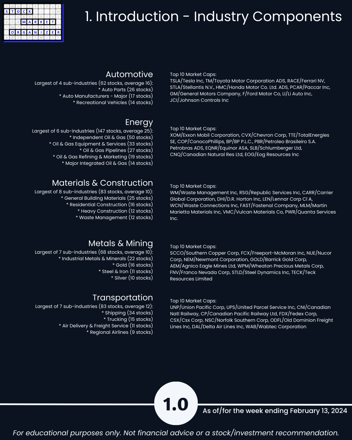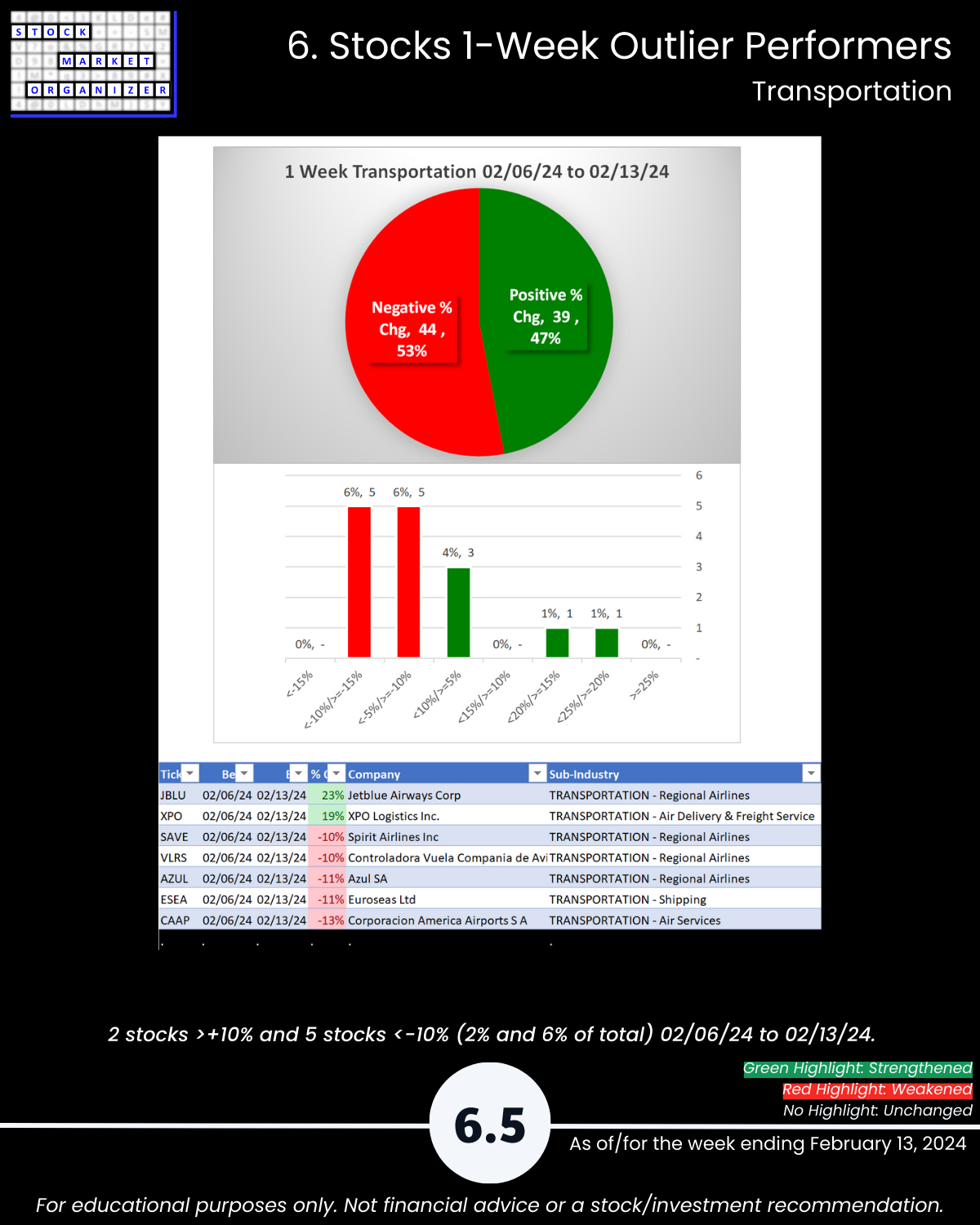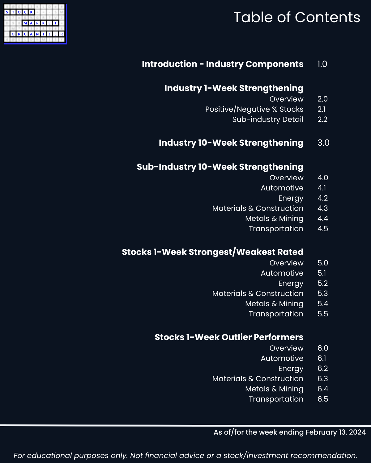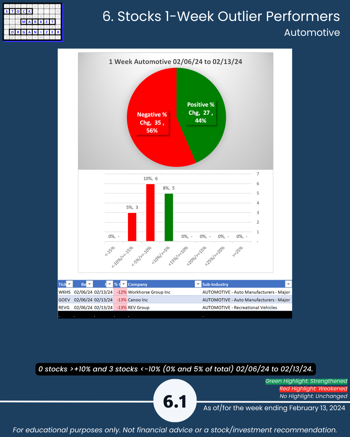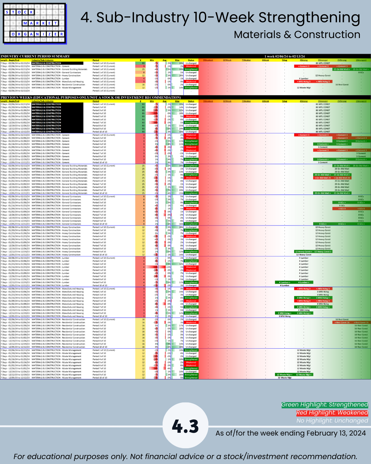 Including today’s 2/13/24 market gut punch (for longs) action, Metals & Mining industry WEAKENED to Weak (6th strongest of 9 levels) for the week ending 2/13/24. More detail below/attached for Automotive, Energy, Materials & Construction, Metals & Mining, and Transportation industries including Strongest-/Weakest-rated Stock Market Organizer stocks and objective strengthening/weakening measurements.